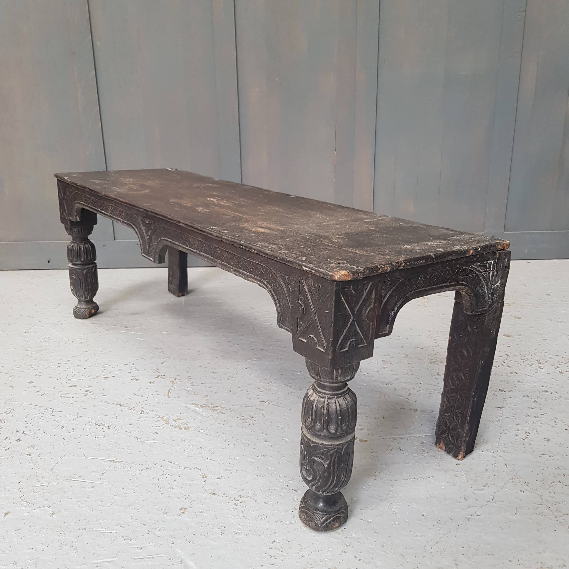 1600 – 1620 Old Oak English Bench, pre-civil war.  Plenty of splits, marks and some repairs and replacements.  However, perfectly usable and, after four hundred years, can only get better now.  Gadroons on front baluster legs and guilloche designs elsewhere.
