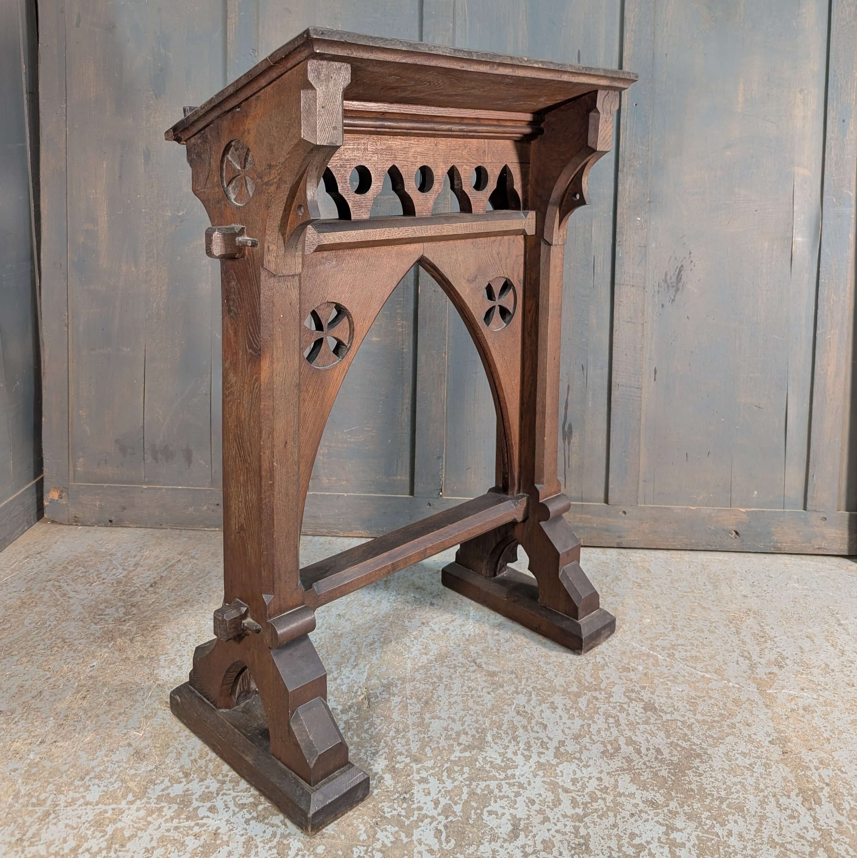 Our product shown on this page 1860’s Gothic Detailed Oak Ambo Reading Desk Lectern from St Giles Darlton (SOLD) is currently available for hire.
