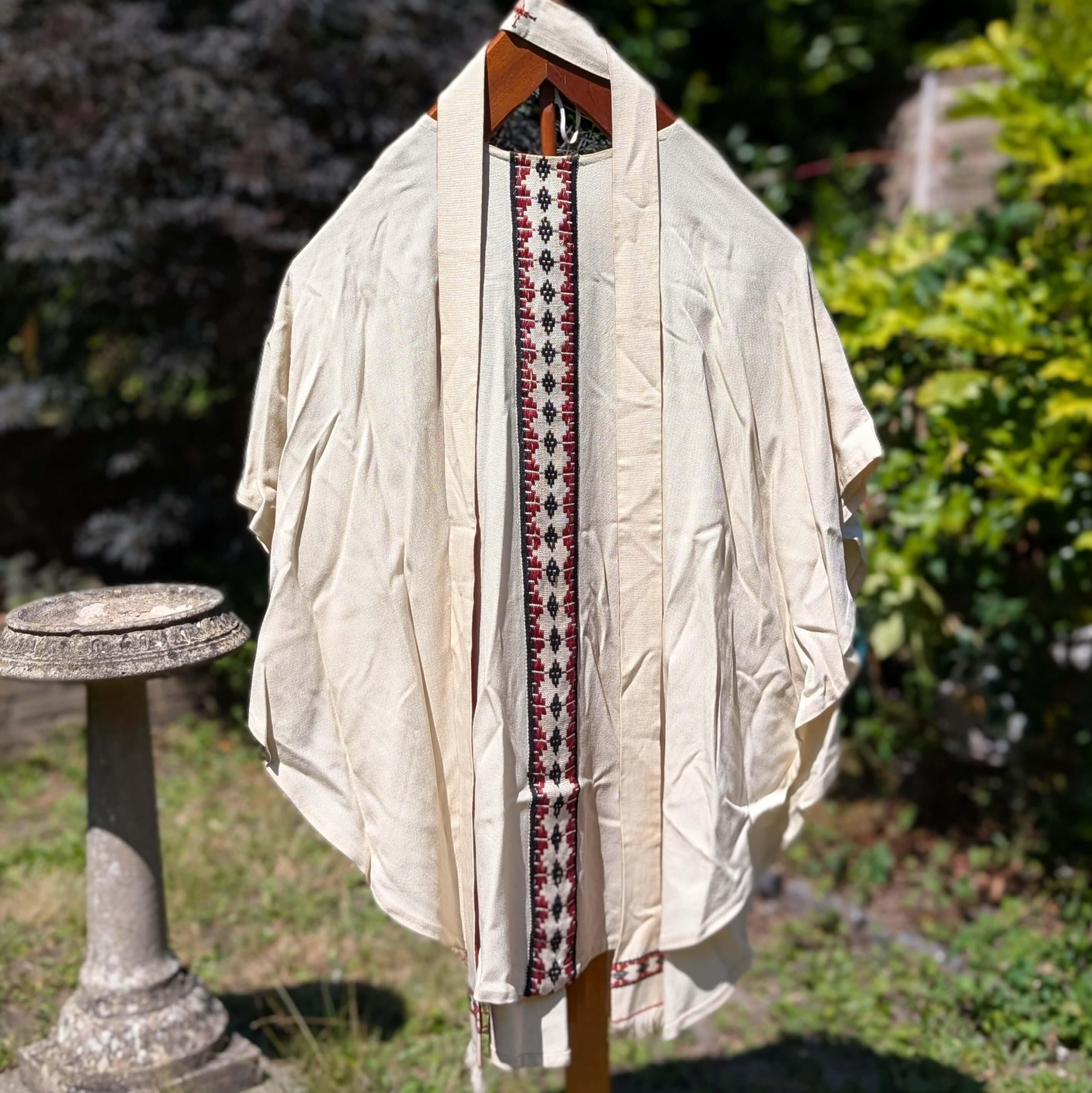 Our product shown on this page ‘1970’s Socialist’ Linen with Simple Pattern Chasuble with Stole is currently available for hire.