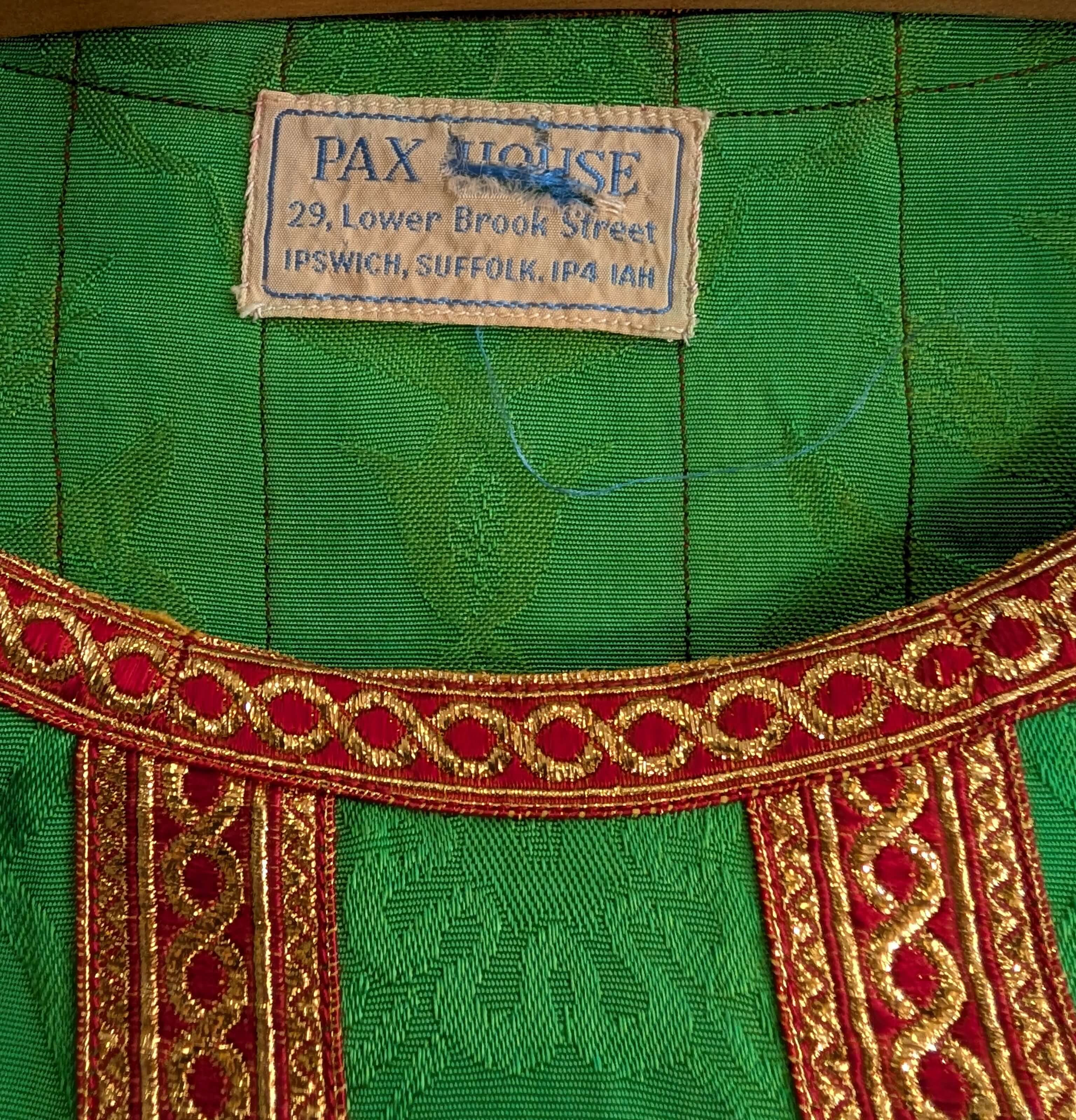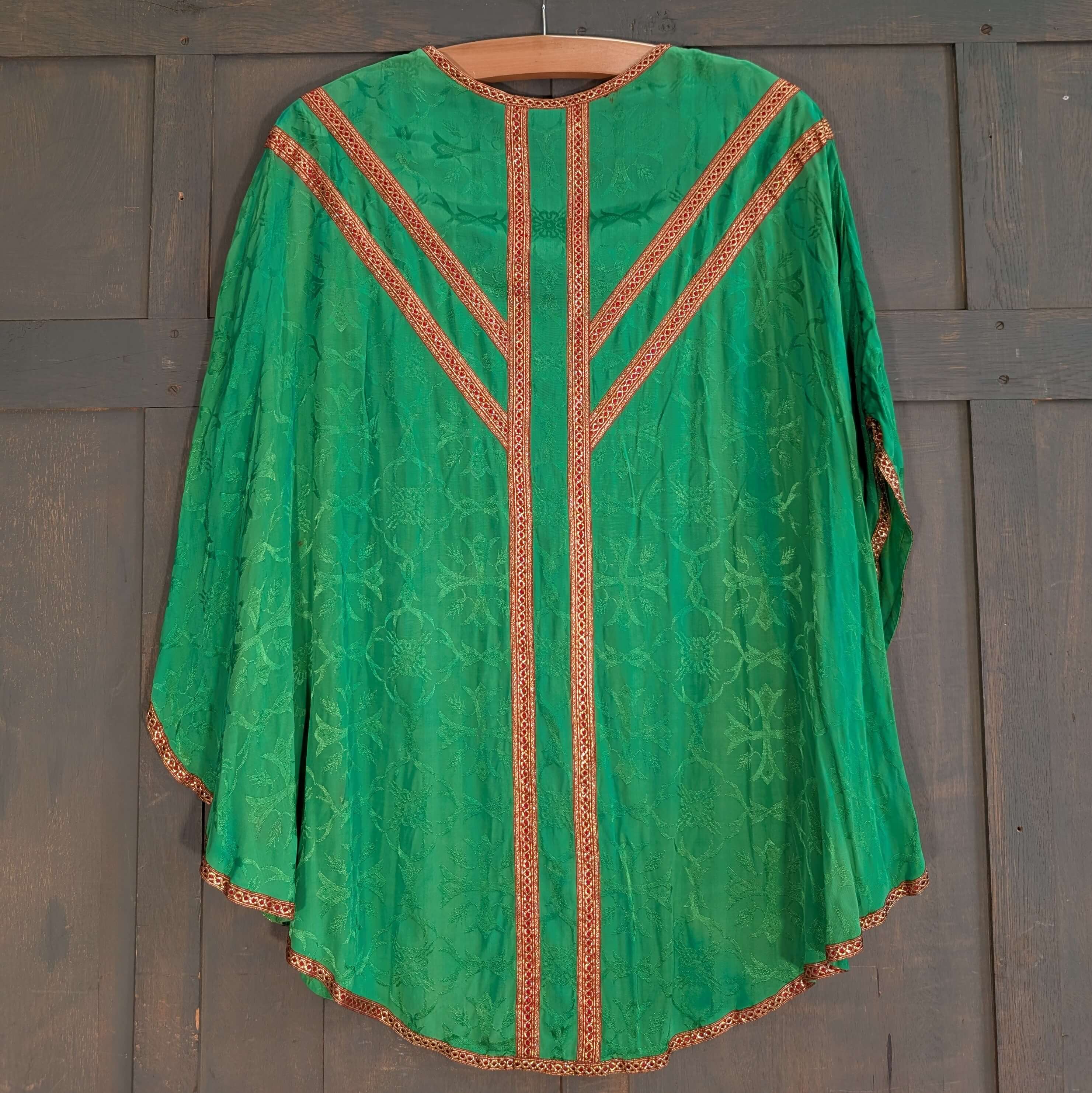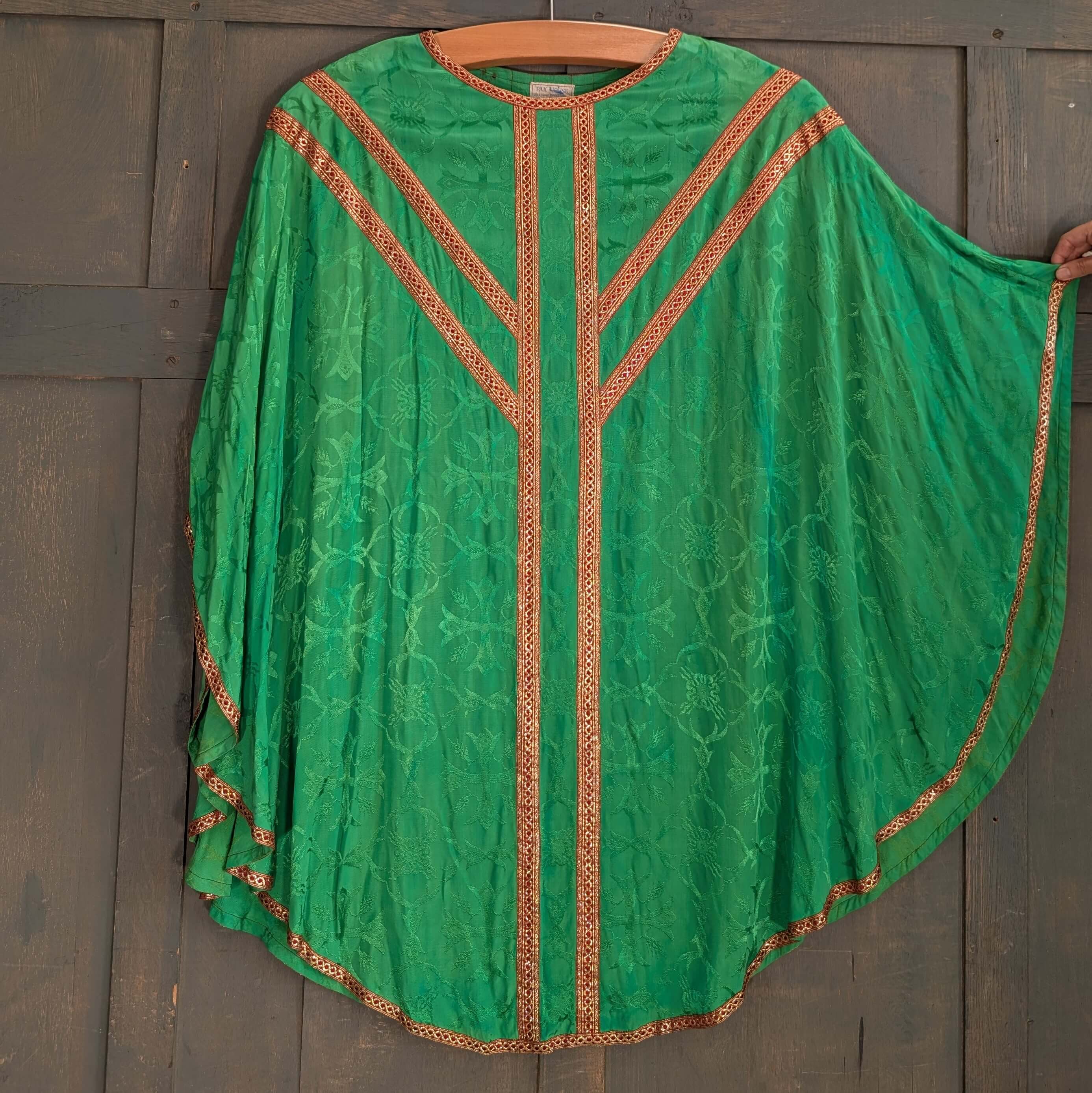 Our product shown on this page 1970’s Vintage Bright Green Chasuble with Red Gold Orphreys is currently available for hire.