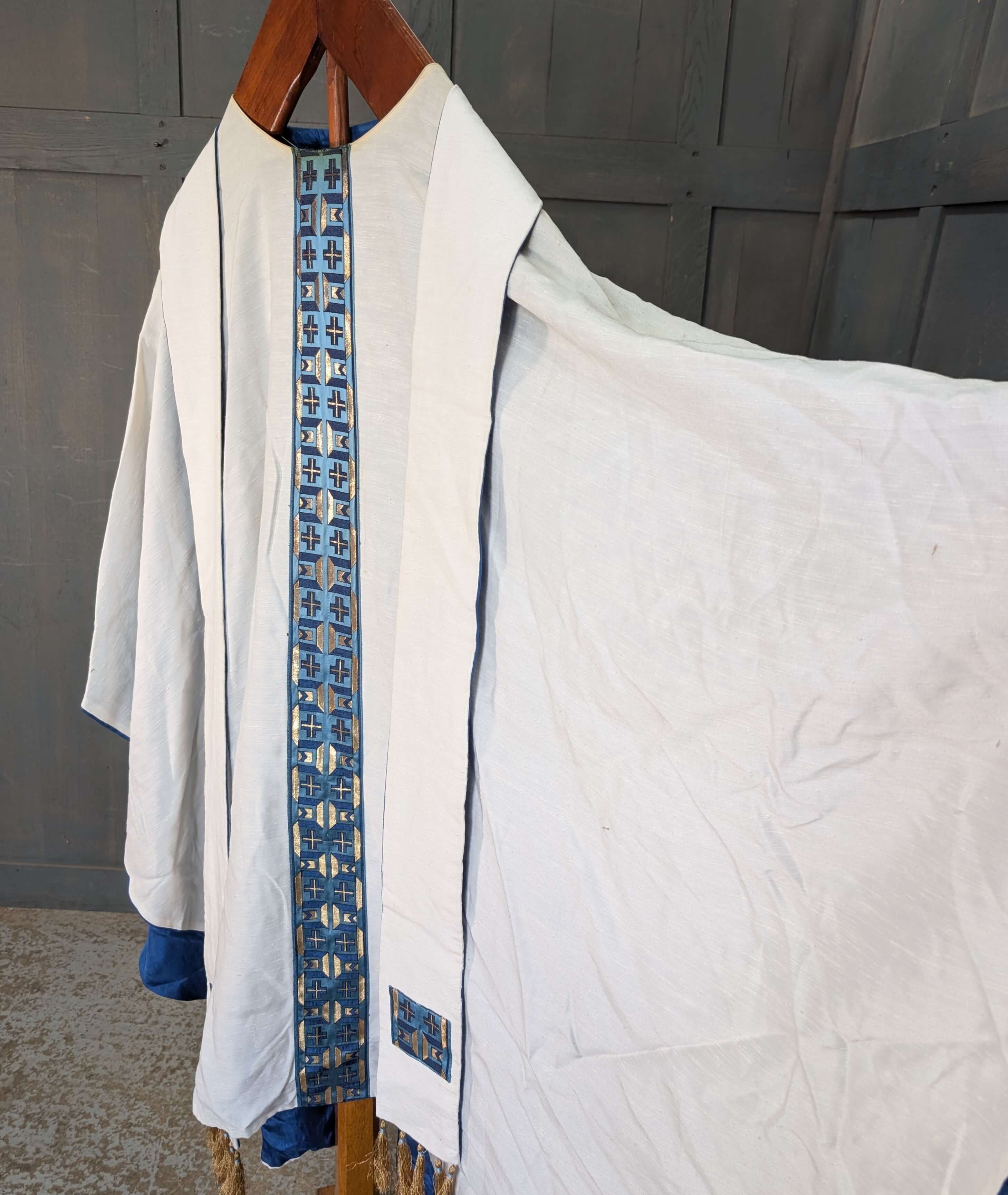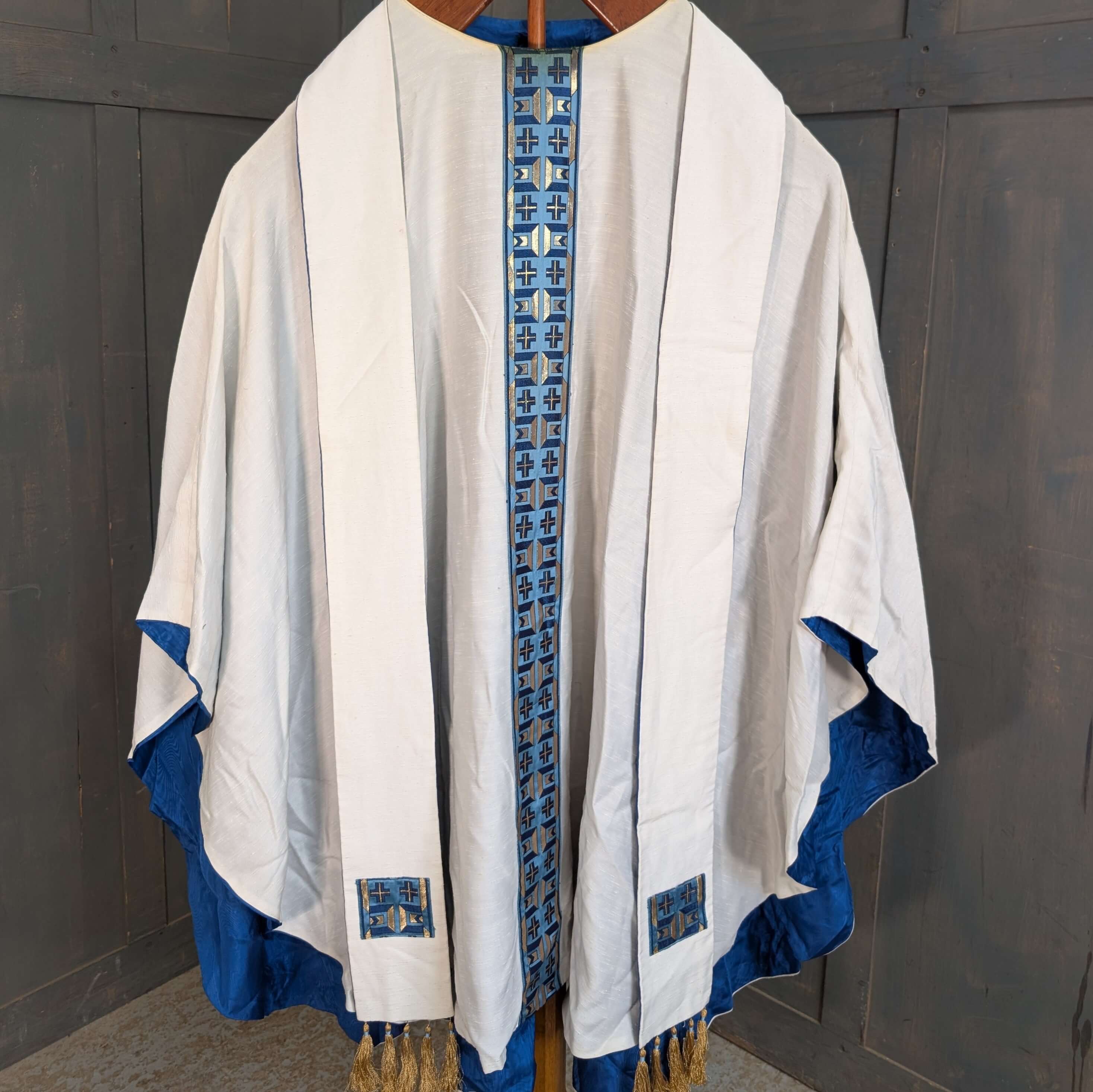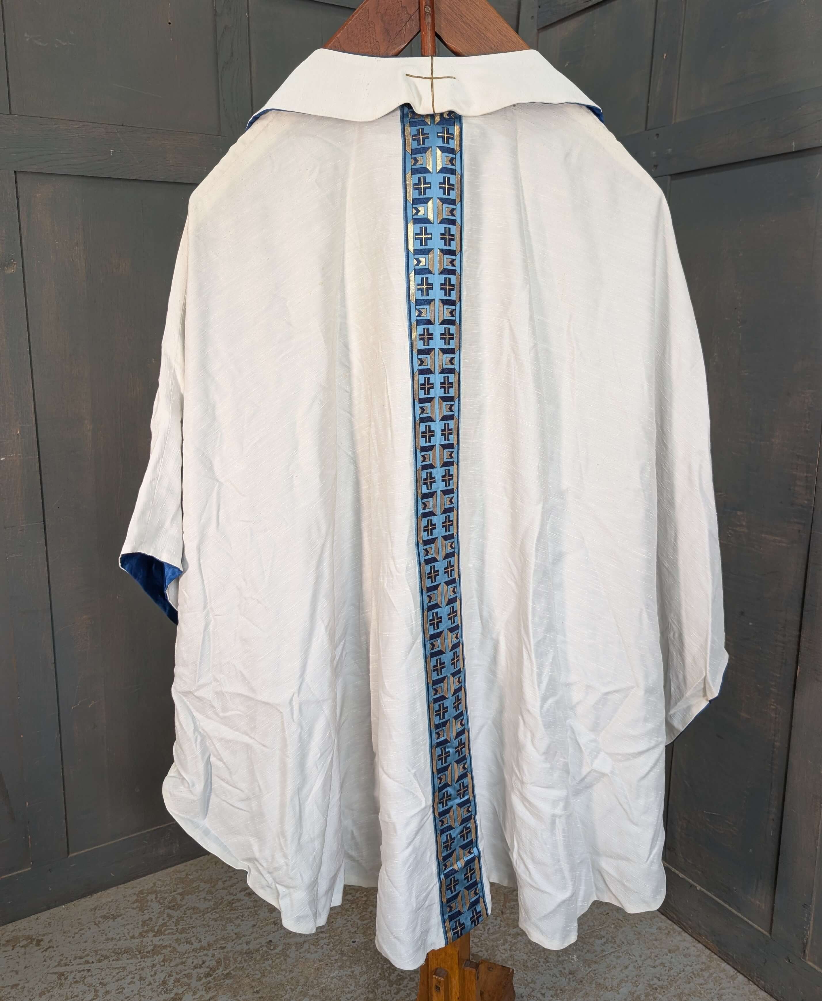 Our product shown on this page 1990’s Vintage White Slub Extra Large Chasuble with Blue Gold Orphrey & Stole is currently available for hire.