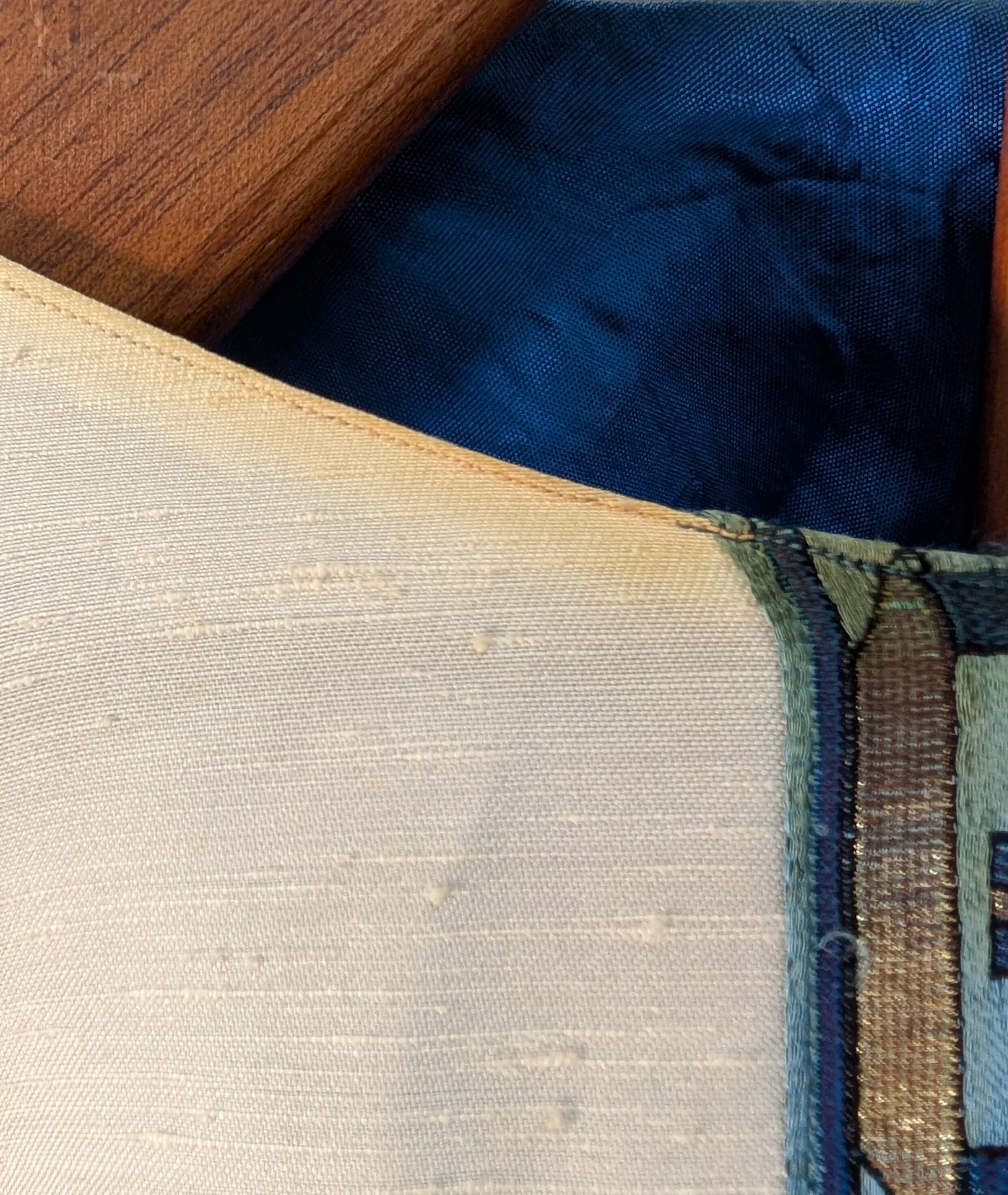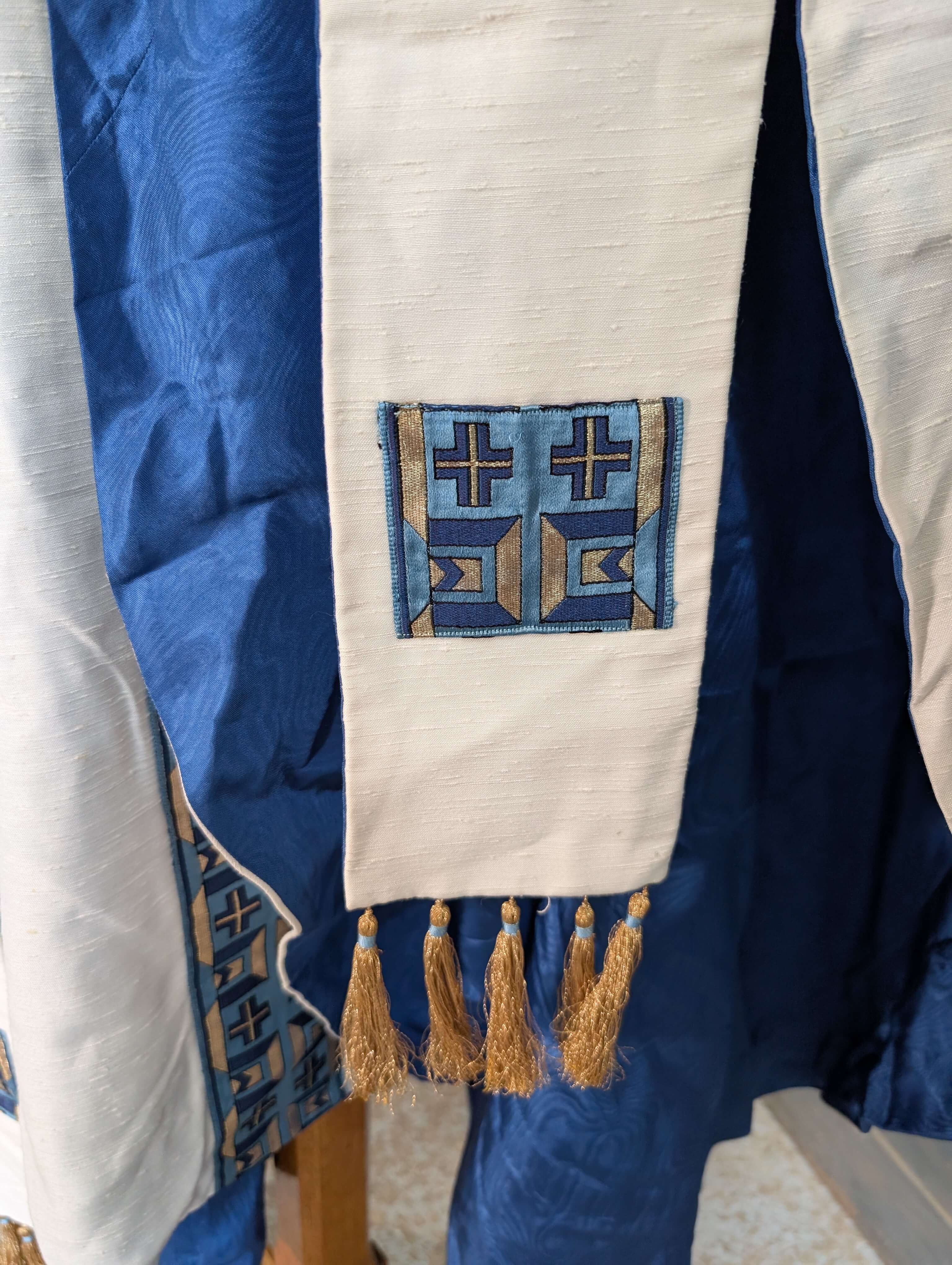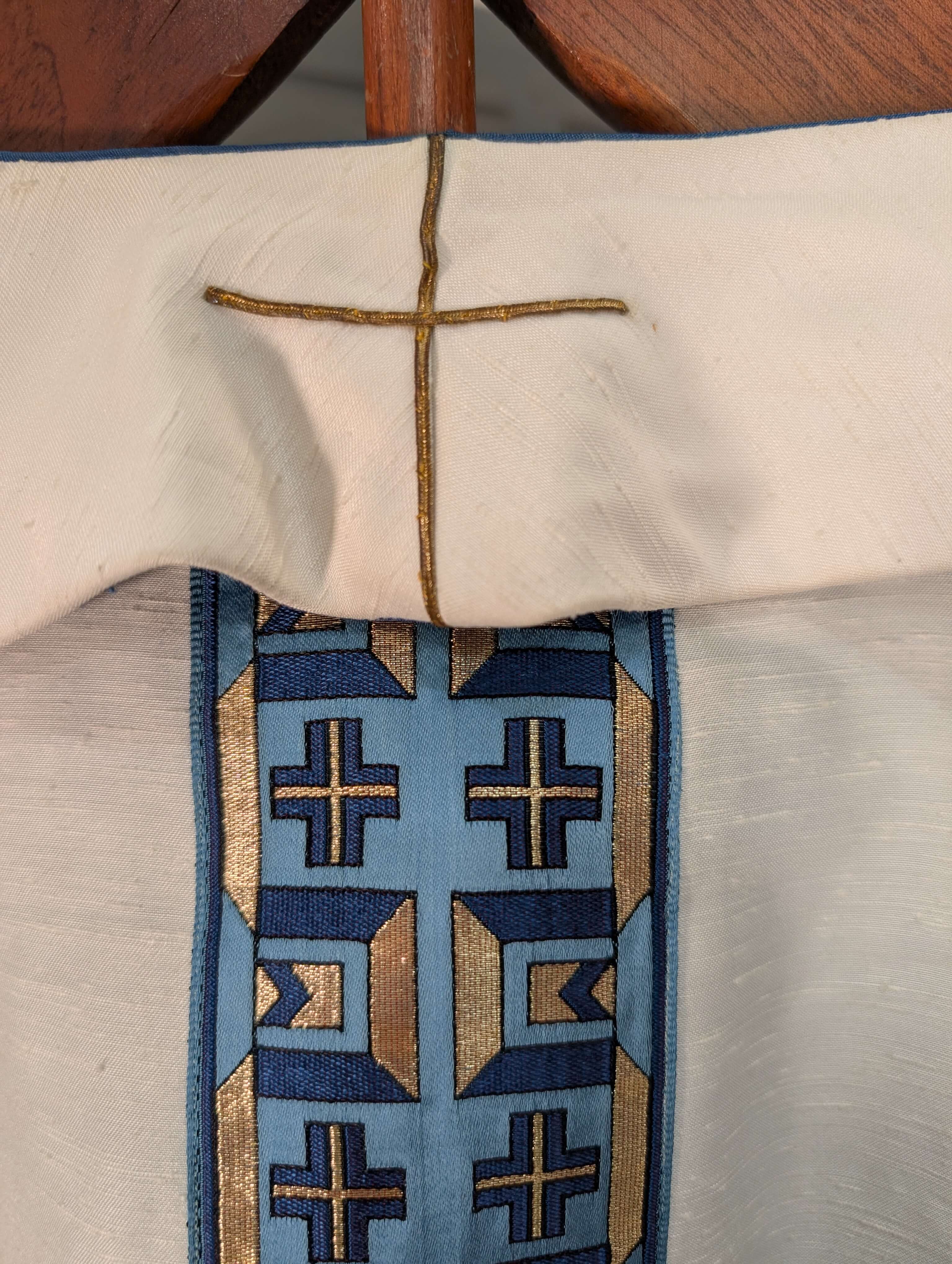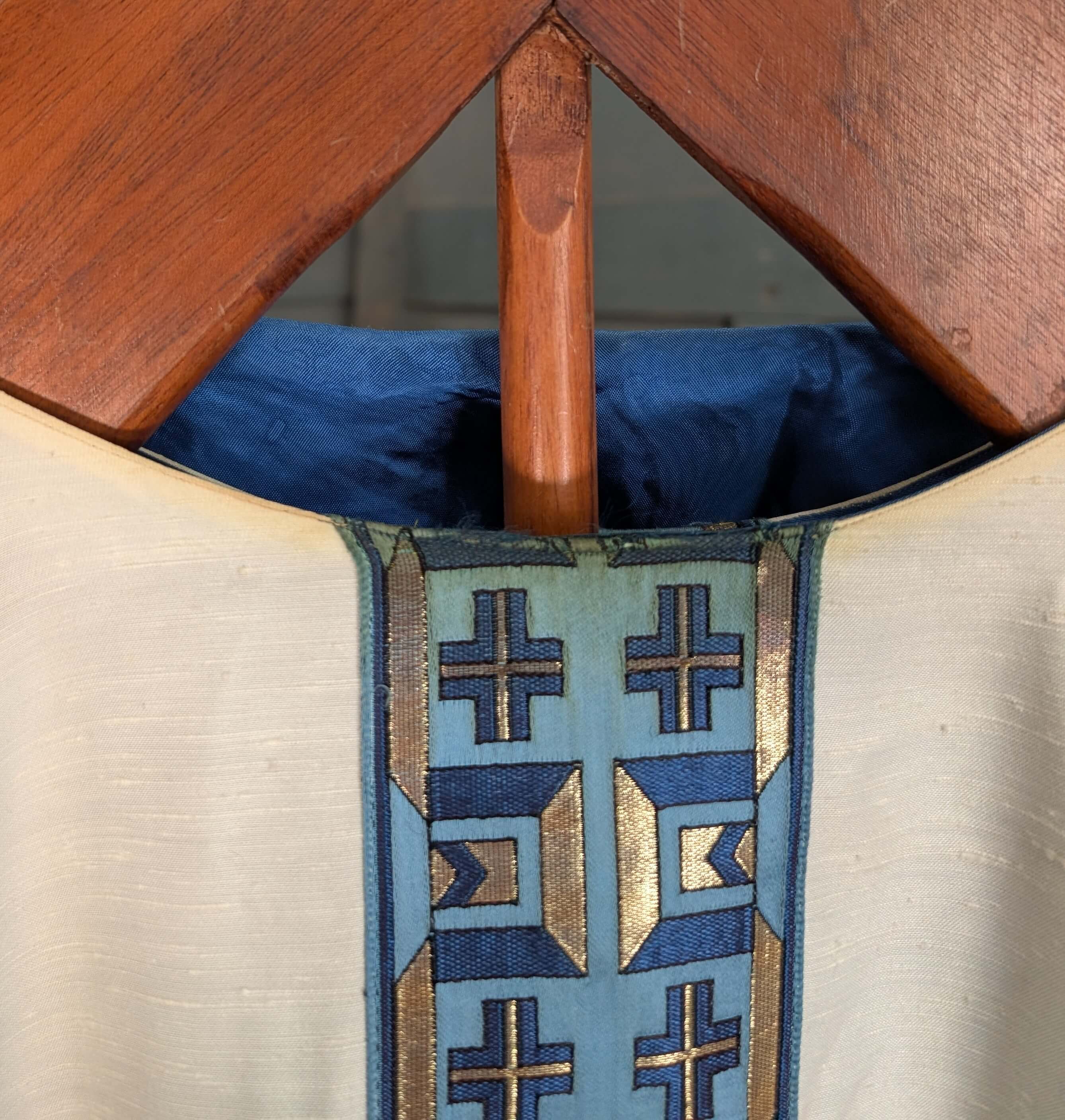 Our product shown on this page 1990’s Vintage White Slub Extra Large Chasuble with Blue Gold Orphrey & Stole is currently available for hire.