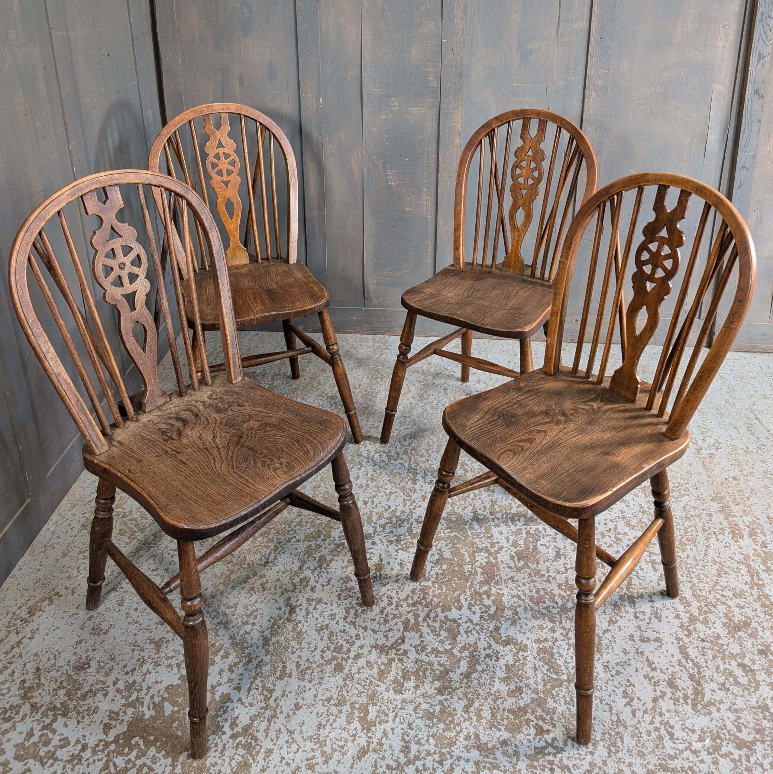 Our product shown on this page A Set of 4 Windsor Wheelback Elm and Beech Dining Chairs (SOLD) is currently available for hire.