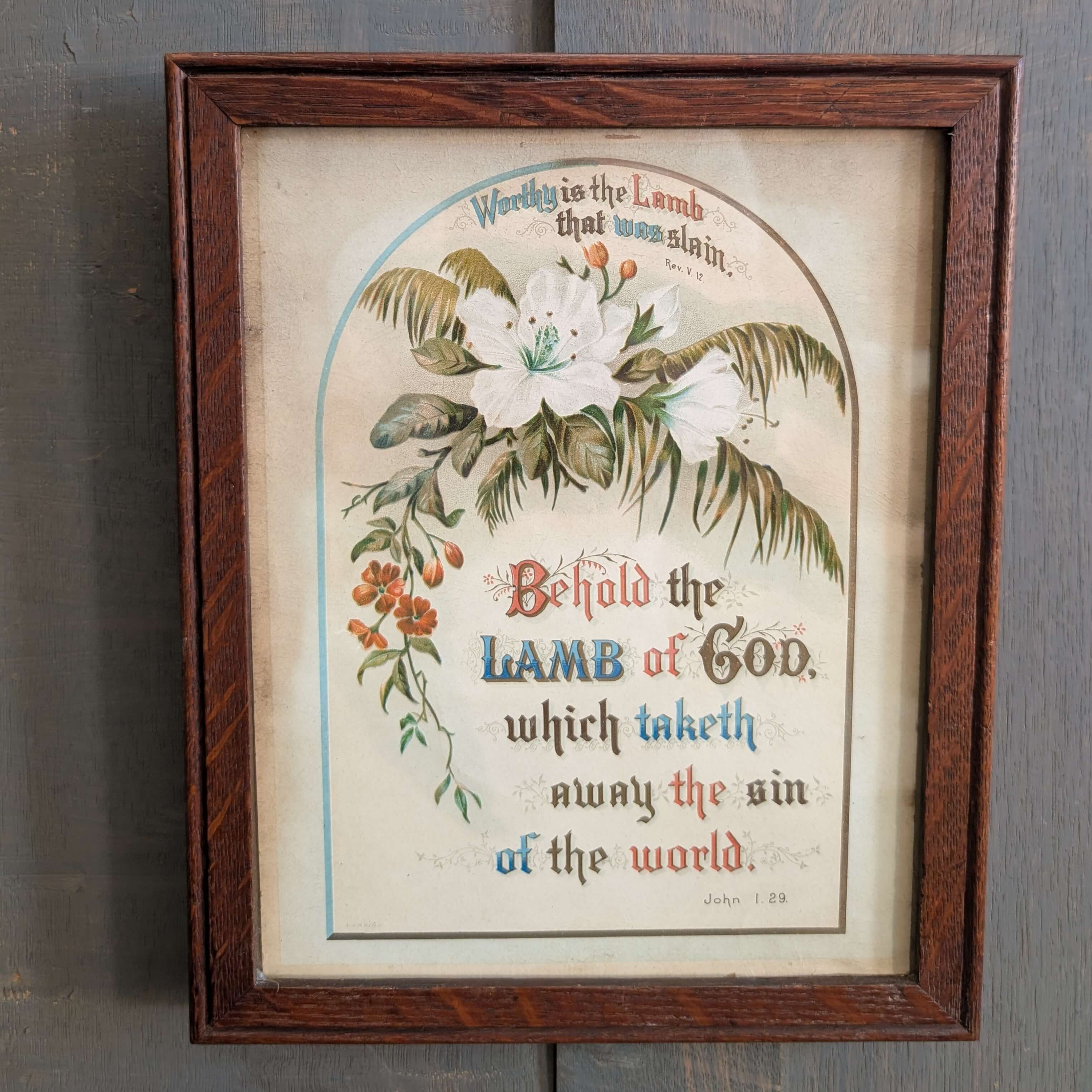 Our product shown on this page Antique 1900’s Bible Quotes ‘Worthy Is The Lamb That Was Slain’ (SOLD) is currently available for hire.