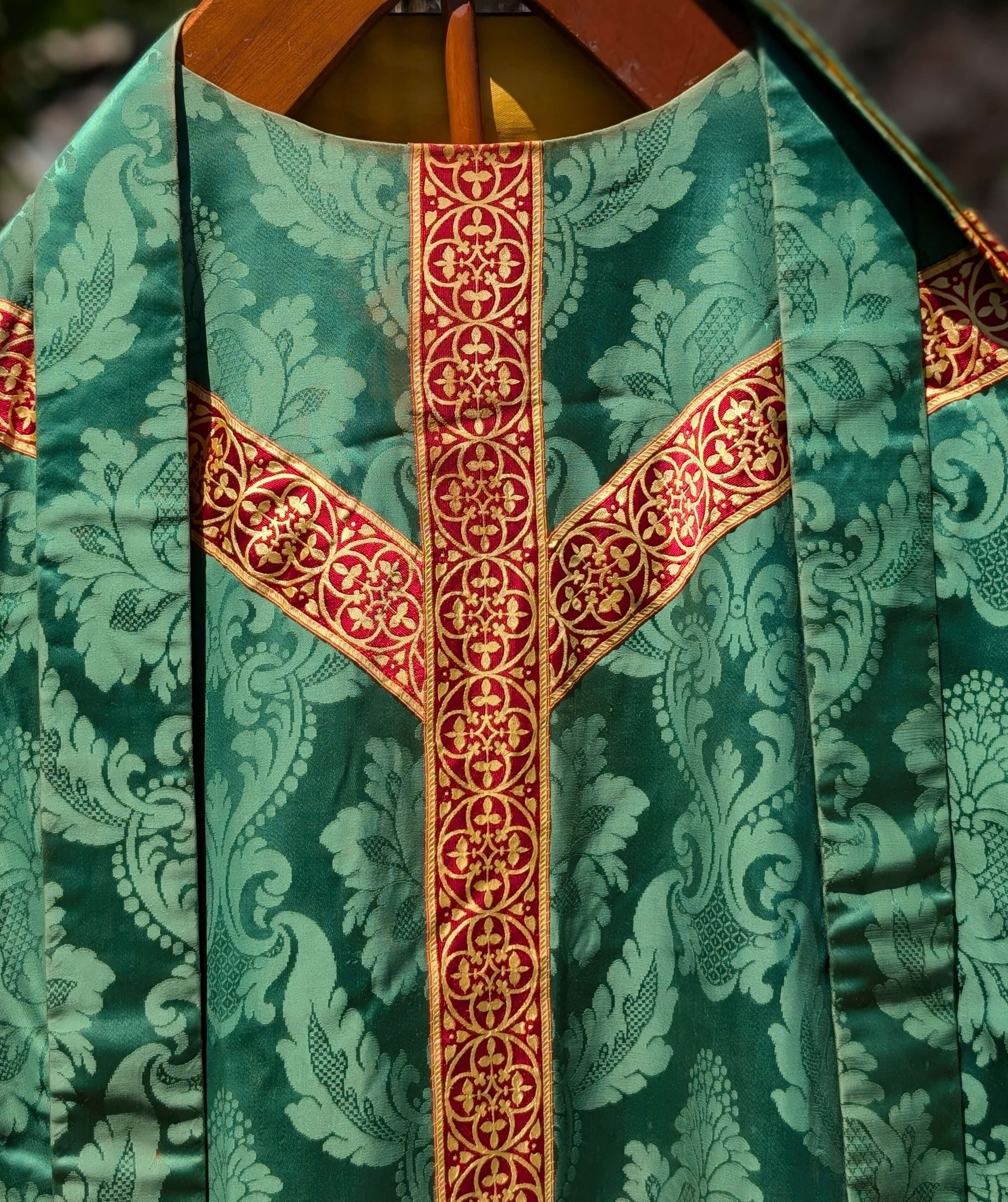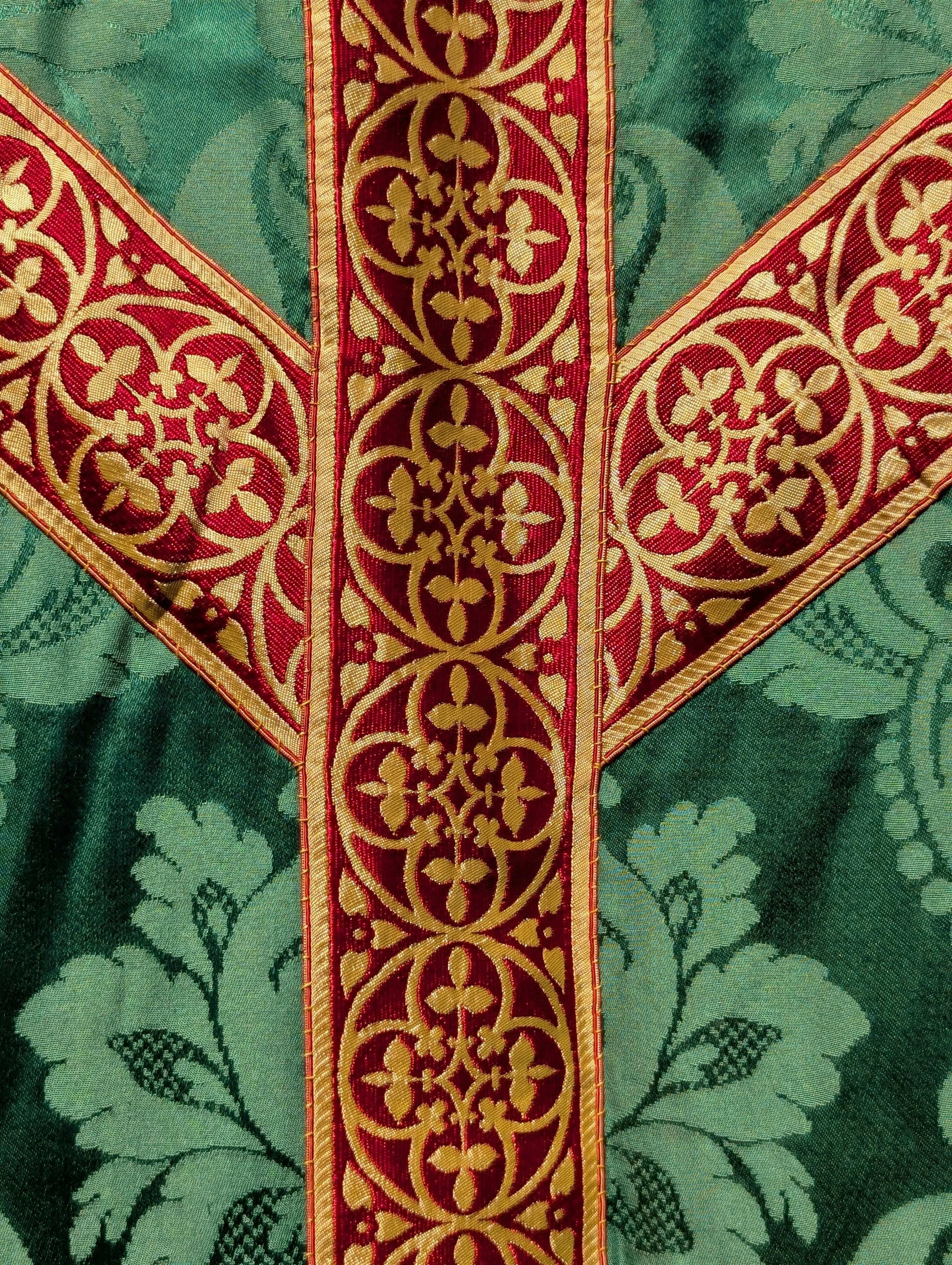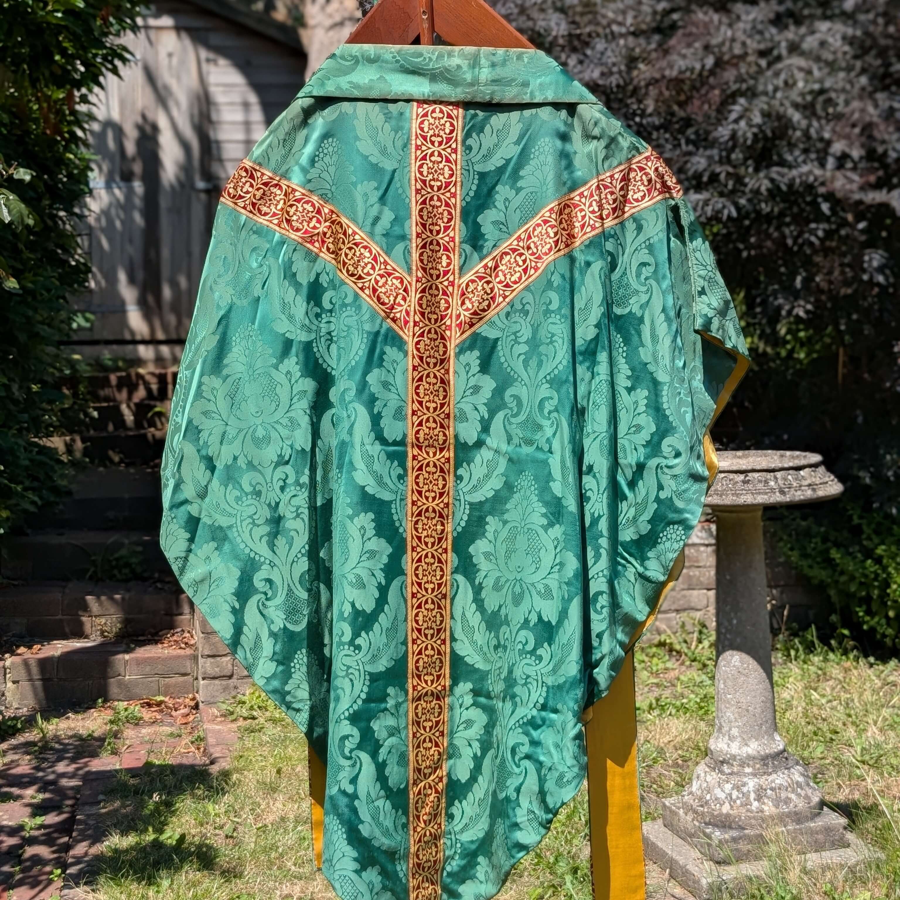 Our product shown on this page Attractive & Verdant Green Damask Silk Chasuble with Red Gold Orphreys & Stole is currently available for hire.