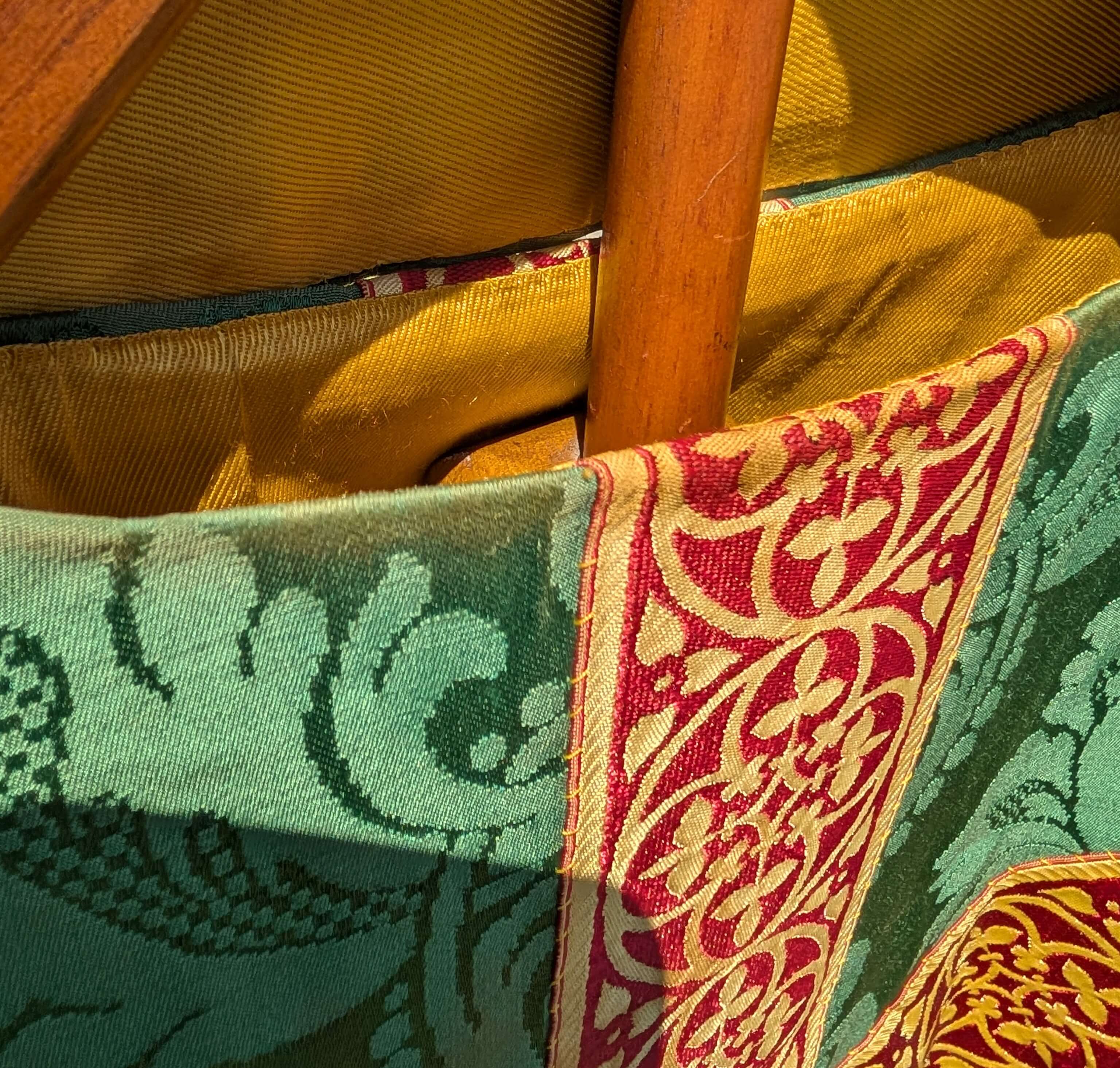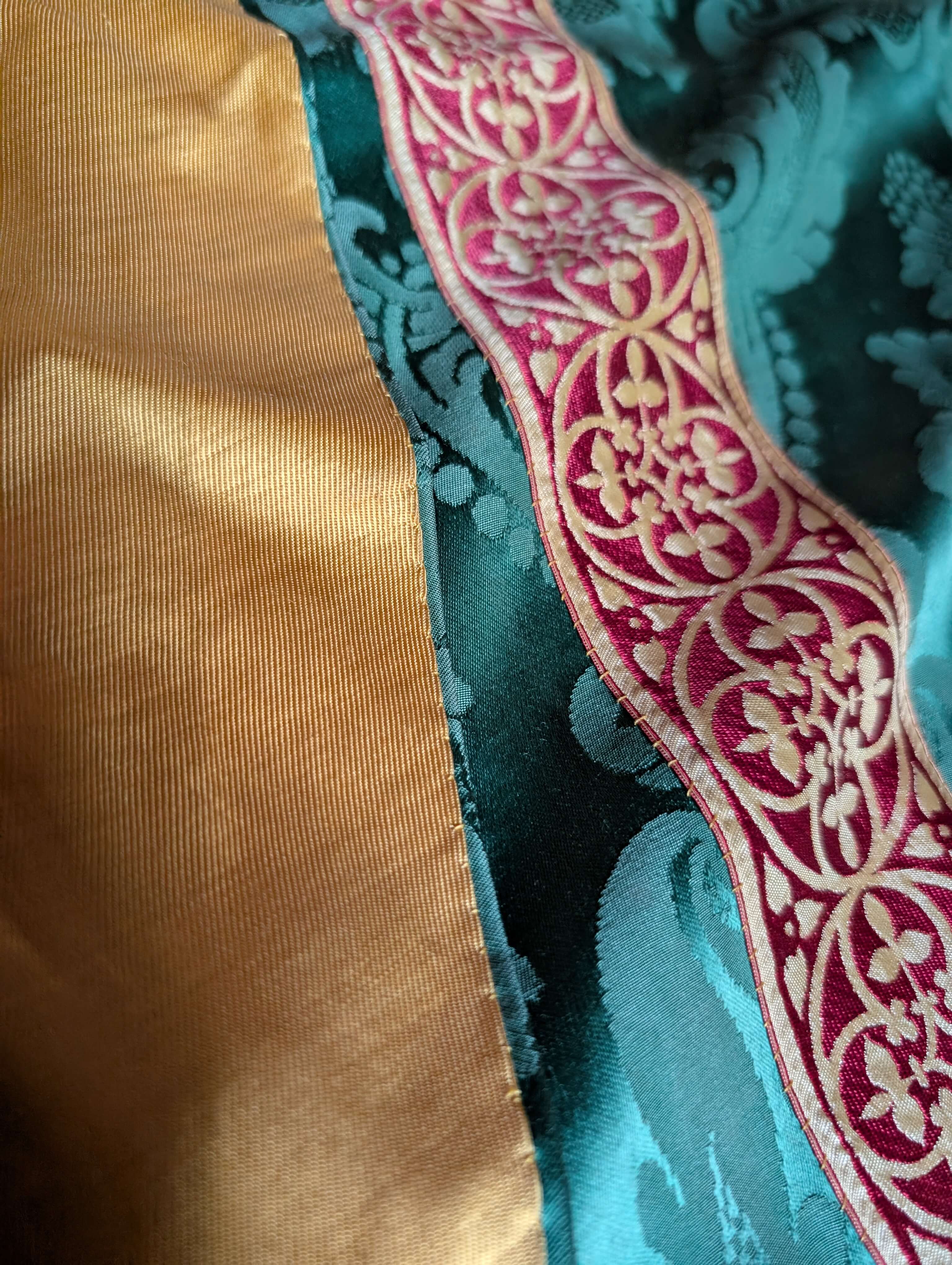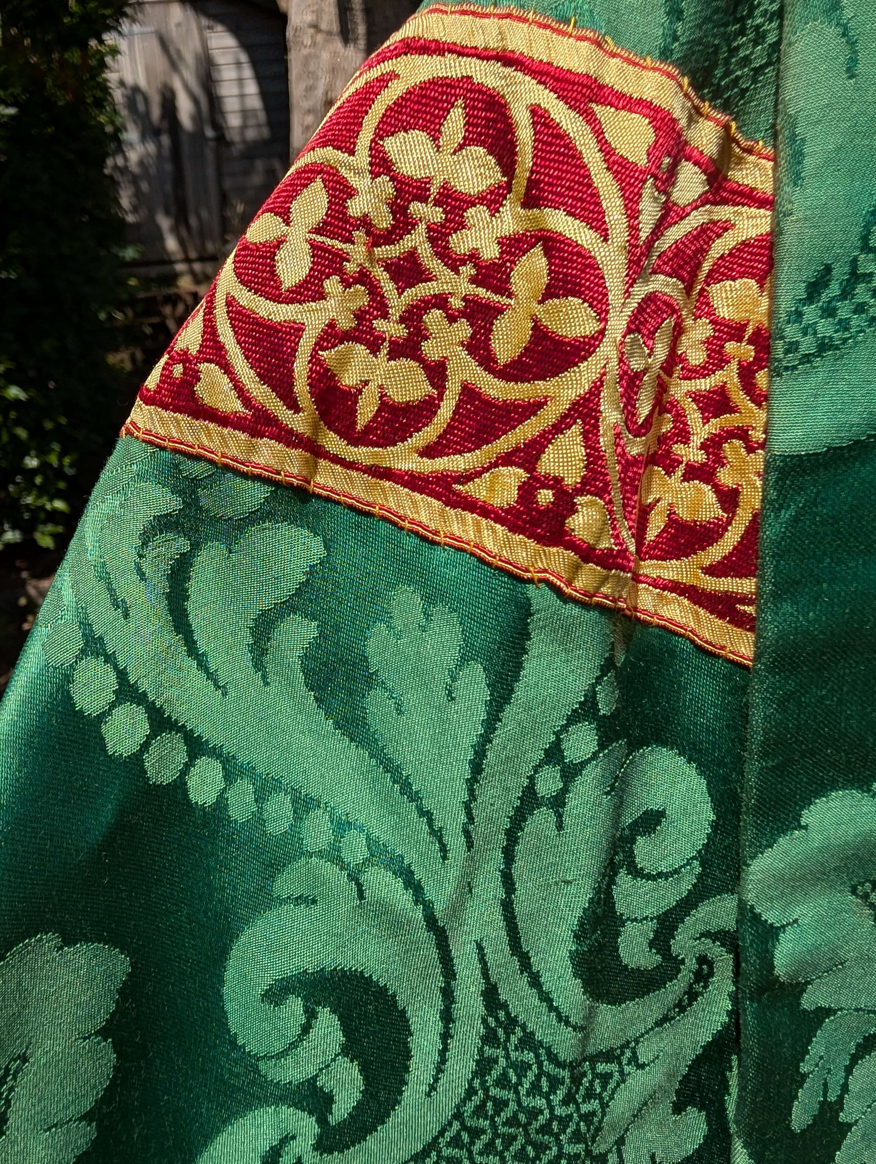 Our product shown on this page Attractive & Verdant Green Damask Silk Chasuble with Red Gold Orphreys & Stole is currently available for hire.