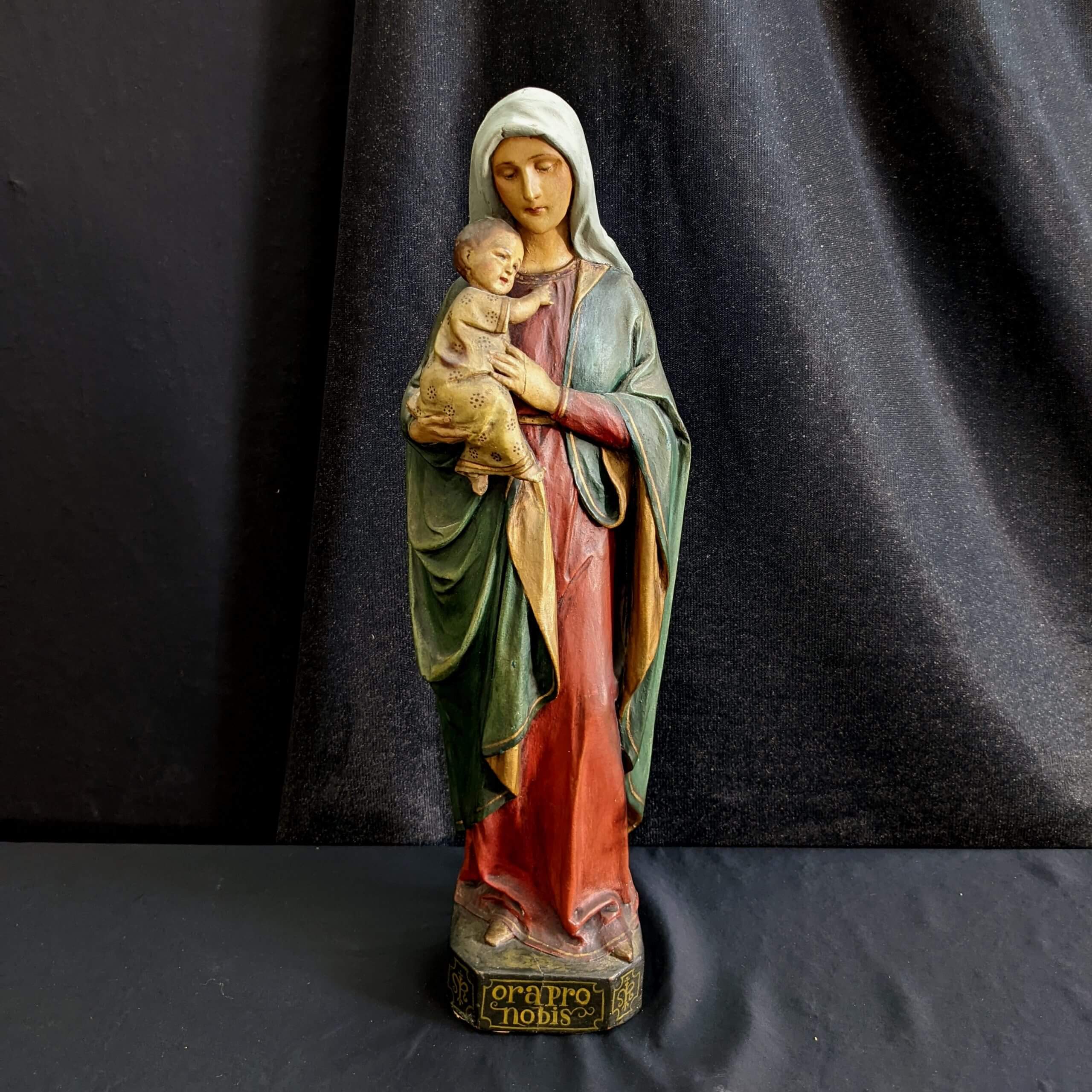 Our product shown on this page Beautiful High End Carved Antique Polychrome Wooden Italian Madonna Virgin & Child (SOLD) is currently available for hire.