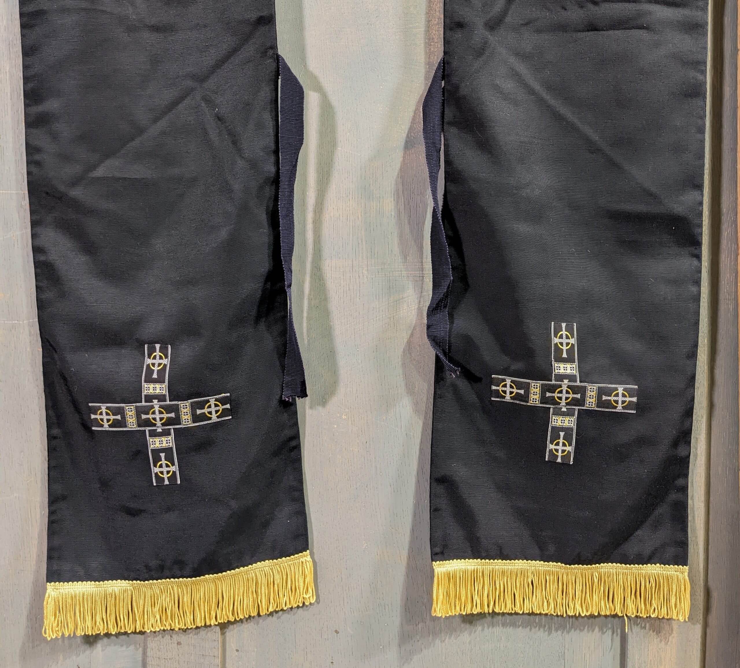 Our product shown on this page Black Funeral Preaching Stole with Crosses & Gold Fringe (SOLD) is currently available for hire.
