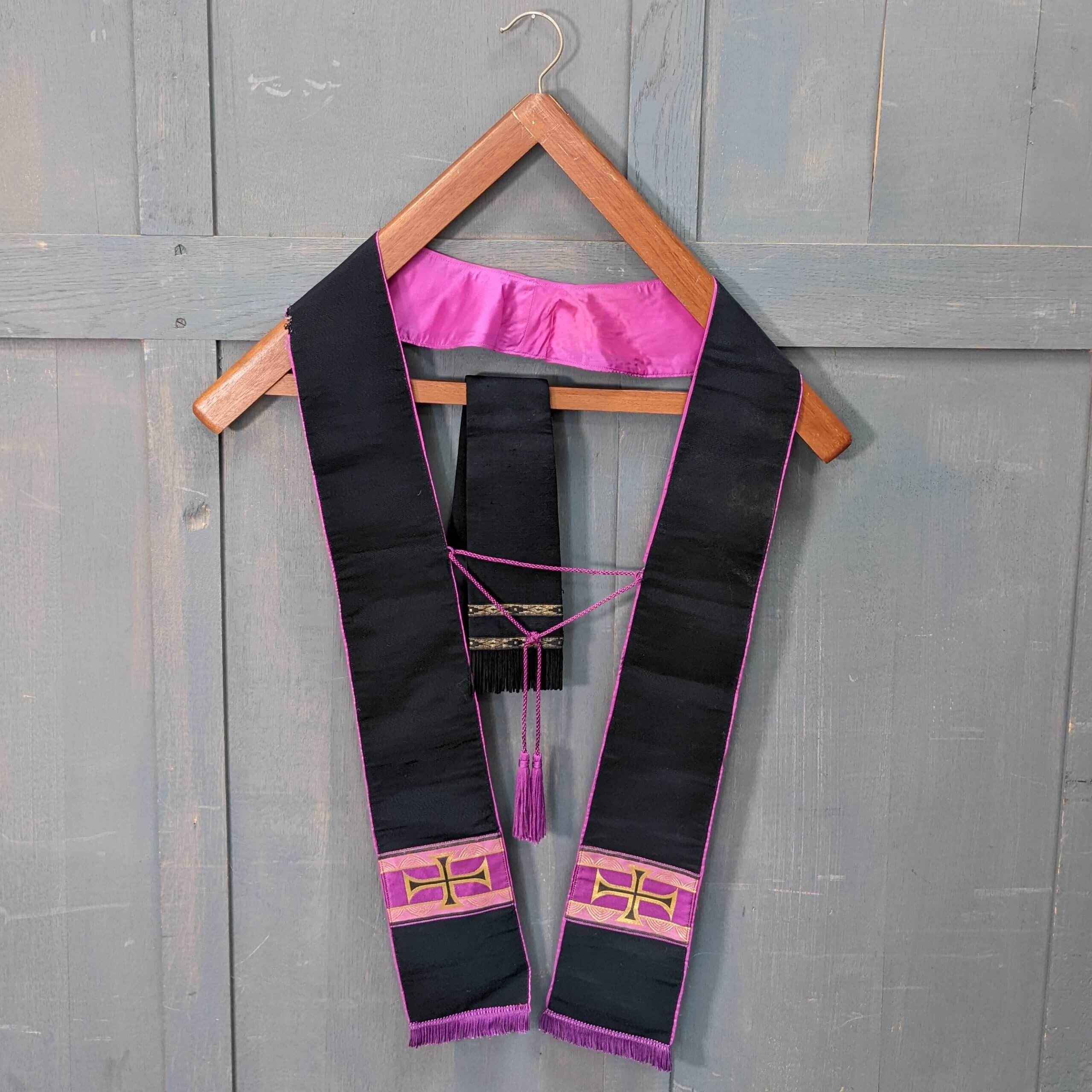 Our product shown on this page Black & Purple Stole with Pectoral Tie & Black Maniple (SOLD) is currently available for hire.
