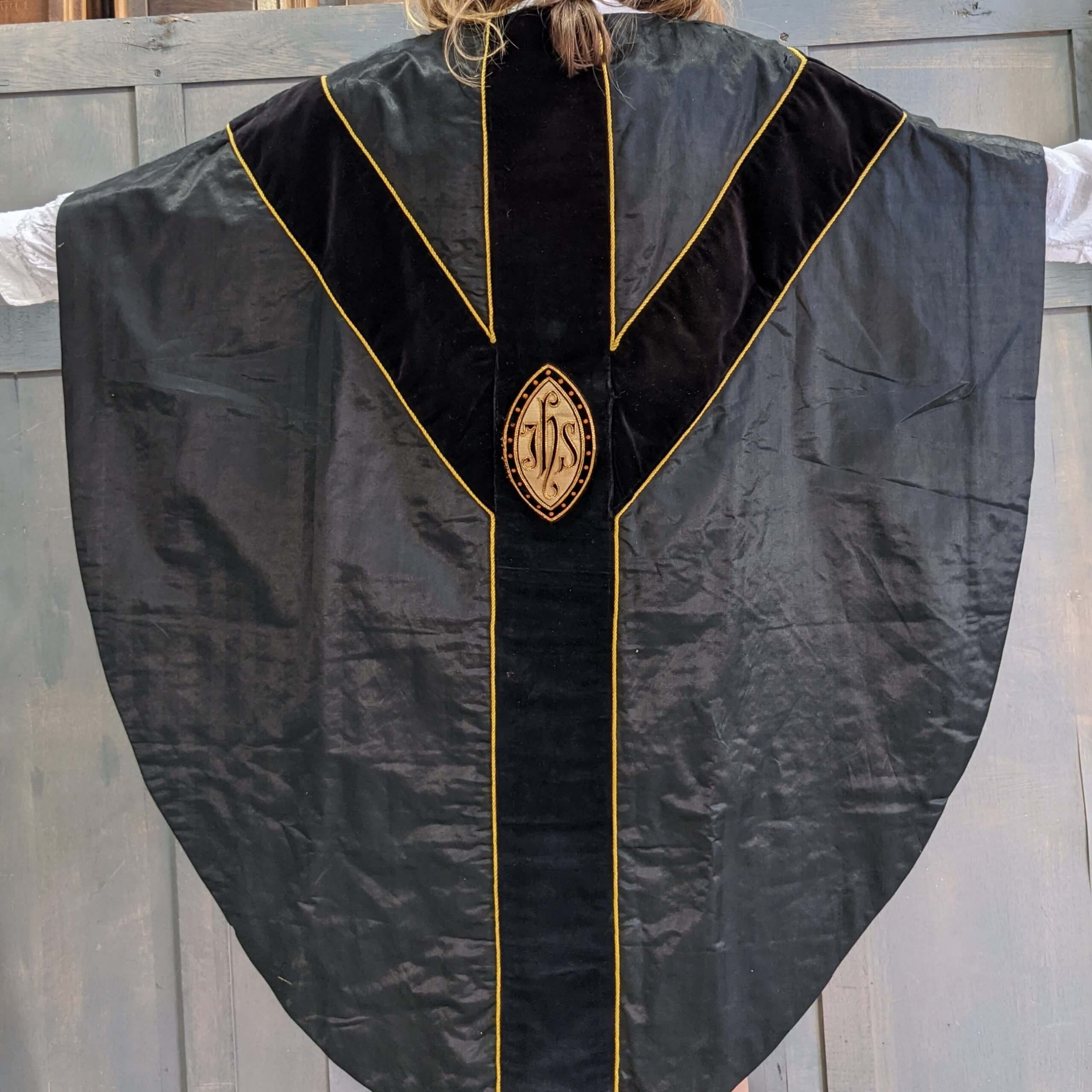 Our product shown on this page Black Velvet & Satin Chasuble with Yellow Gold Trim (SOLD) is currently available for hire.