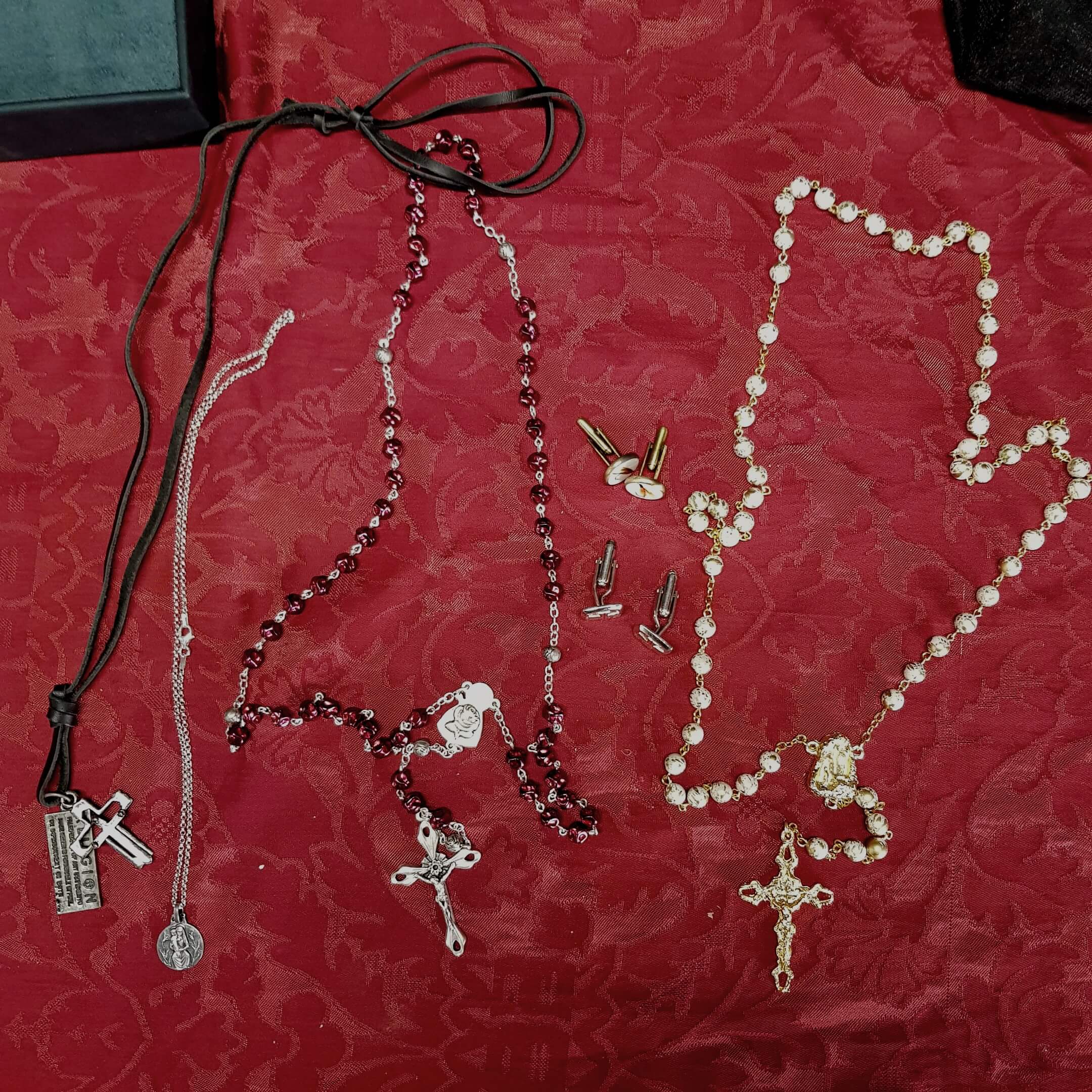 Rosary Beads, Medallion on chain, Christian cufflinks and Cross on leather tie as shown in pictures.
