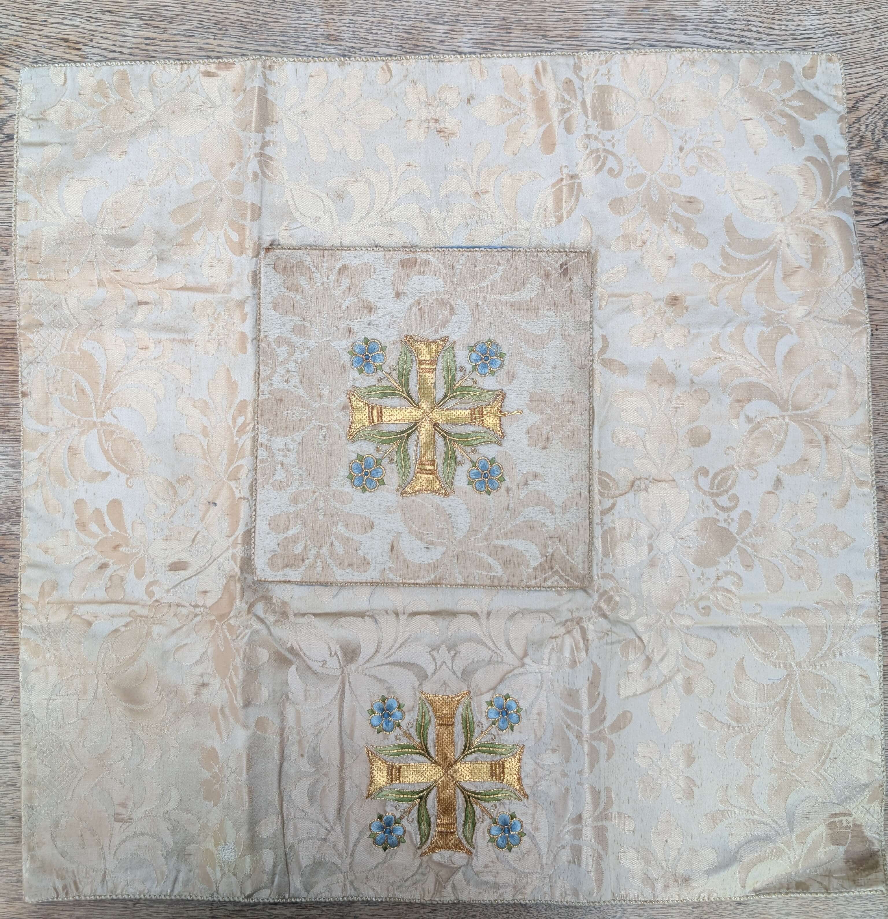 Our product shown on this page Burse and Veil With Beautiful Crosses And Forget-Me-Nots for Spares (SOLD) is currently available for hire.