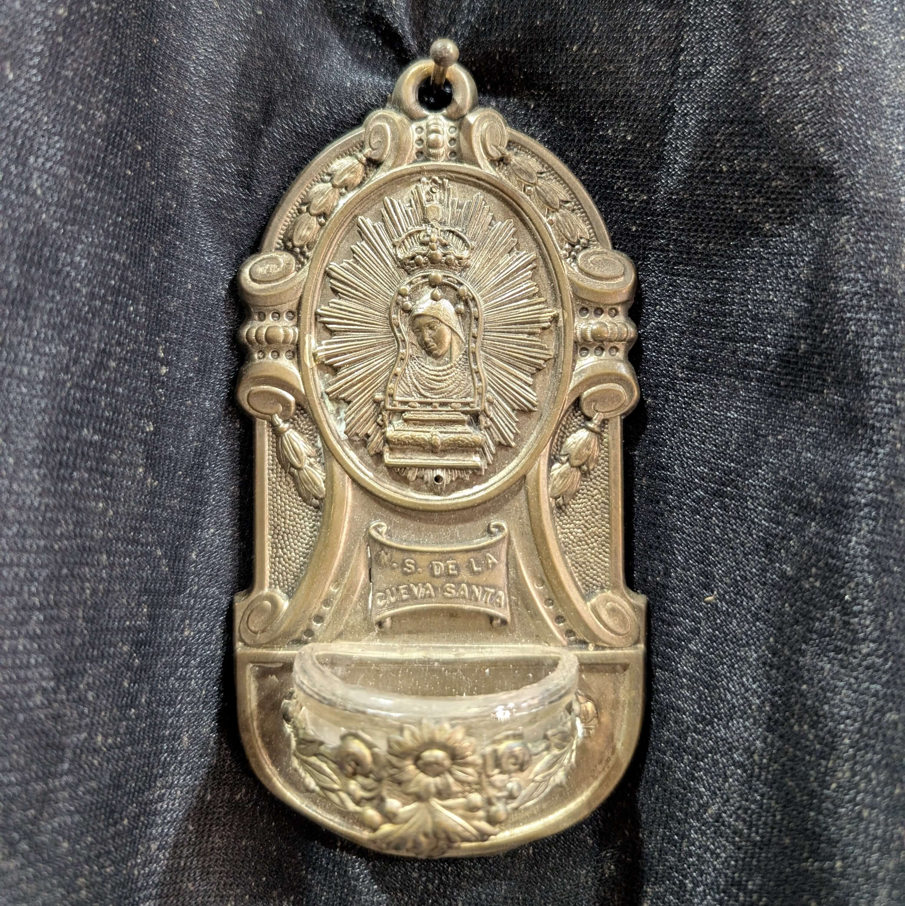 Our product shown on this page Cheap Pressed Steel Holy Water Stoop Piscina dedicated to Our Lady of the Holy Cave of Covadonga (SOLD) is currently available for hire.