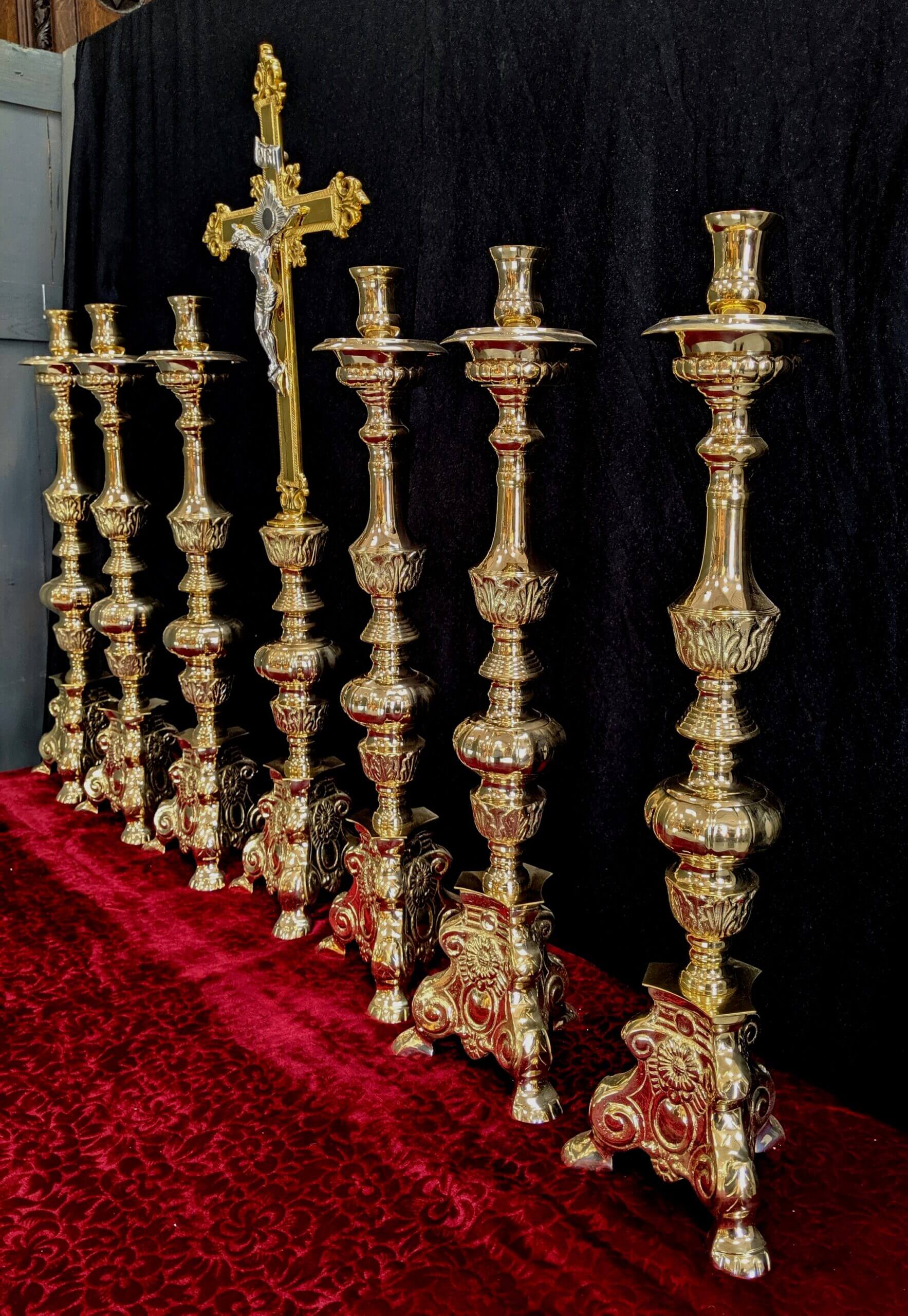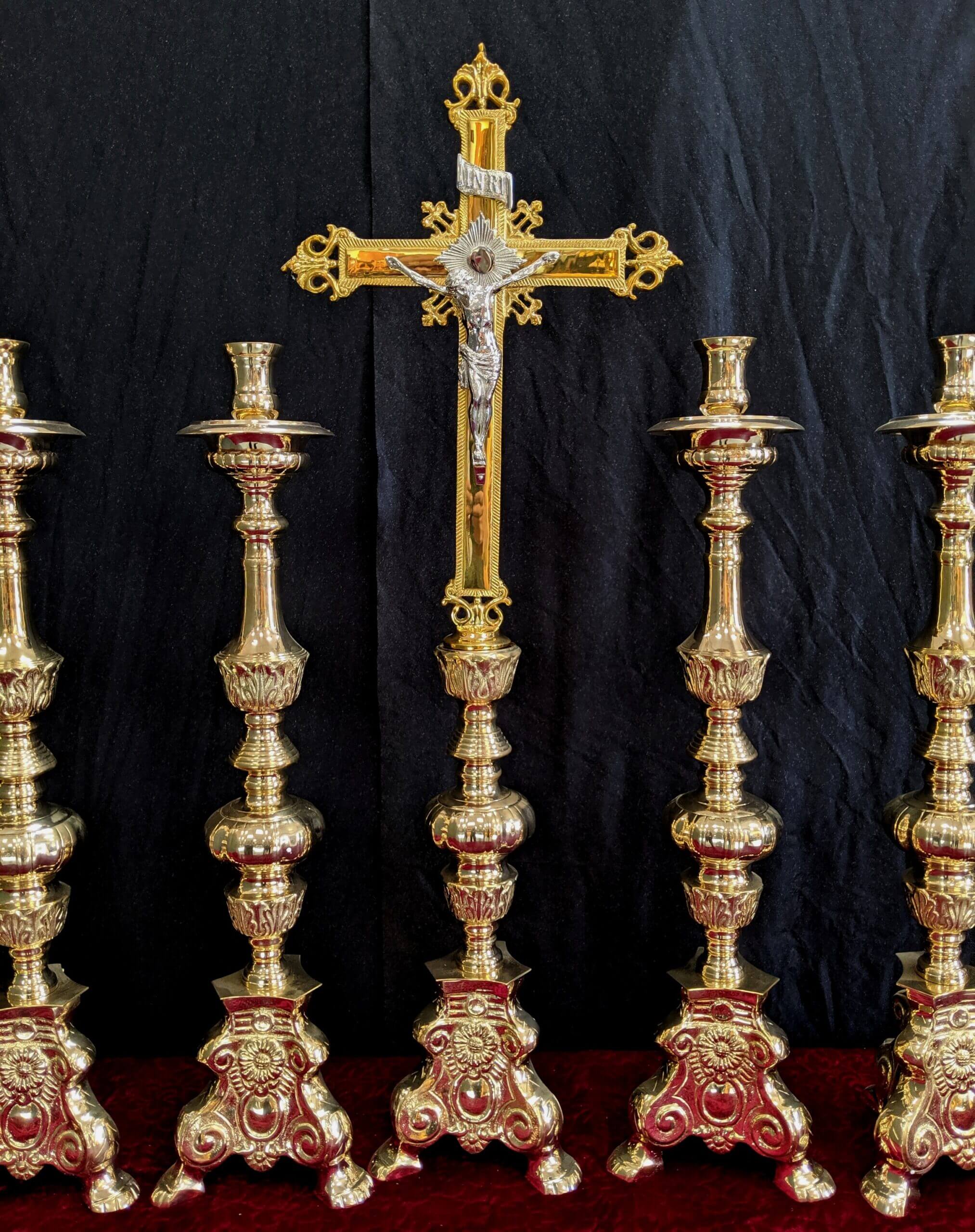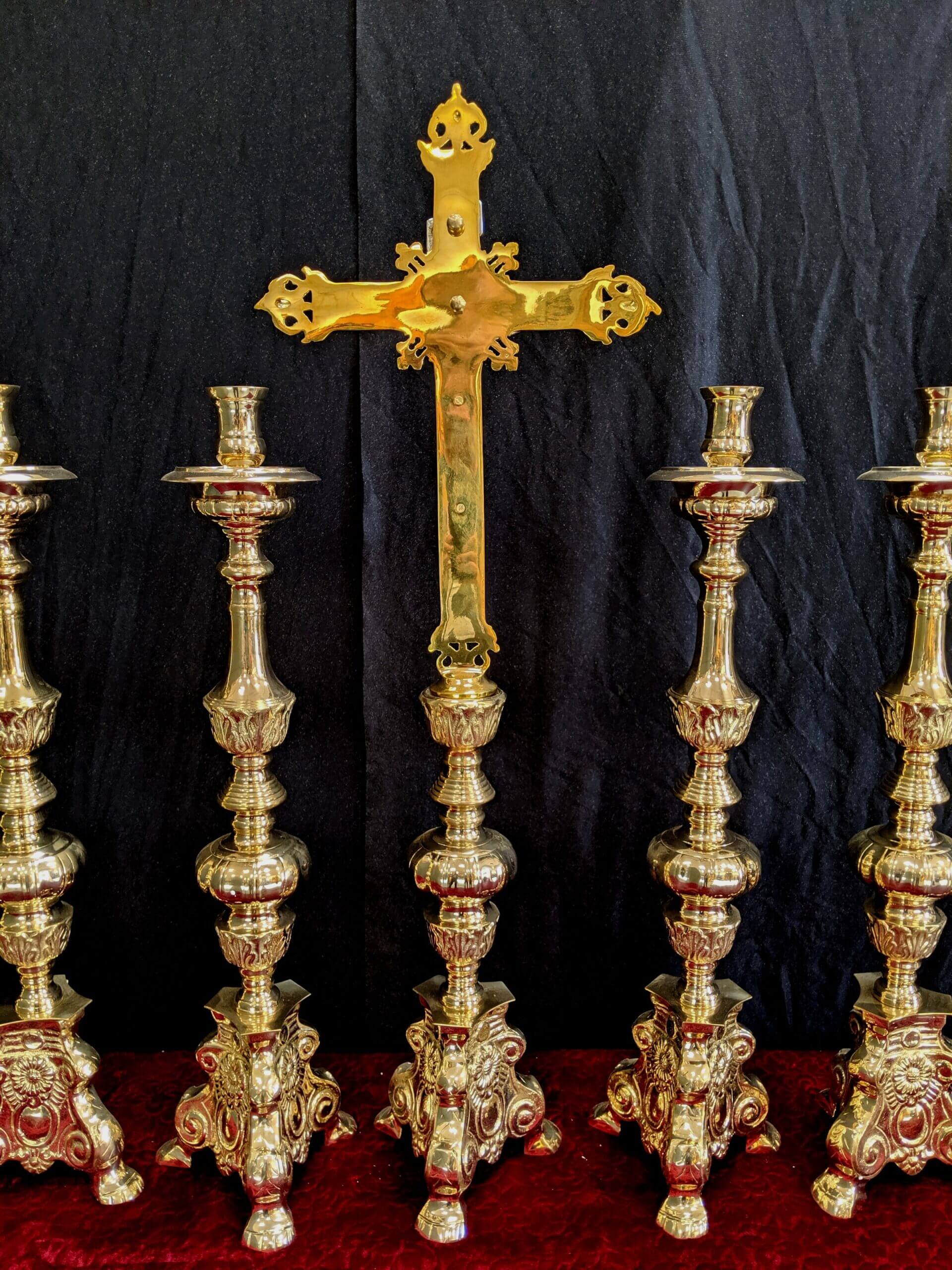 Our product shown on this page Classic Heavy Brass Large Size ‘Big Six’ Set of Candlesticks & Crucifix is currently available for hire.