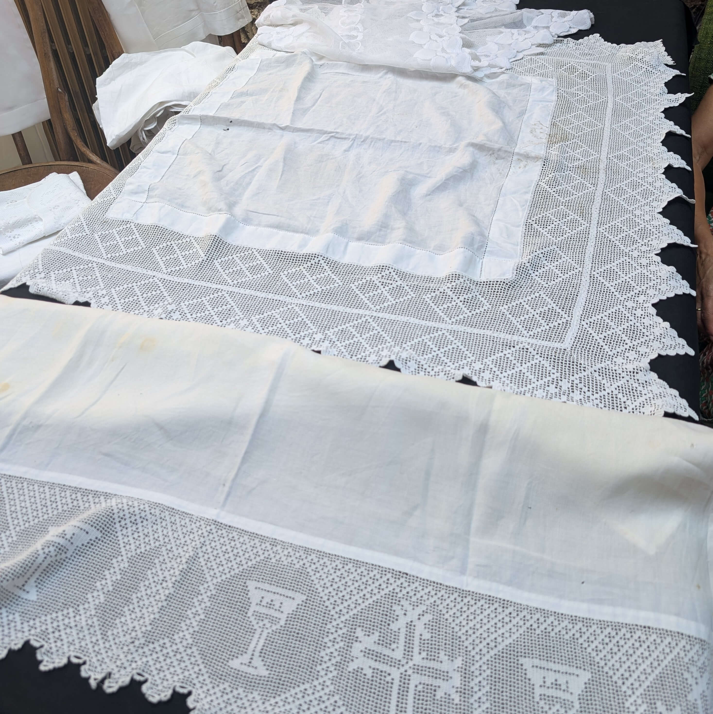 Our product shown on this page Communion Linen #10 – 3 Embroidered Lace Altar Cloths Fair Linen (SOLD) is currently available for hire.