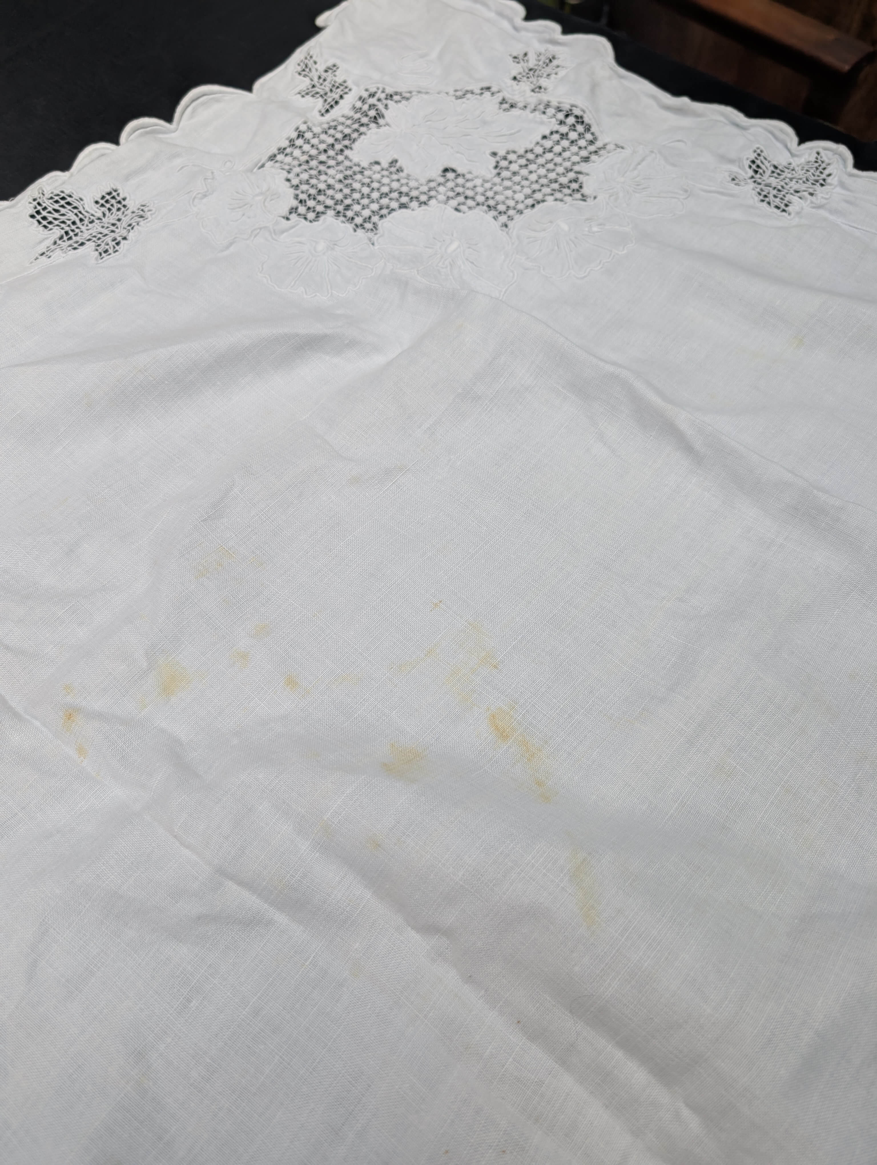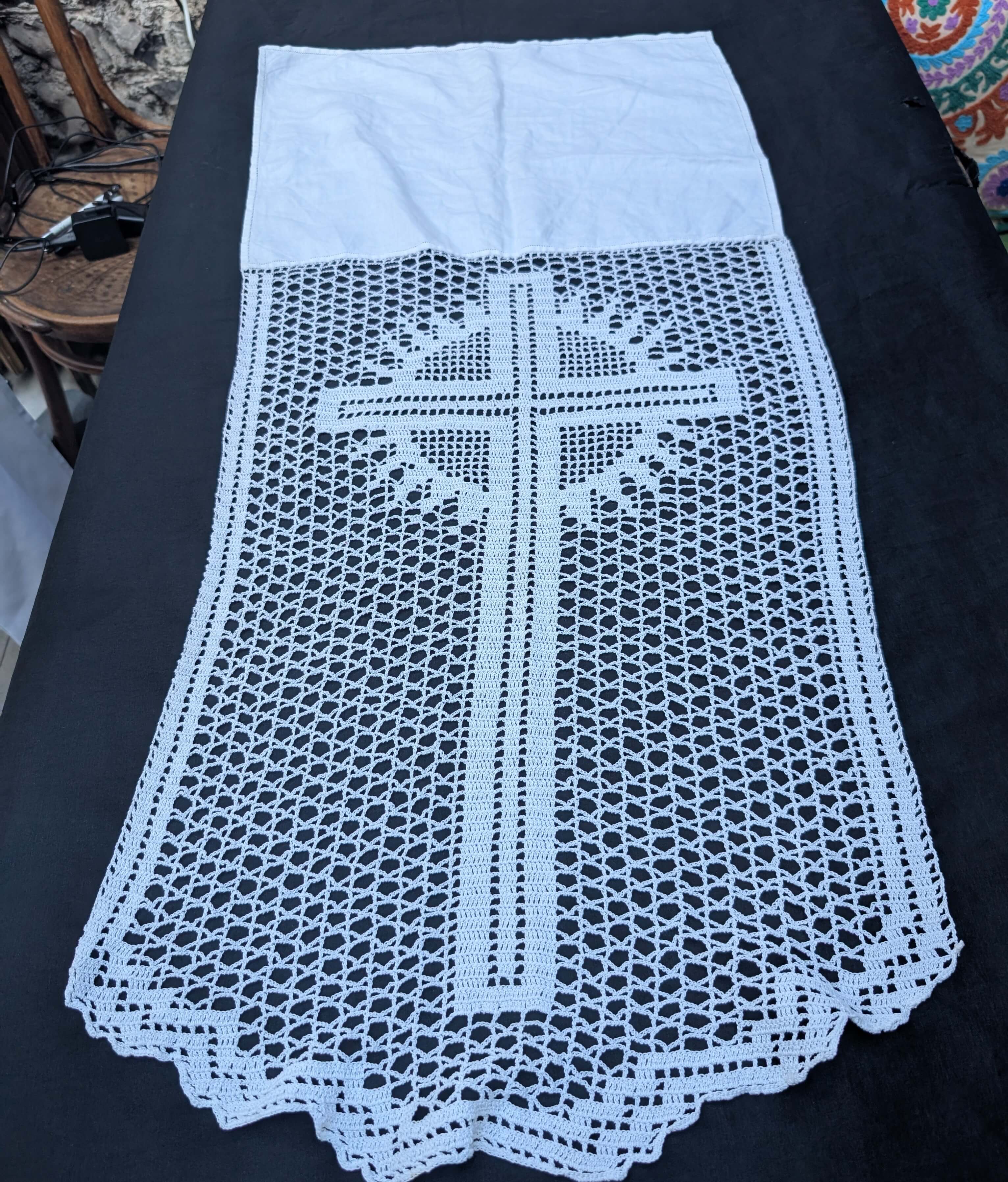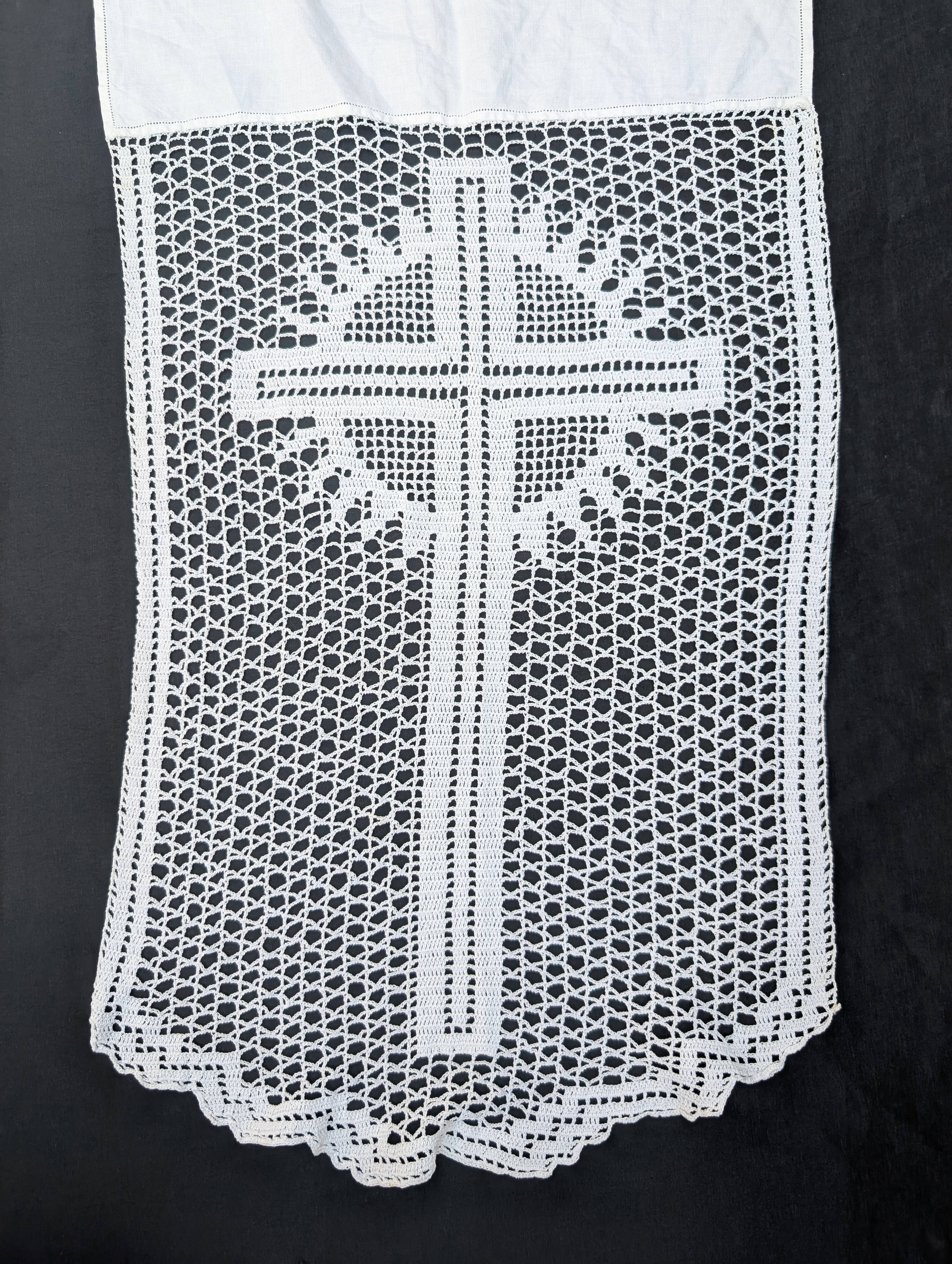 Our product shown on this page Communion Linen #13 – 3 Nice Embroidered Lacework Altar Cloths Runners Fair Linens is currently available for hire.