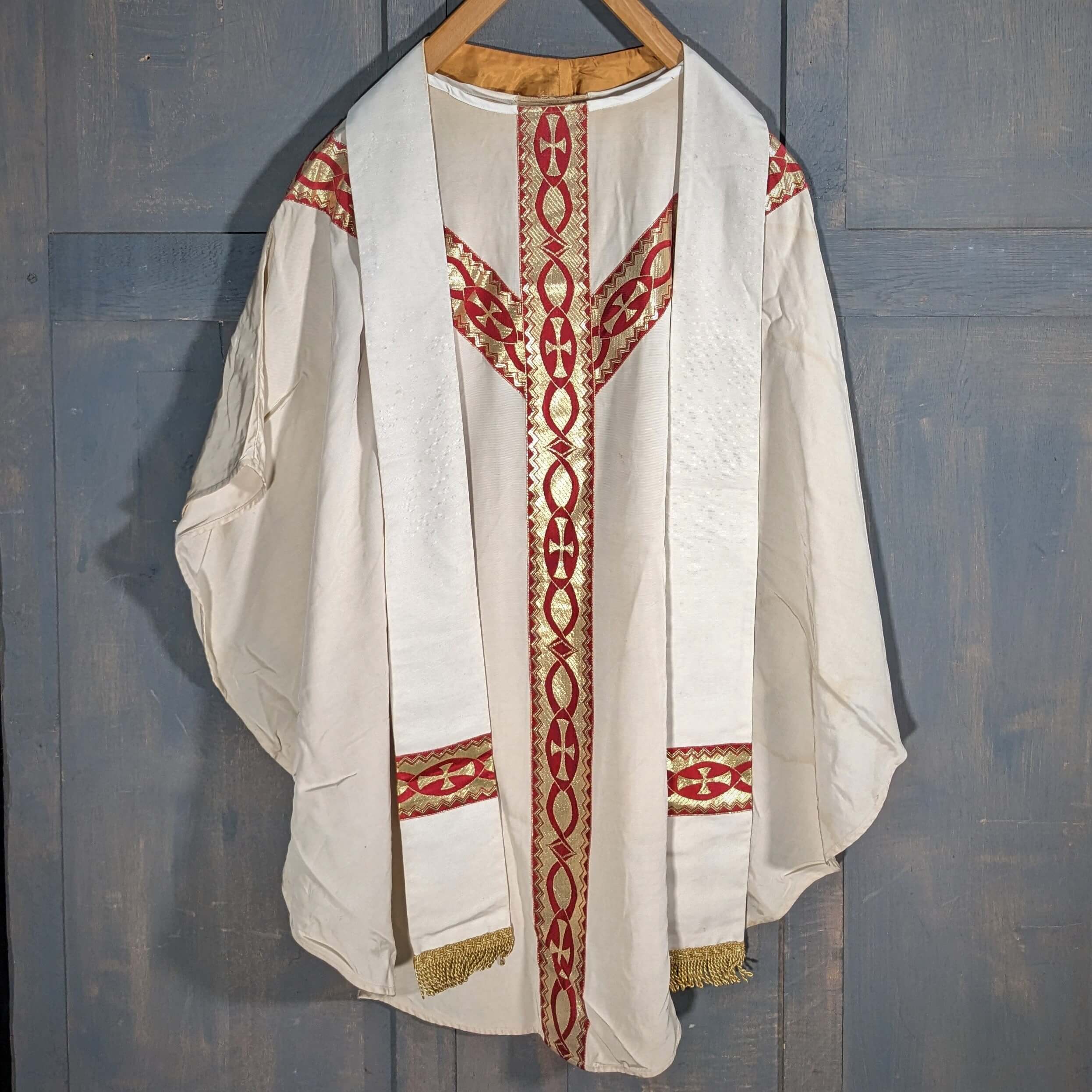 Our product shown on this page Cream Silk Chasuble with Red & Gold Orphrey and Stole (SOLD) is currently available for hire.