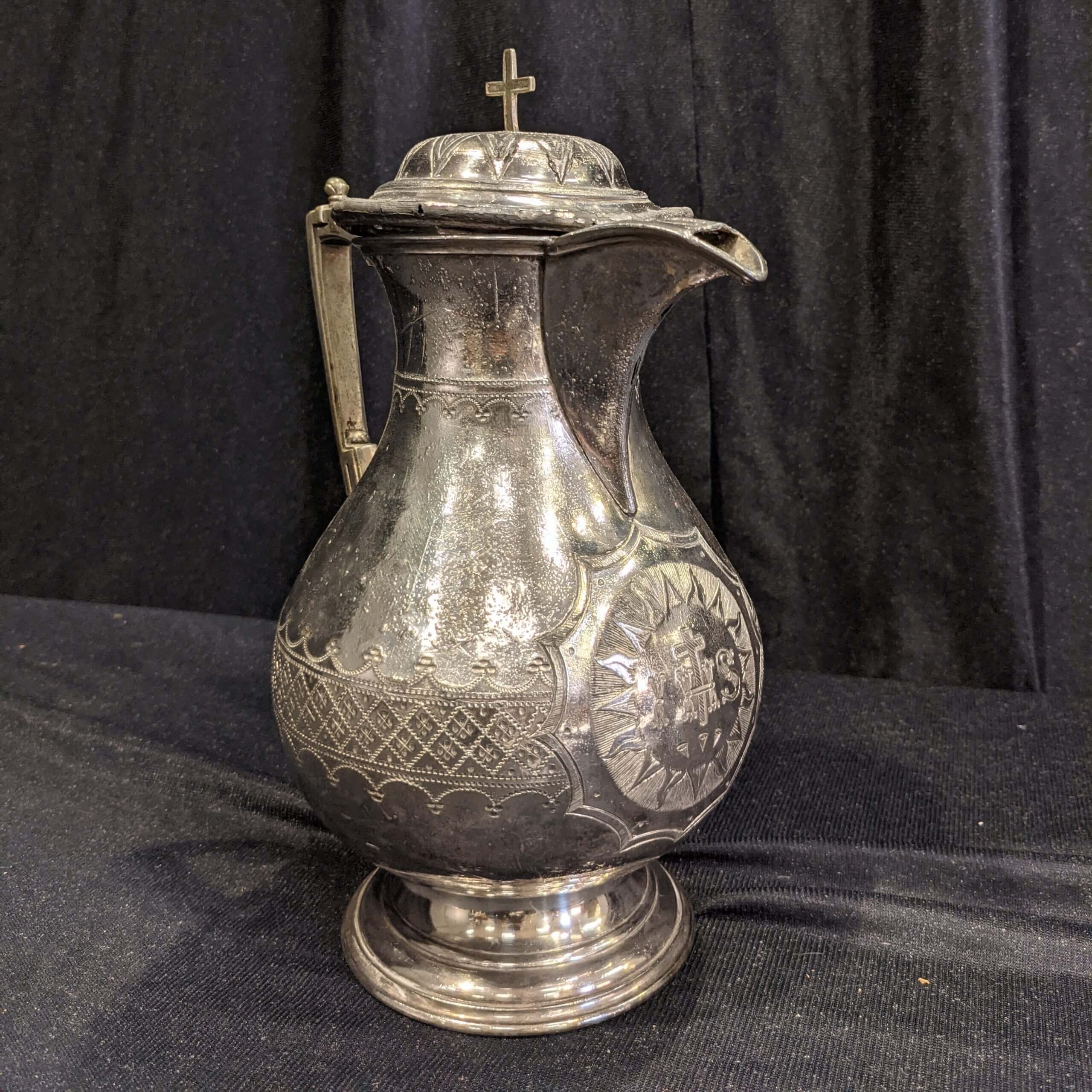 Our product shown on this page Decorative Vintage Holy Wine Flagon Church Flower Vase with IHS (SOLD) is currently available for hire.