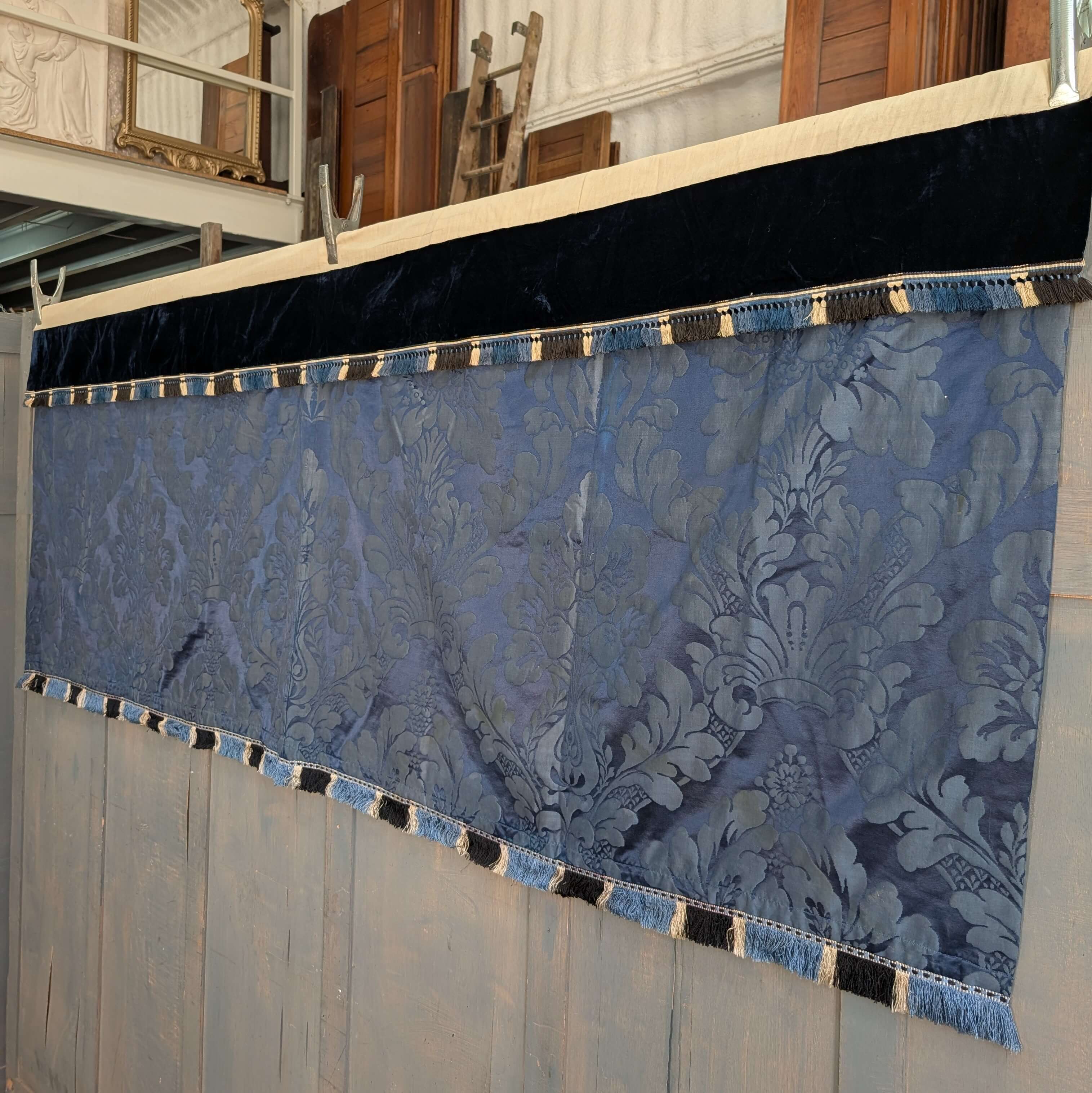 Our product shown on this page Deep Blue Damask Silk Altar Frontal with Dark Blue Velvet Superfrontal (SOLD) is currently available for hire.
