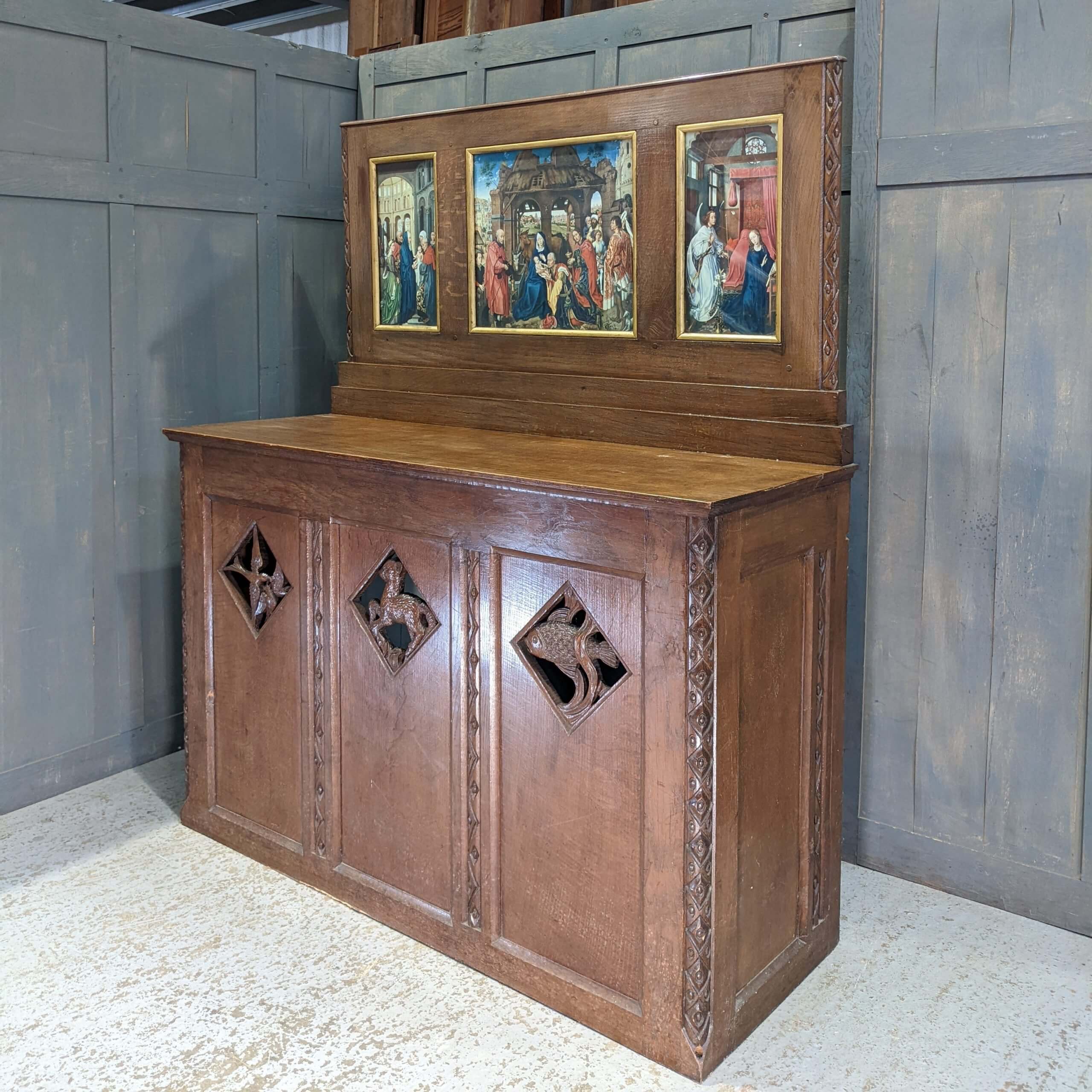 Our product shown on this page Delightful 1930’s Vintage English Oak Carved Altar with Triptych Gradine (SOLD) is currently available for hire.