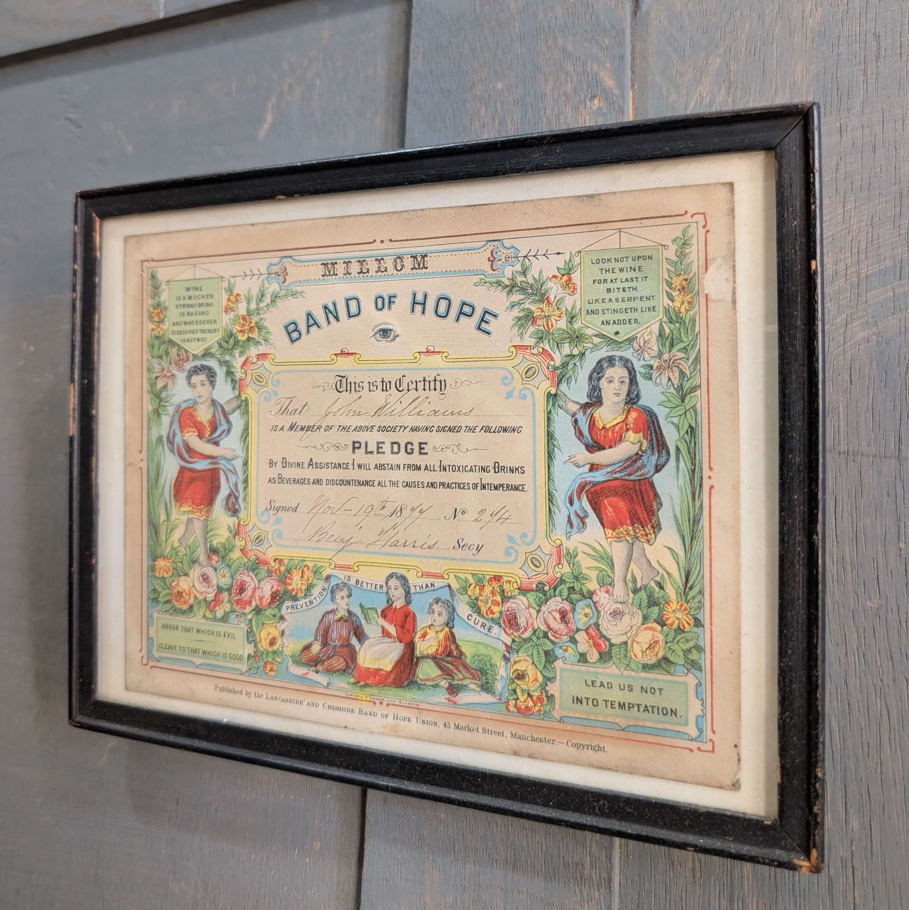 Our product shown on this page Delightful Small Framed ‘Band of Hope’ Teetotal Certificate (SOLD) is currently available for hire.
