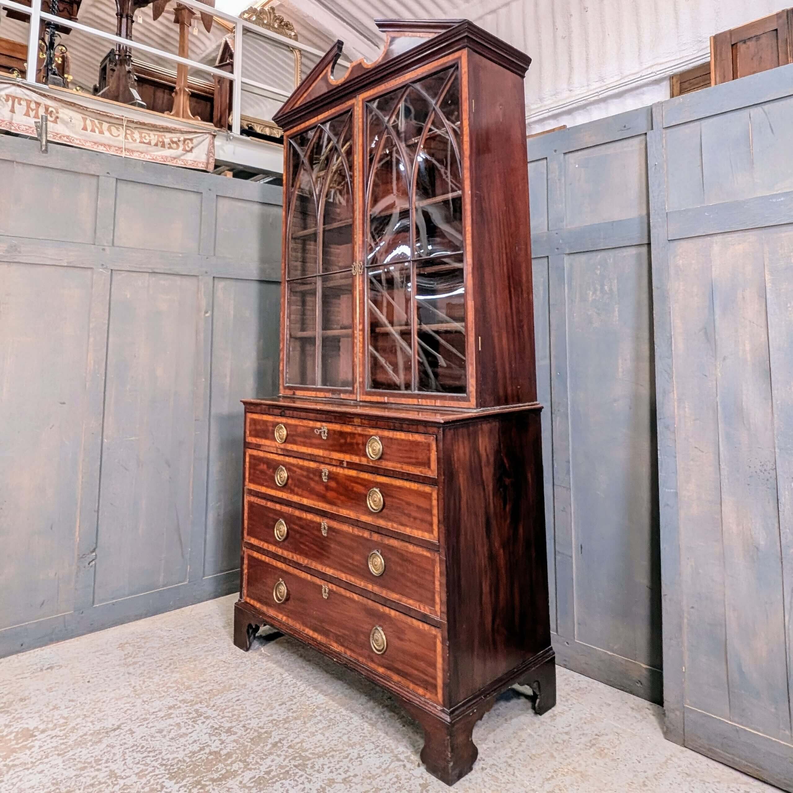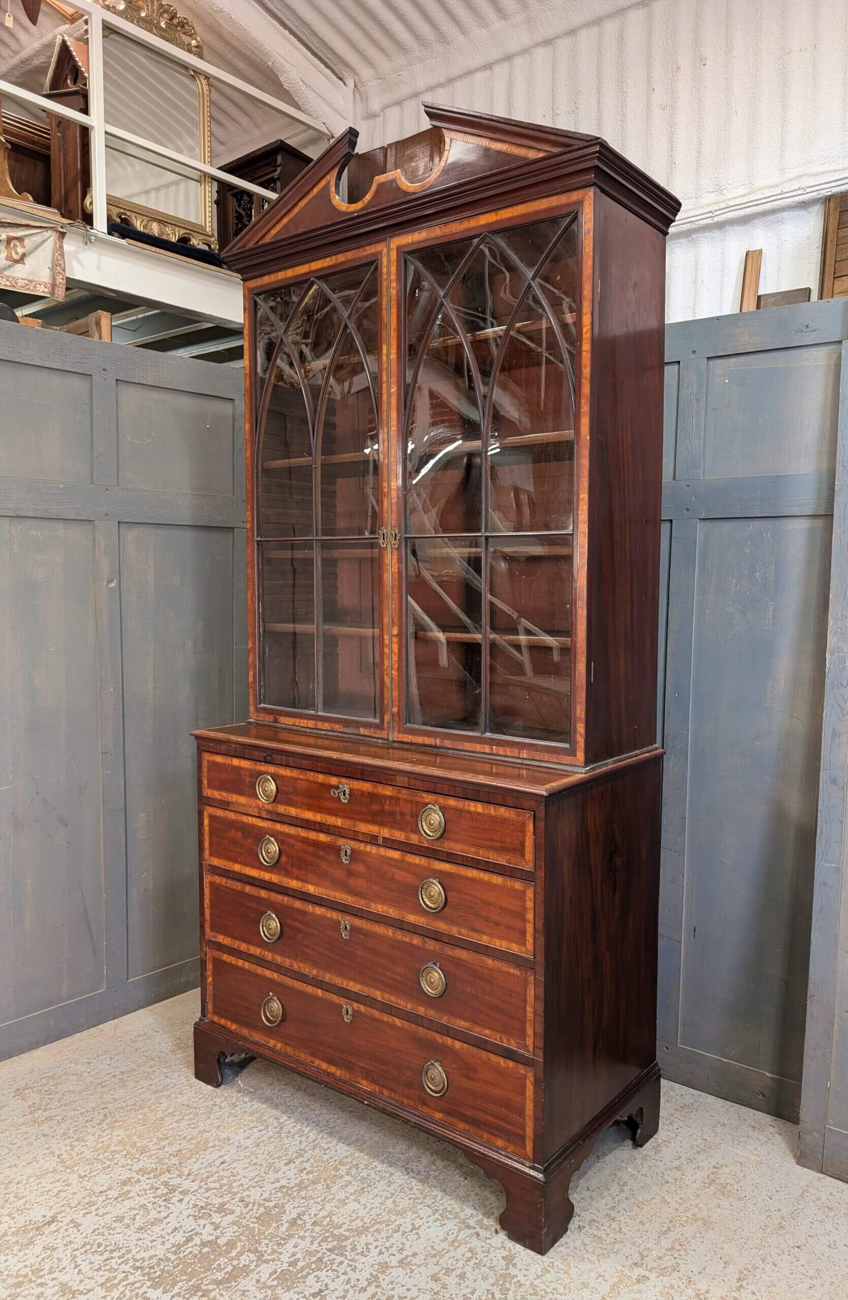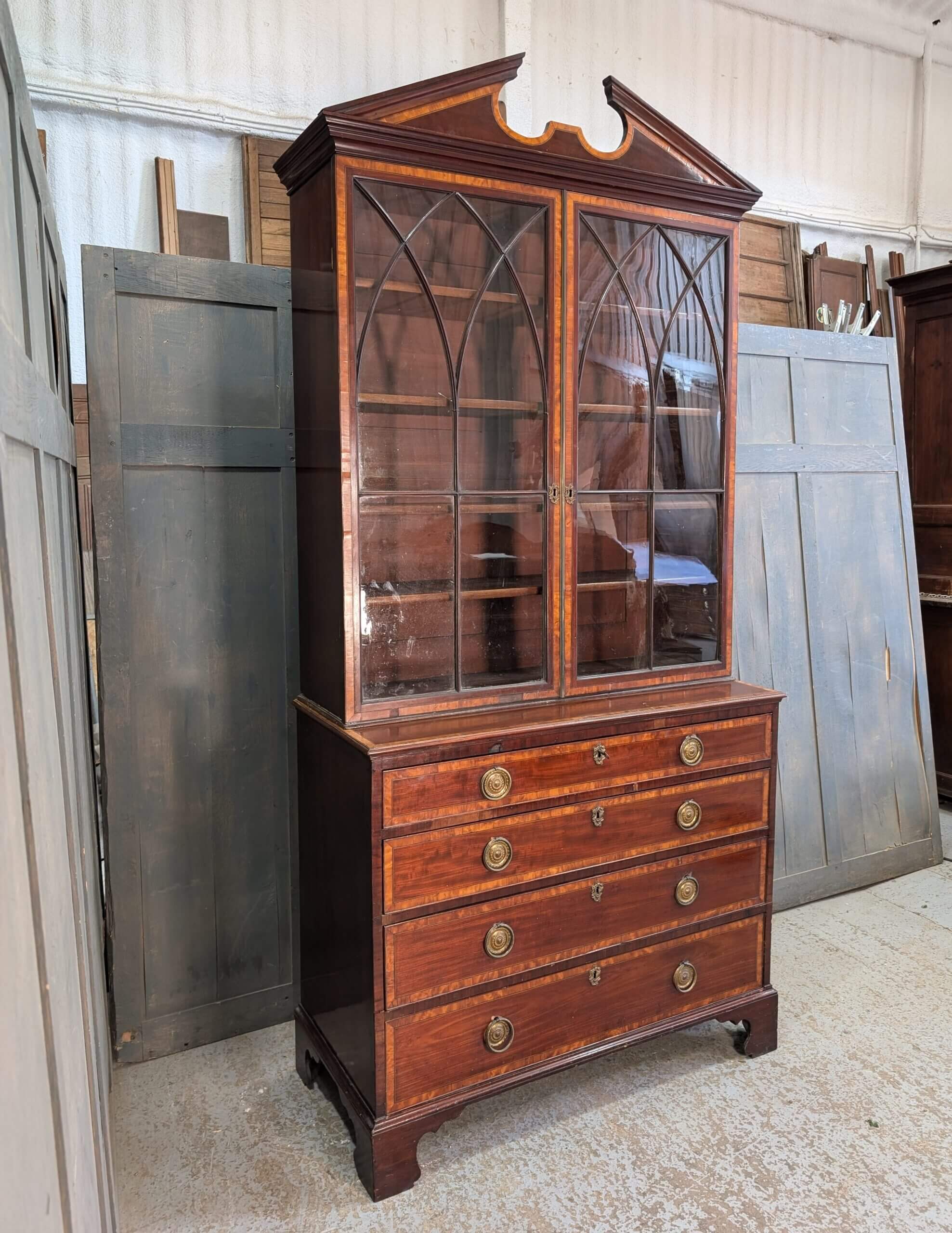 Our product shown on this page Elegant Late Georgian Glazed Satinwood Banded Mahogany Bookcase on Chest with Bracket Feet is currently available for hire.
