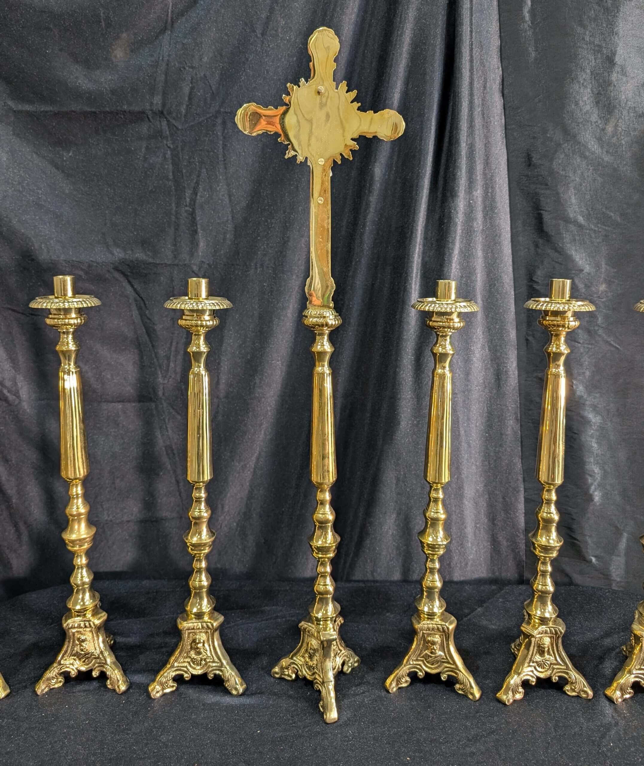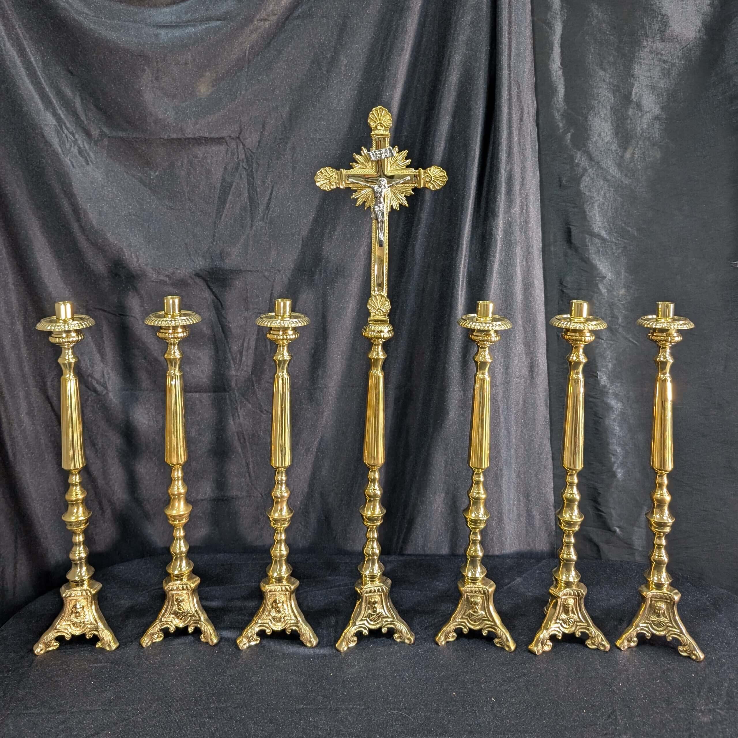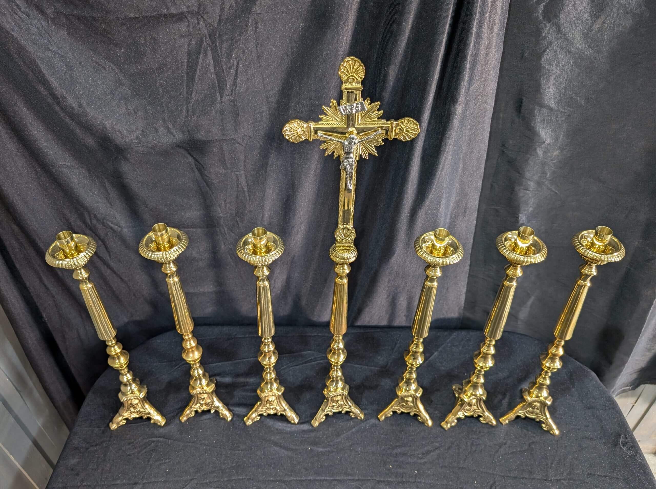 Our product shown on this page Elegant Smaller Size Heavy Brass ‘Big Six’ Set of Candlesticks & Sunburst Crucifix is currently available for hire.