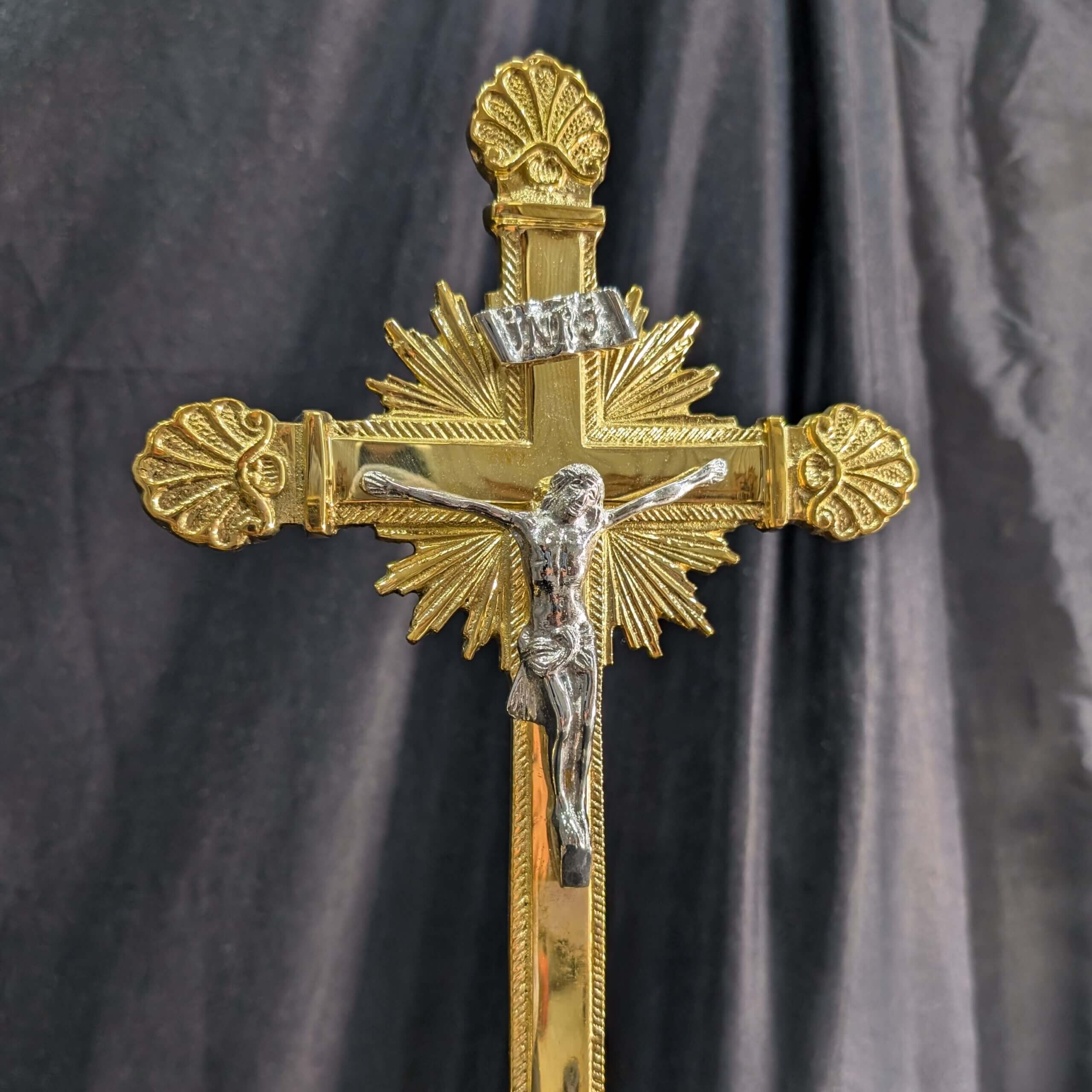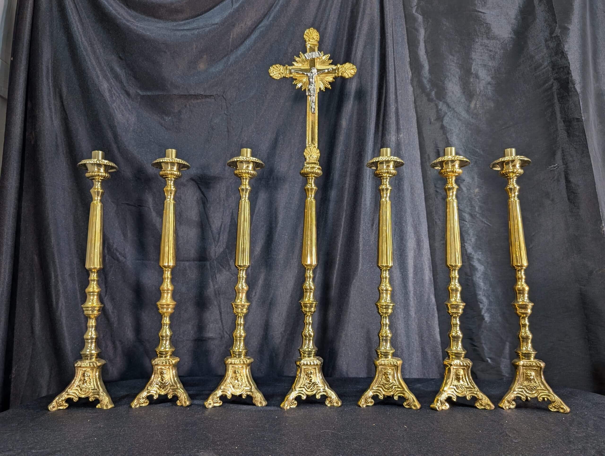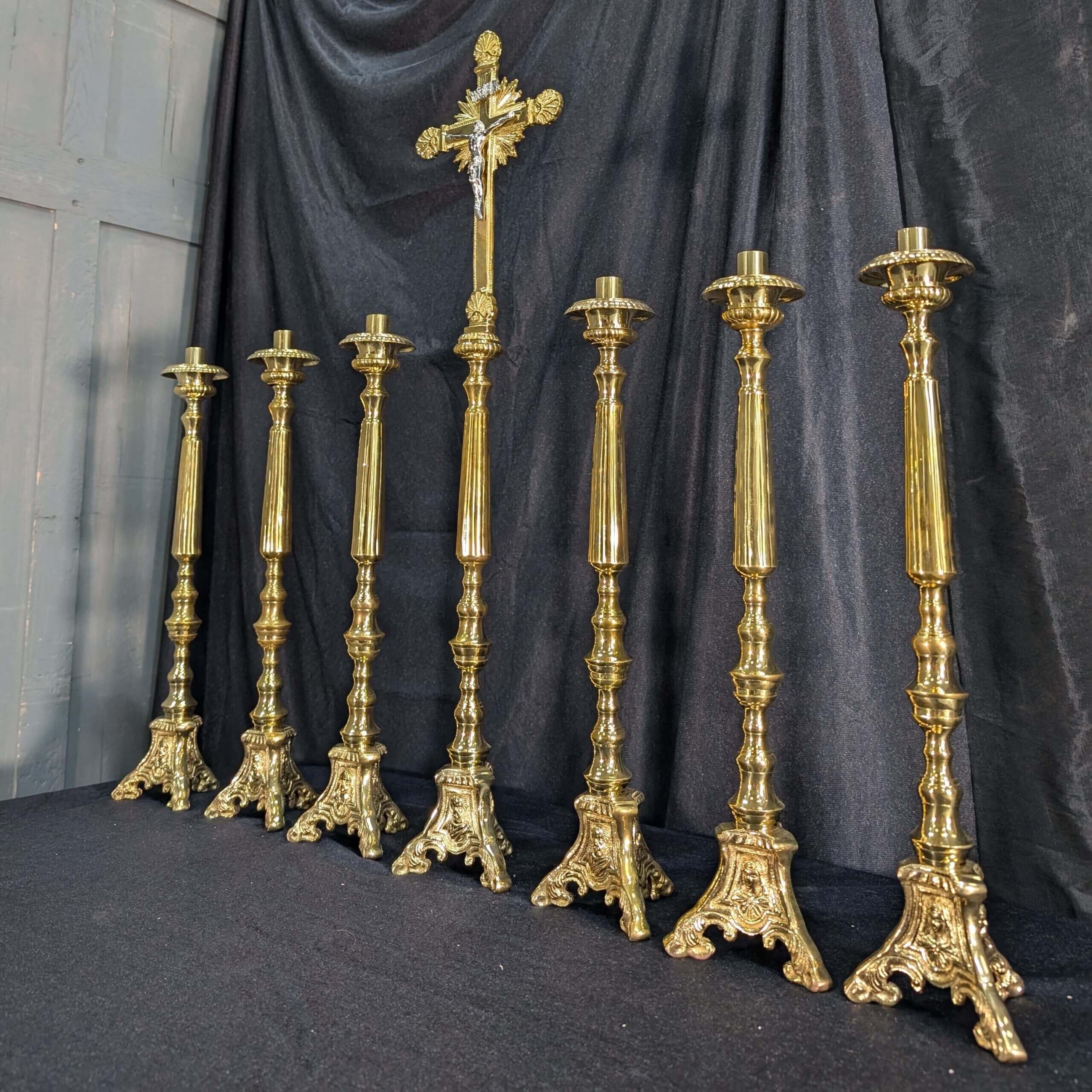 Our product shown on this page Elegant Smaller Size Heavy Brass ‘Big Six’ Set of Candlesticks & Sunburst Crucifix is currently available for hire.