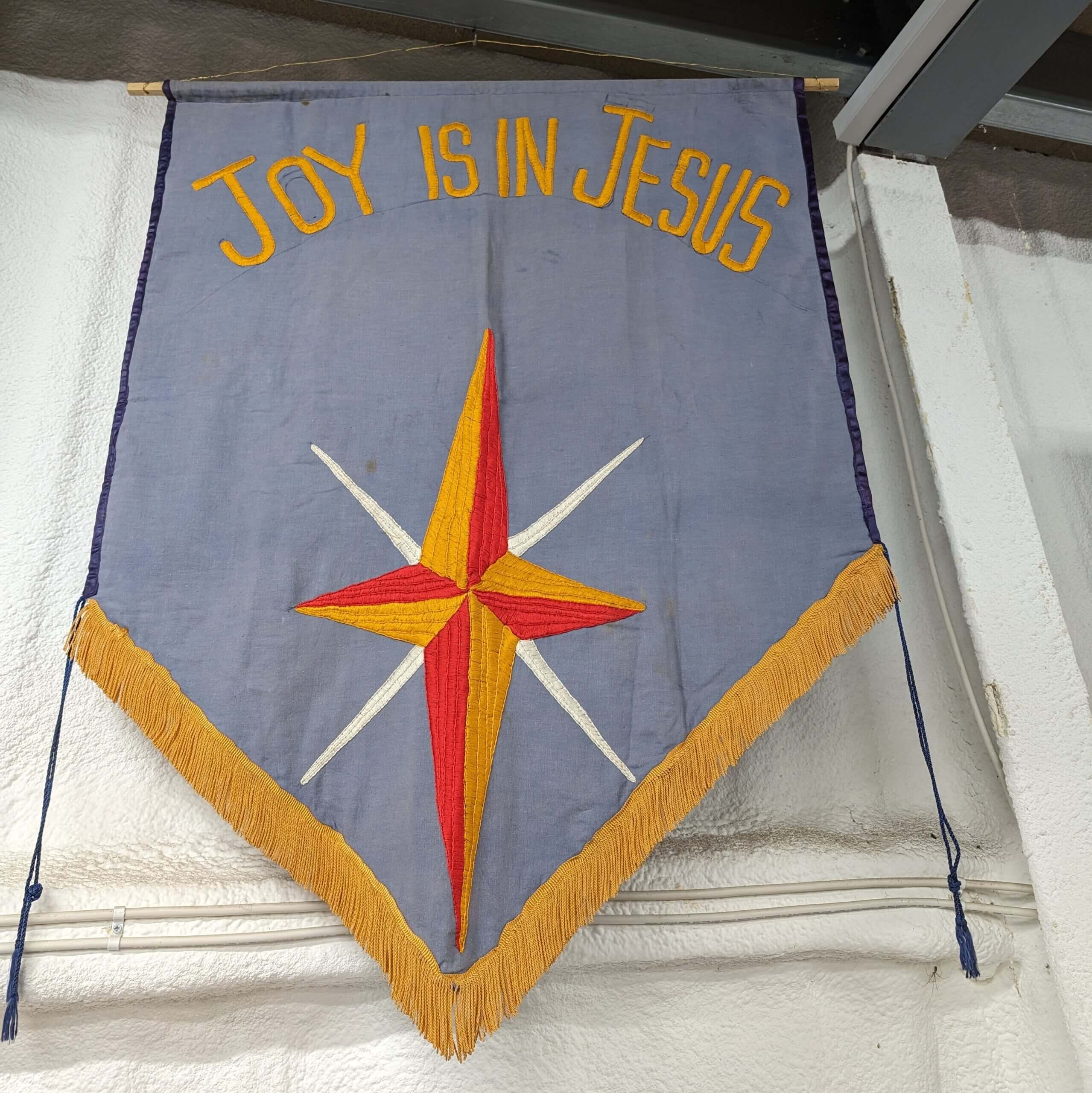 Our product shown on this page Embroidered Mid Century Vintage Sunday School Children’s Church Banner (SOLD) is currently available for hire.