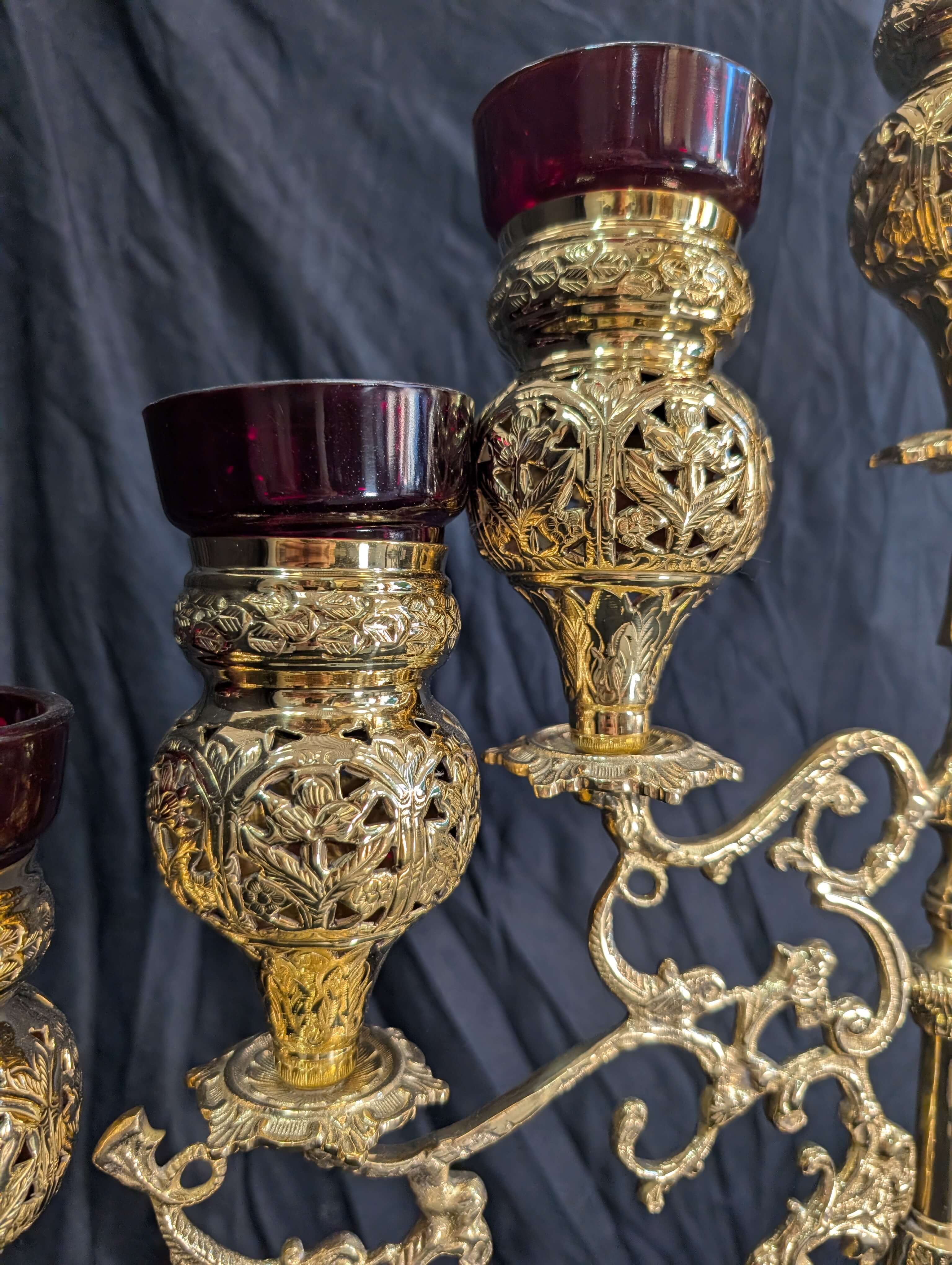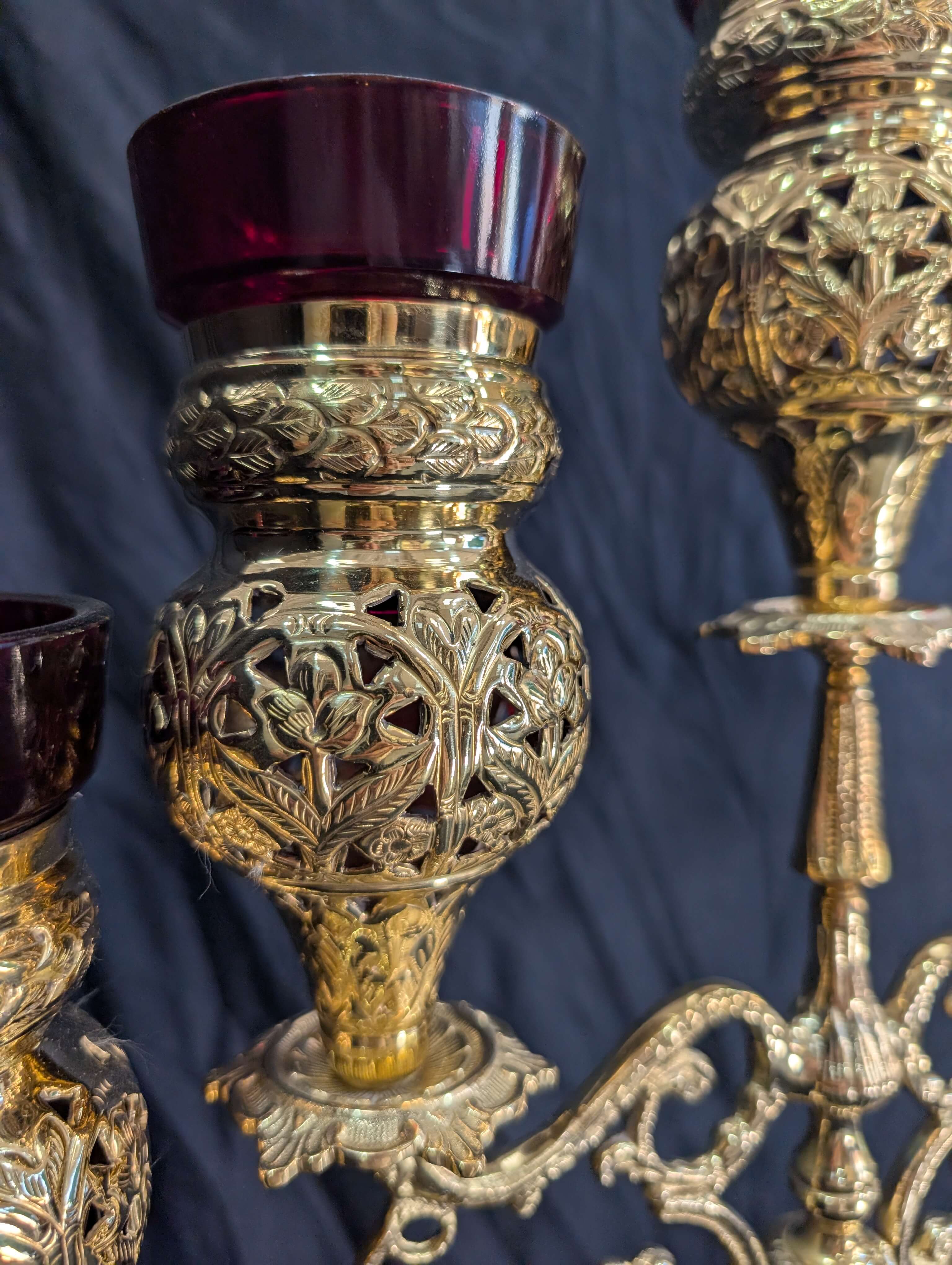 With red glass holders that could take candles or oil with wicks.