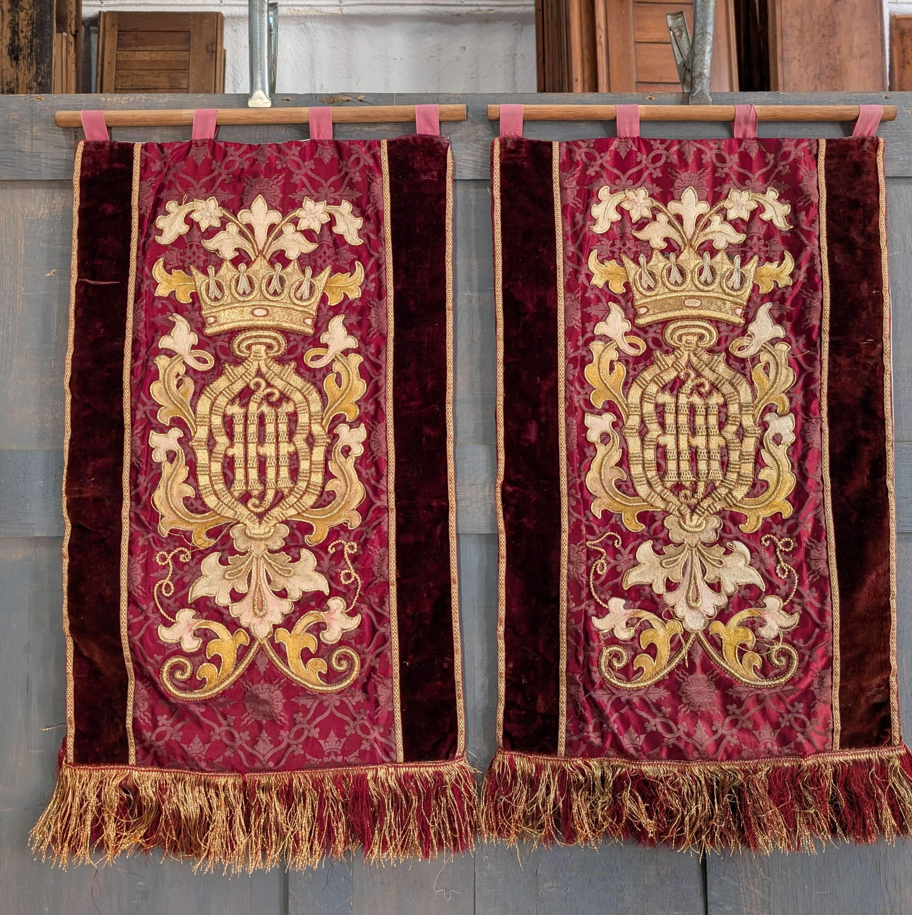 Our product shown on this page Exciting High Church 1880’s Antique Embroidered Gold & Red Damask Banner Hangings (SOLD) is currently available for hire.