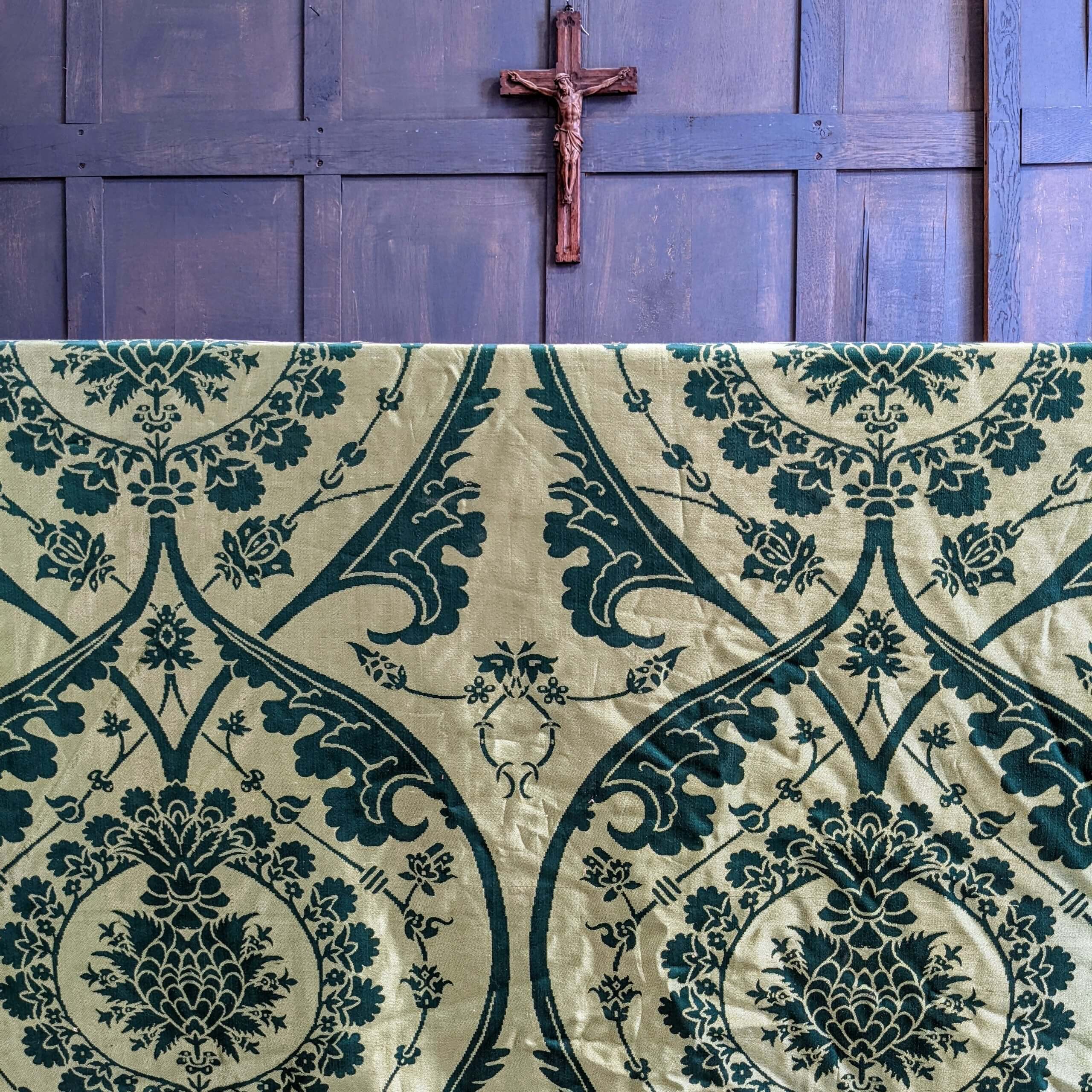 Our product shown on this page Extemely Large Vintage Majestic & Shimmering Emerald & Gold Altar Frontal (SOLD) is currently available for hire.
