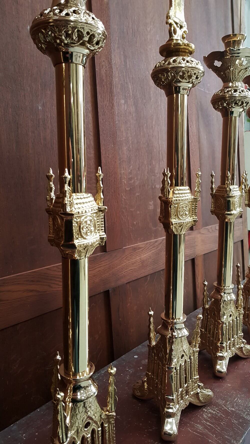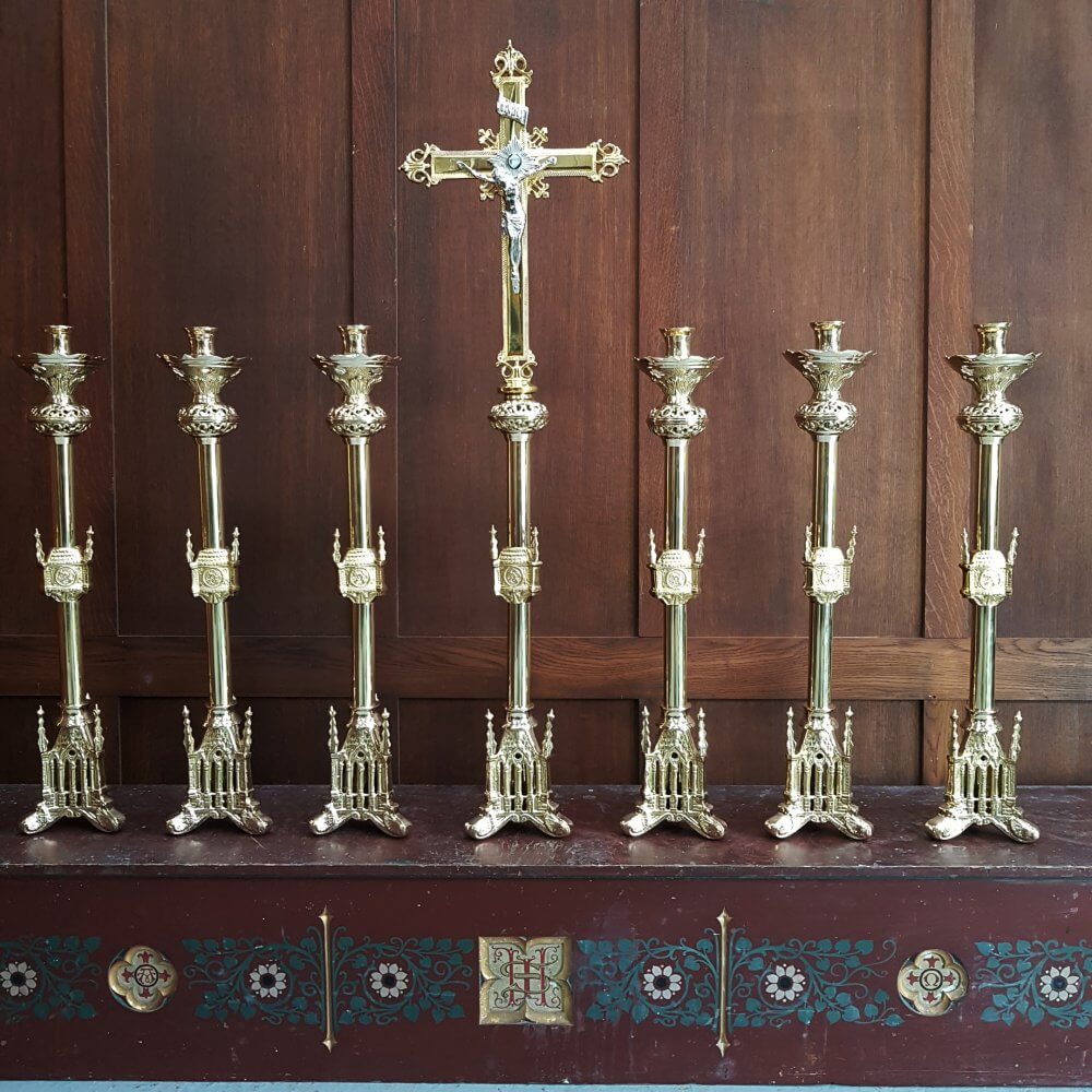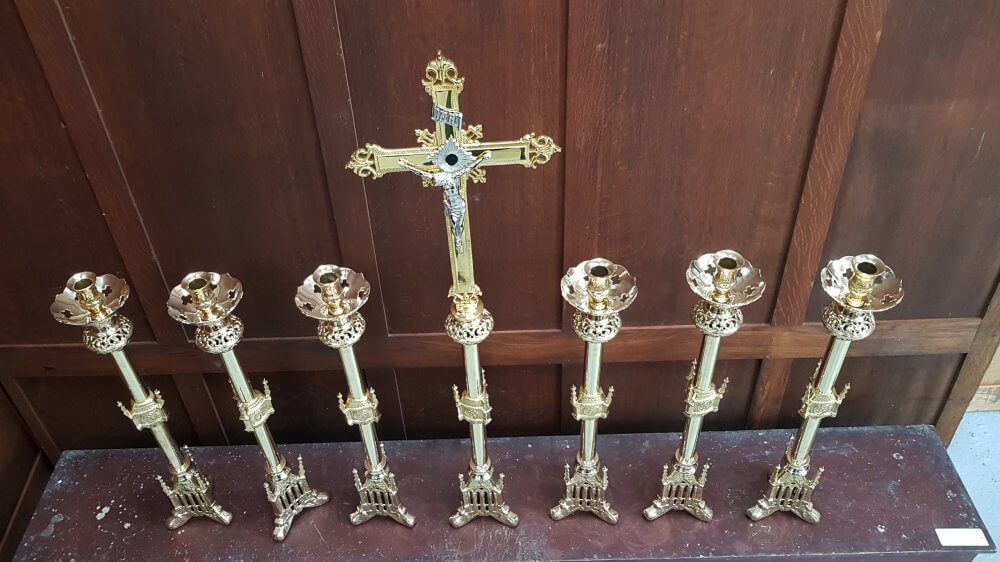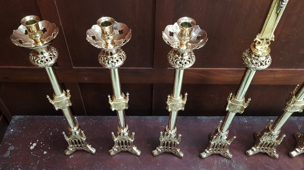 Our product shown on this page Gothic Highly Polished Gold Plated Solid Brass Altar Set Big Six and Crucifix RESERVED is currently available for hire.