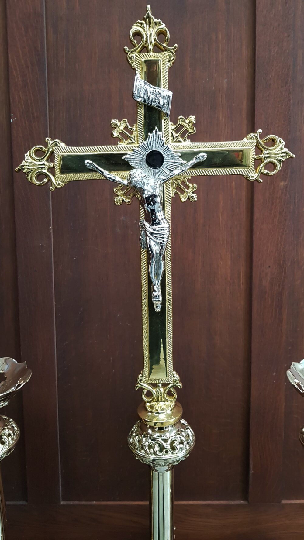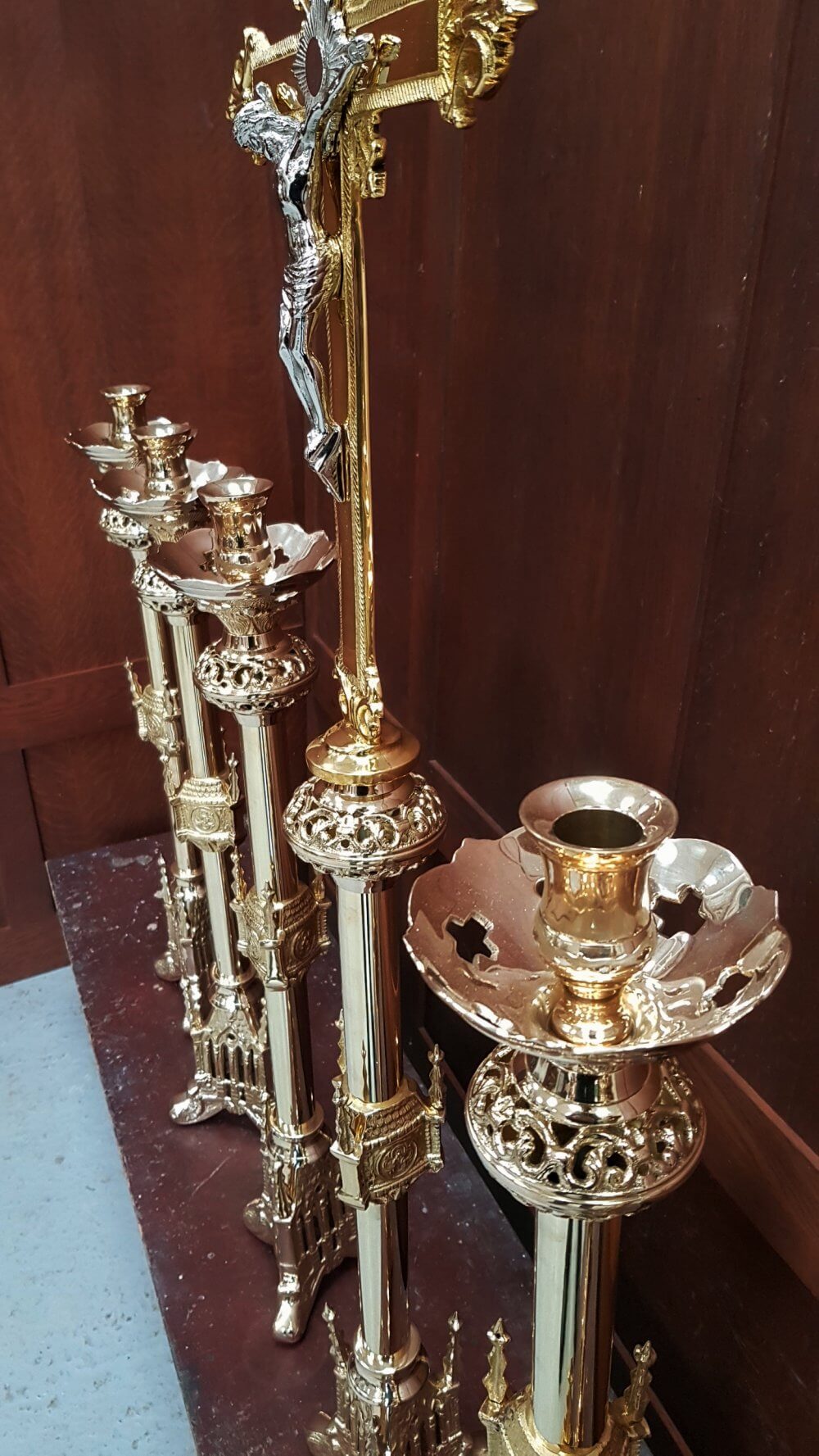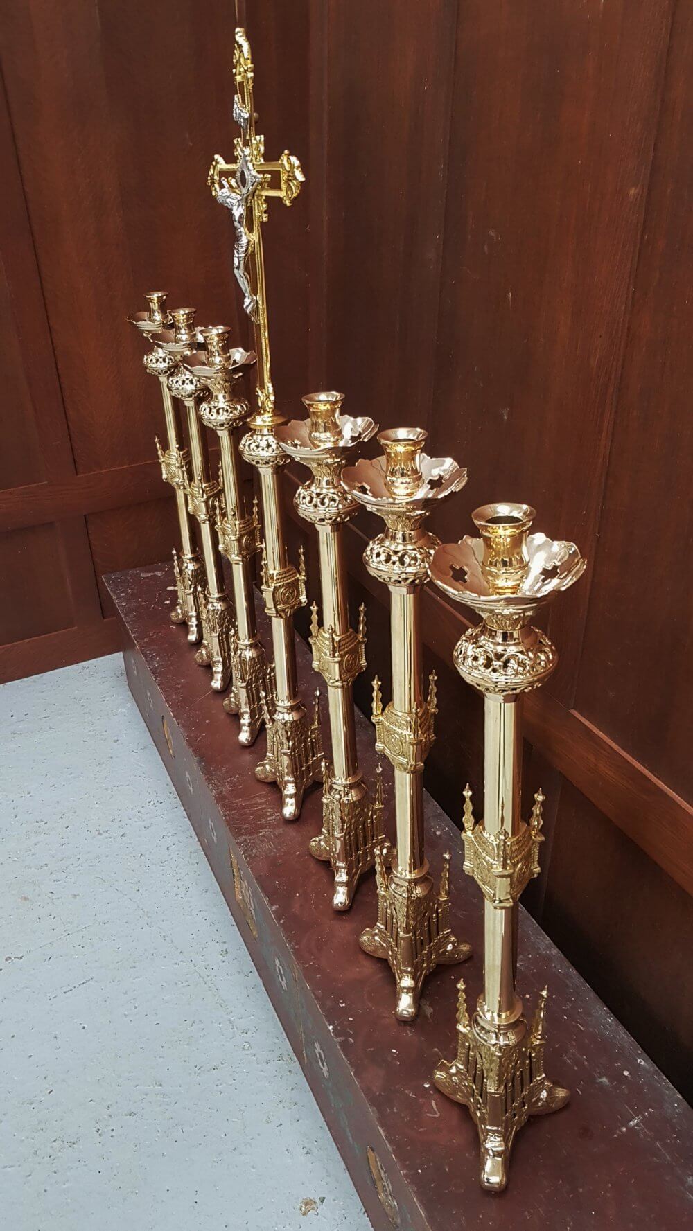 Our product shown on this page Gothic Highly Polished Gold Plated Solid Brass Altar Set Big Six and Crucifix RESERVED is currently available for hire.
