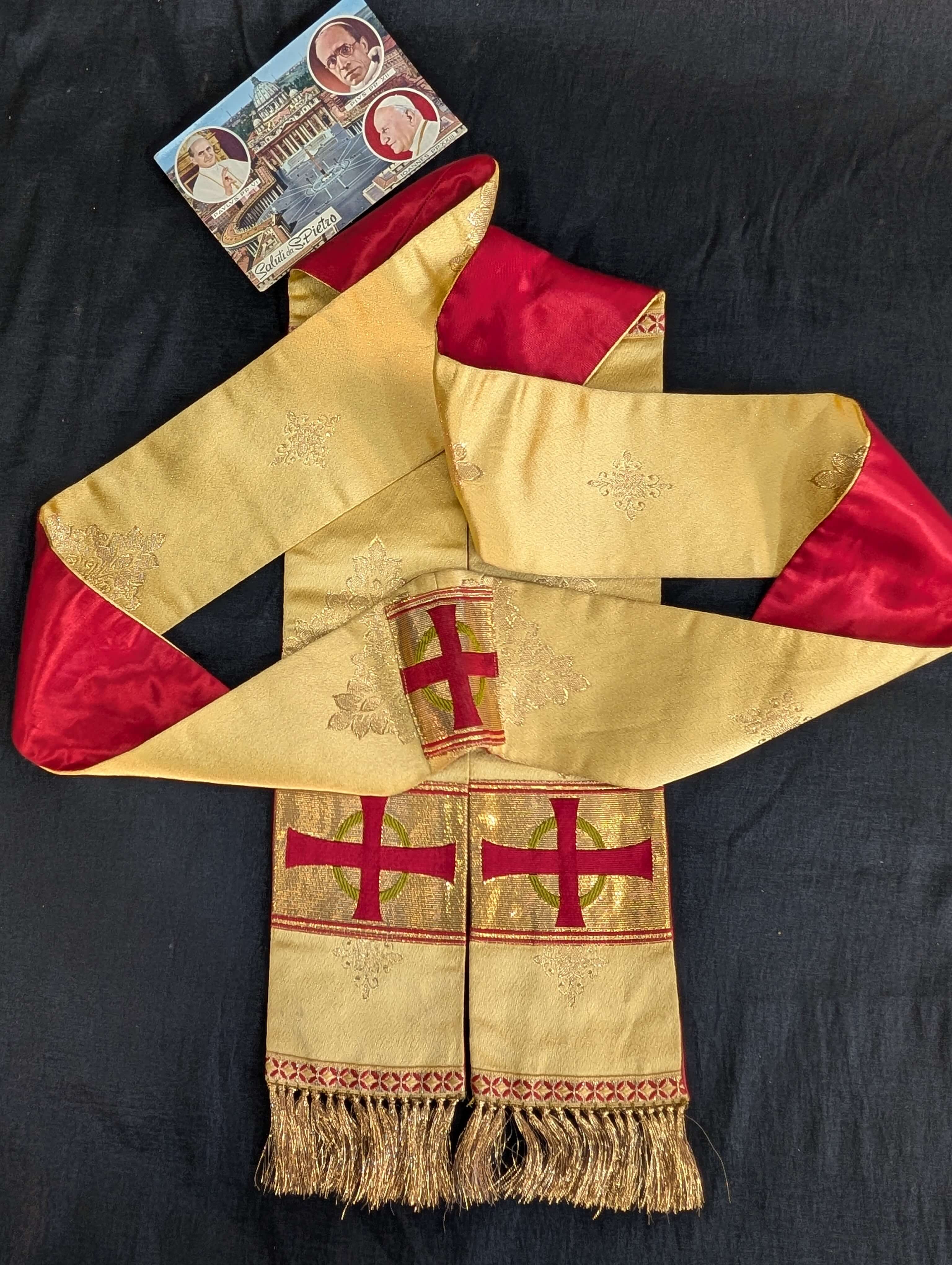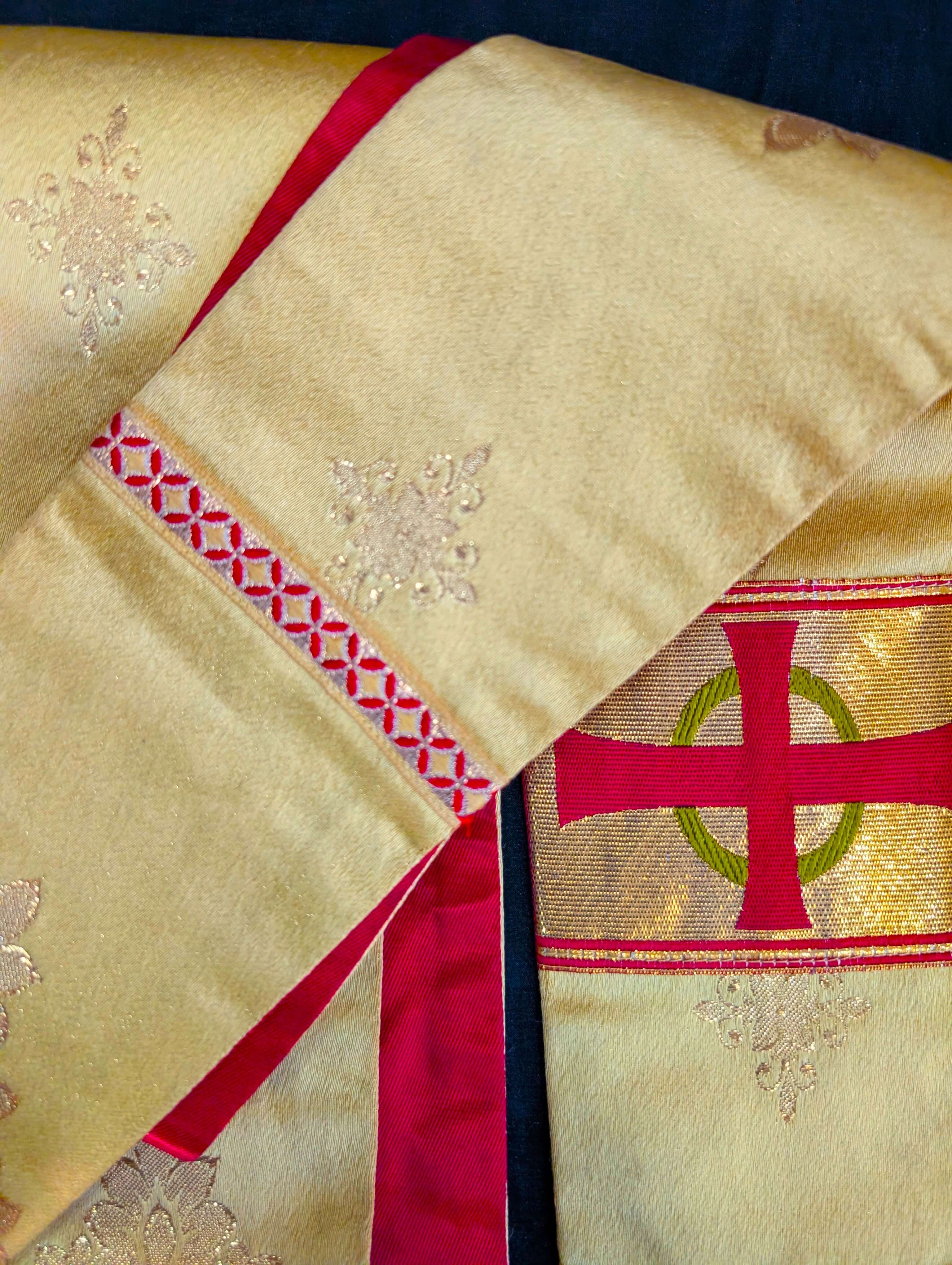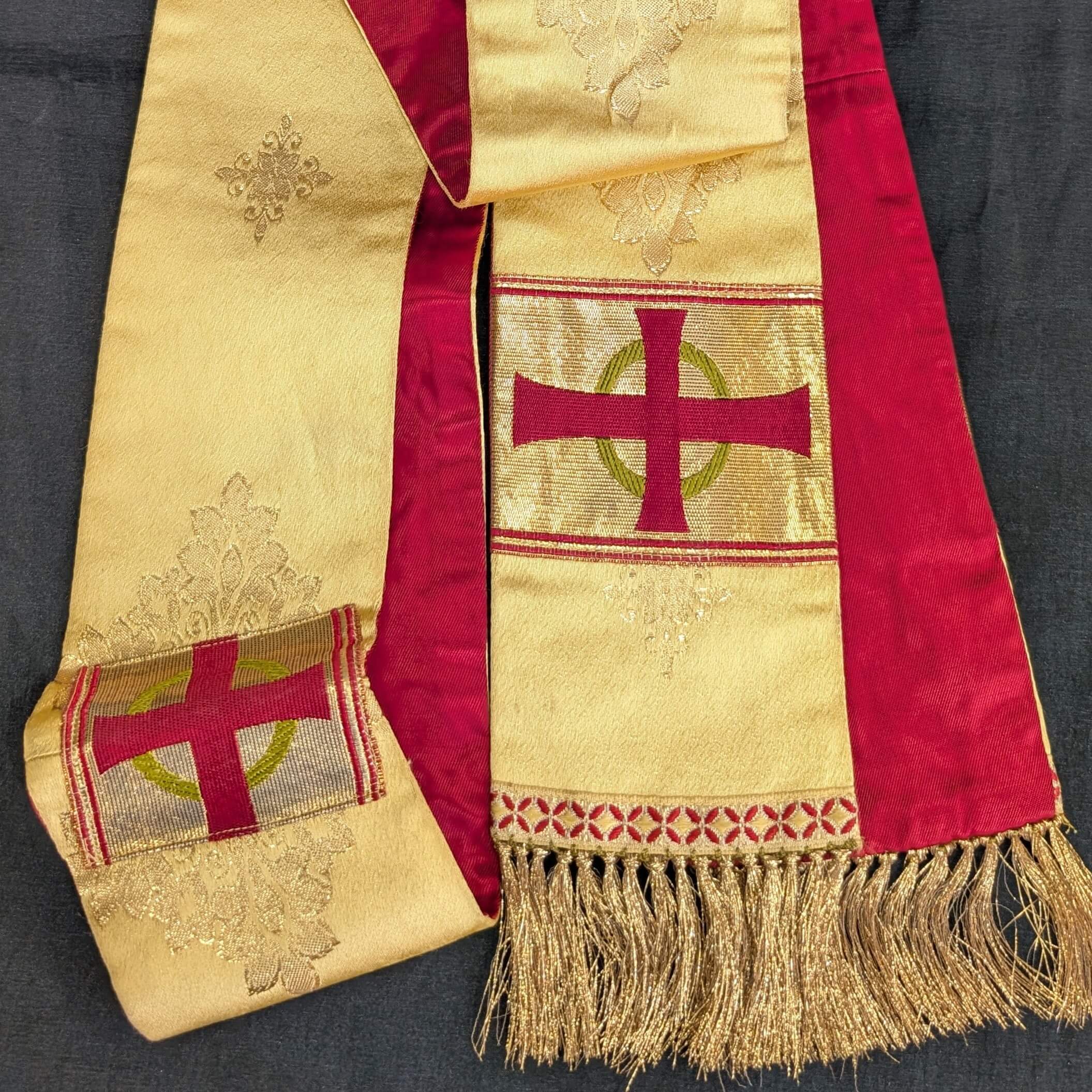Our product shown on this page Grand Gold & Red Lined Stole with Canterbury Style Crosses is currently available for hire.