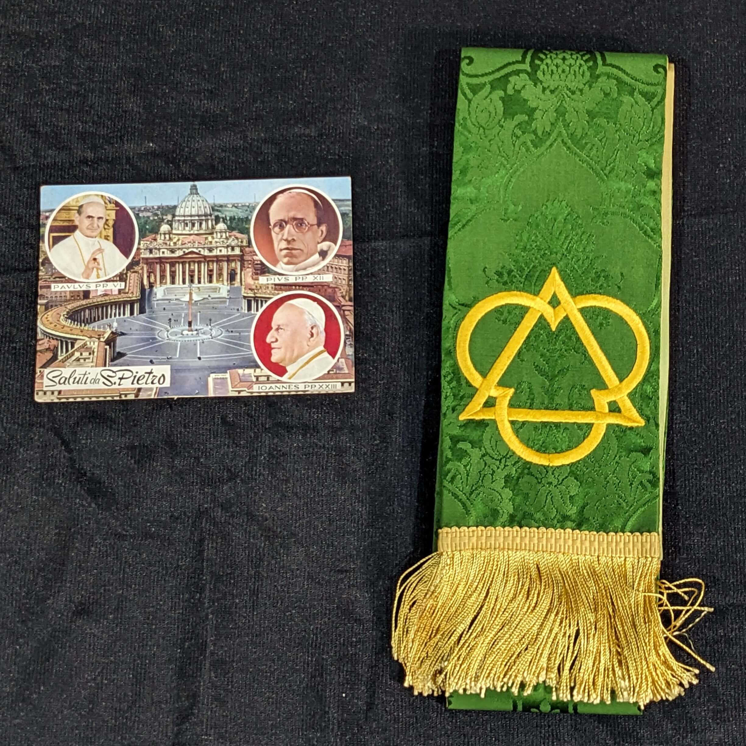 Our product shown on this page Green & Gold Damask Stole with Trinity Pyramid Symbol (SOLD) is currently available for hire.
