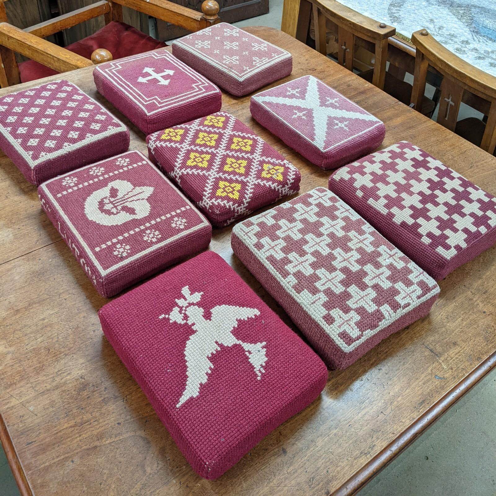 Our product shown on this page Hand Embroidered Burgundy Themed Church Cushions Kneelers Hassocks (SOLD) is currently available for hire.