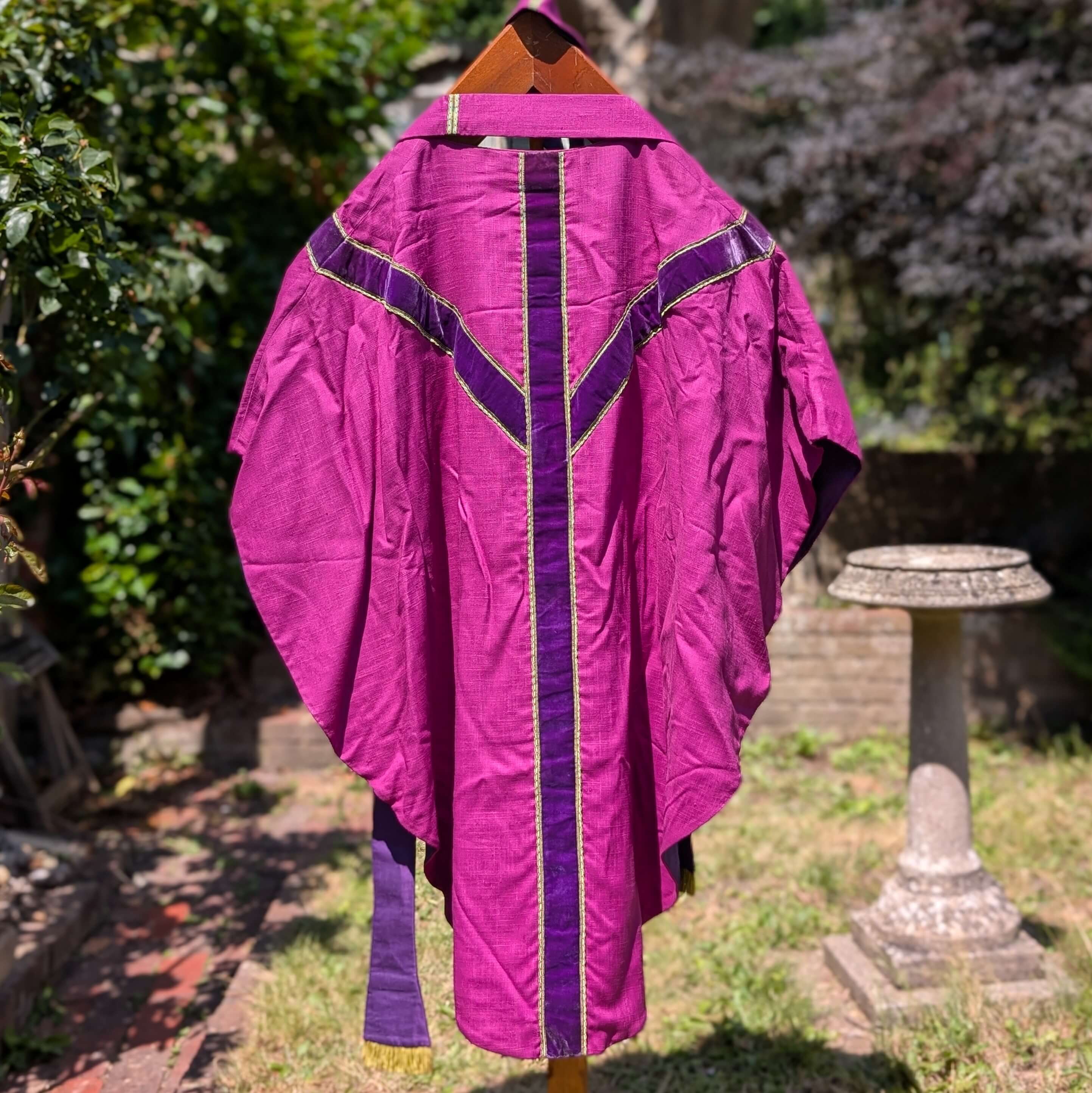 Our product shown on this page Handsome 1950’s Vintage Magenta Linen Purple Velvet Chasuble with Stole (SOLD) is currently available for hire.
