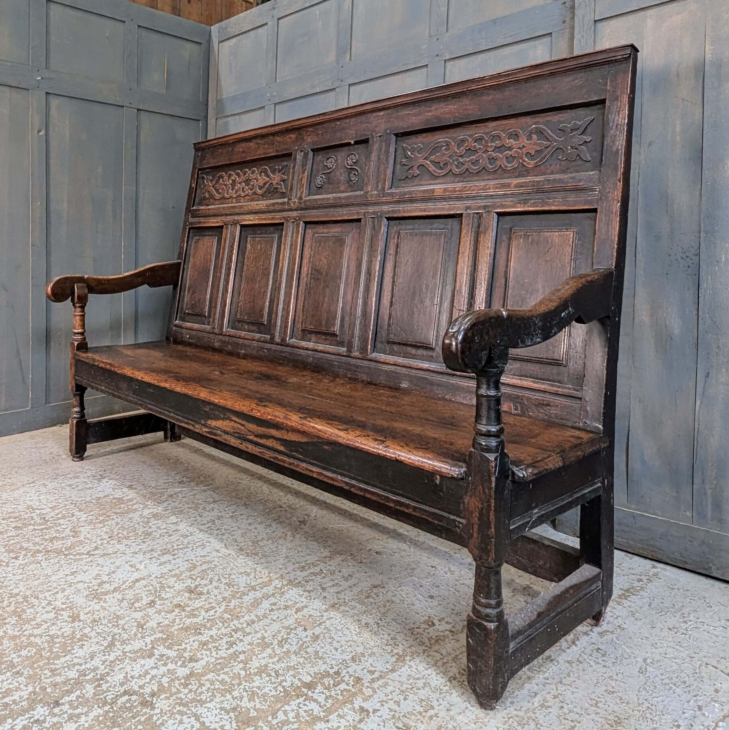 Delivery of this Handsome and Impressive Mid 18th Century Carved Dark Oak Settle Bench is within 1-3 weeks
