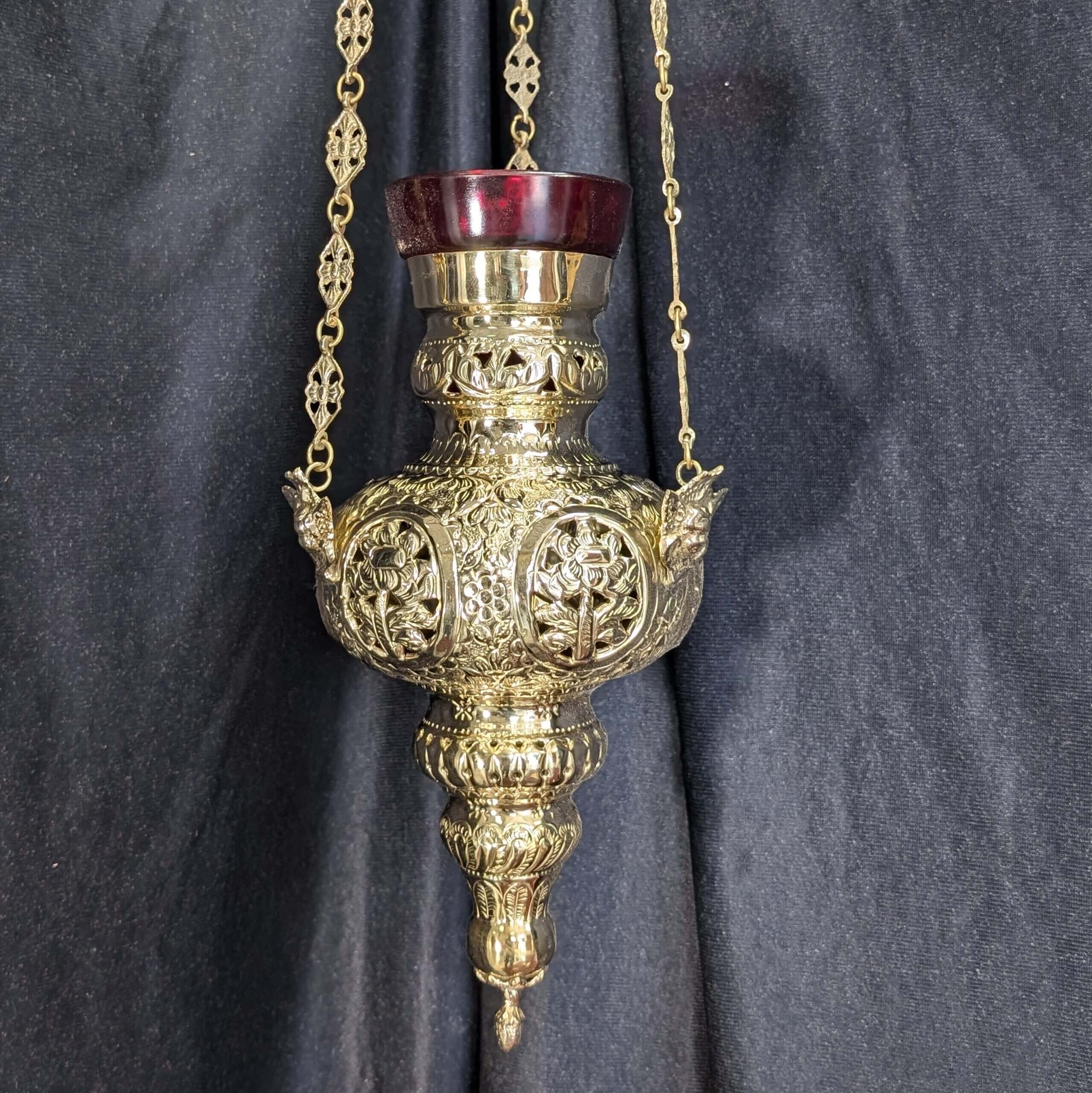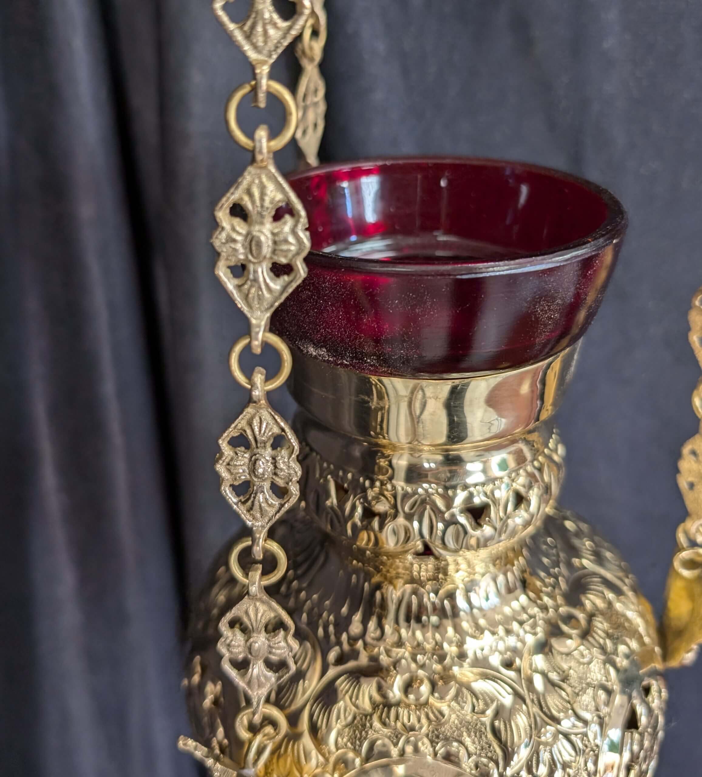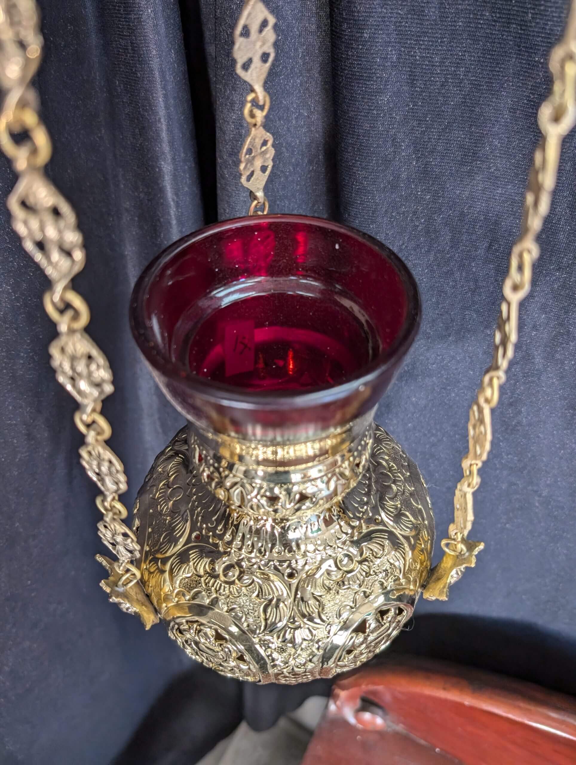 Our product shown on this page Hanging Orthodox Sanctuary Vigil Lamp with Ryasna Patterned Chains & Ruby Glass Holder RESERVED is currently available for hire.