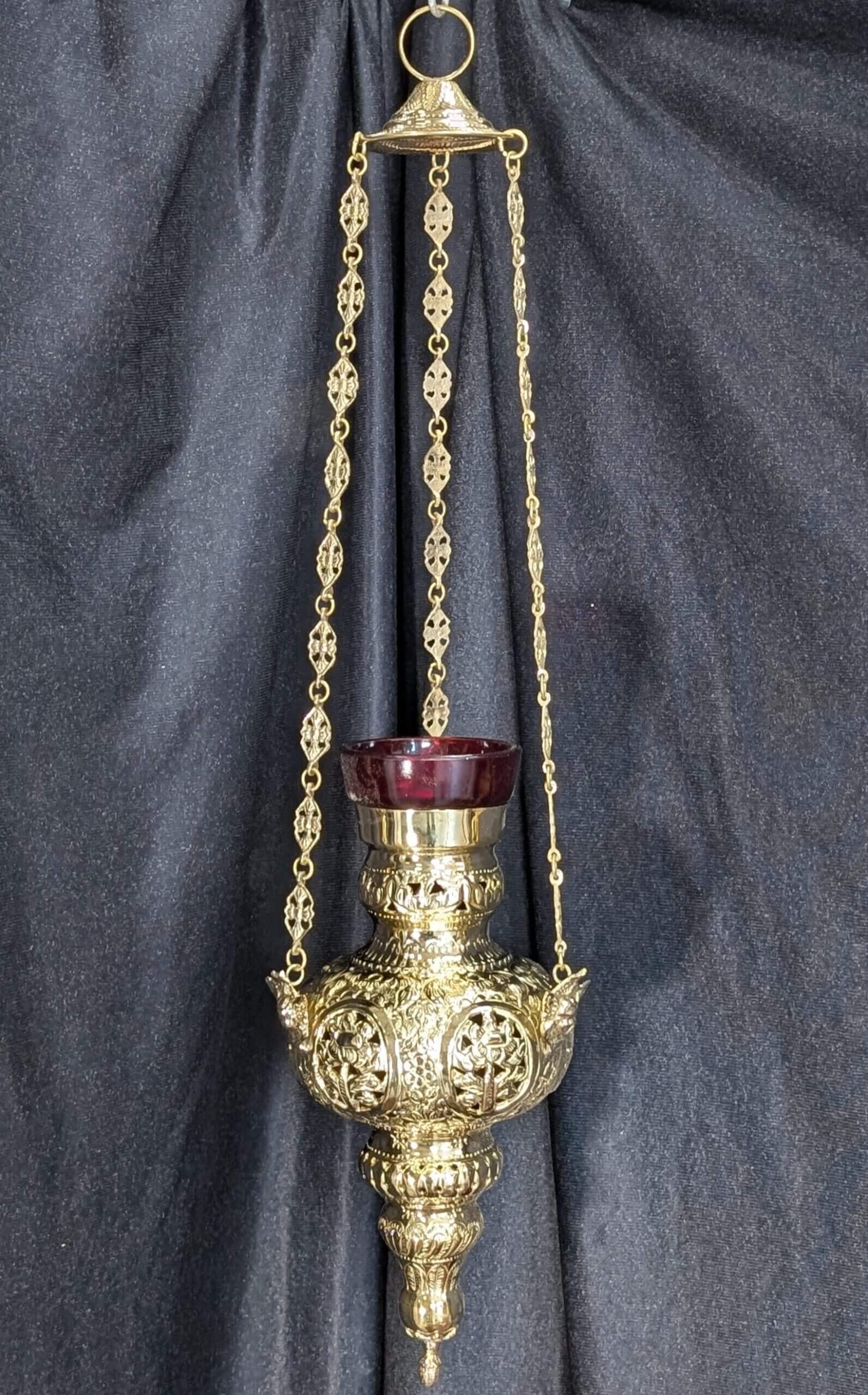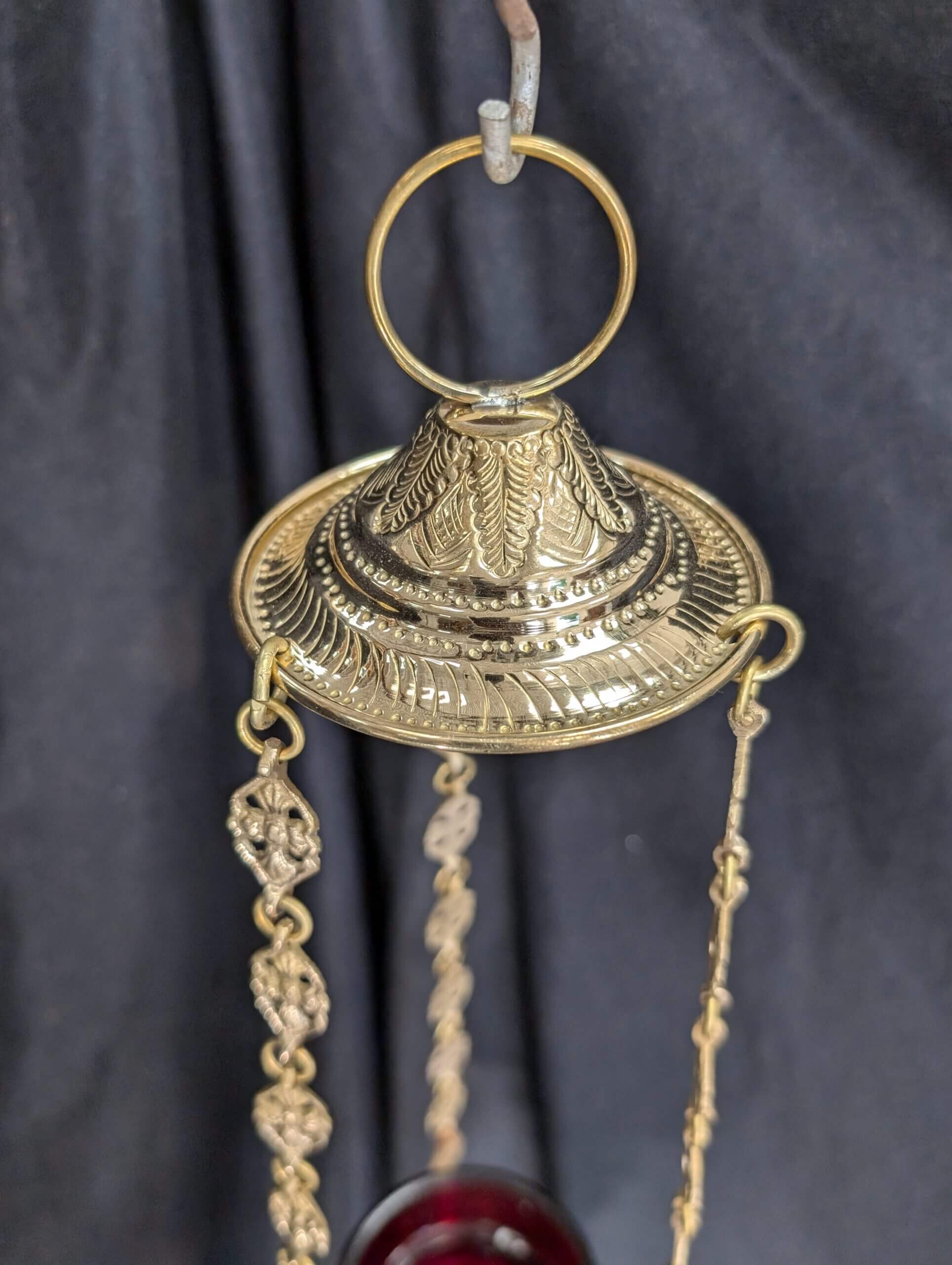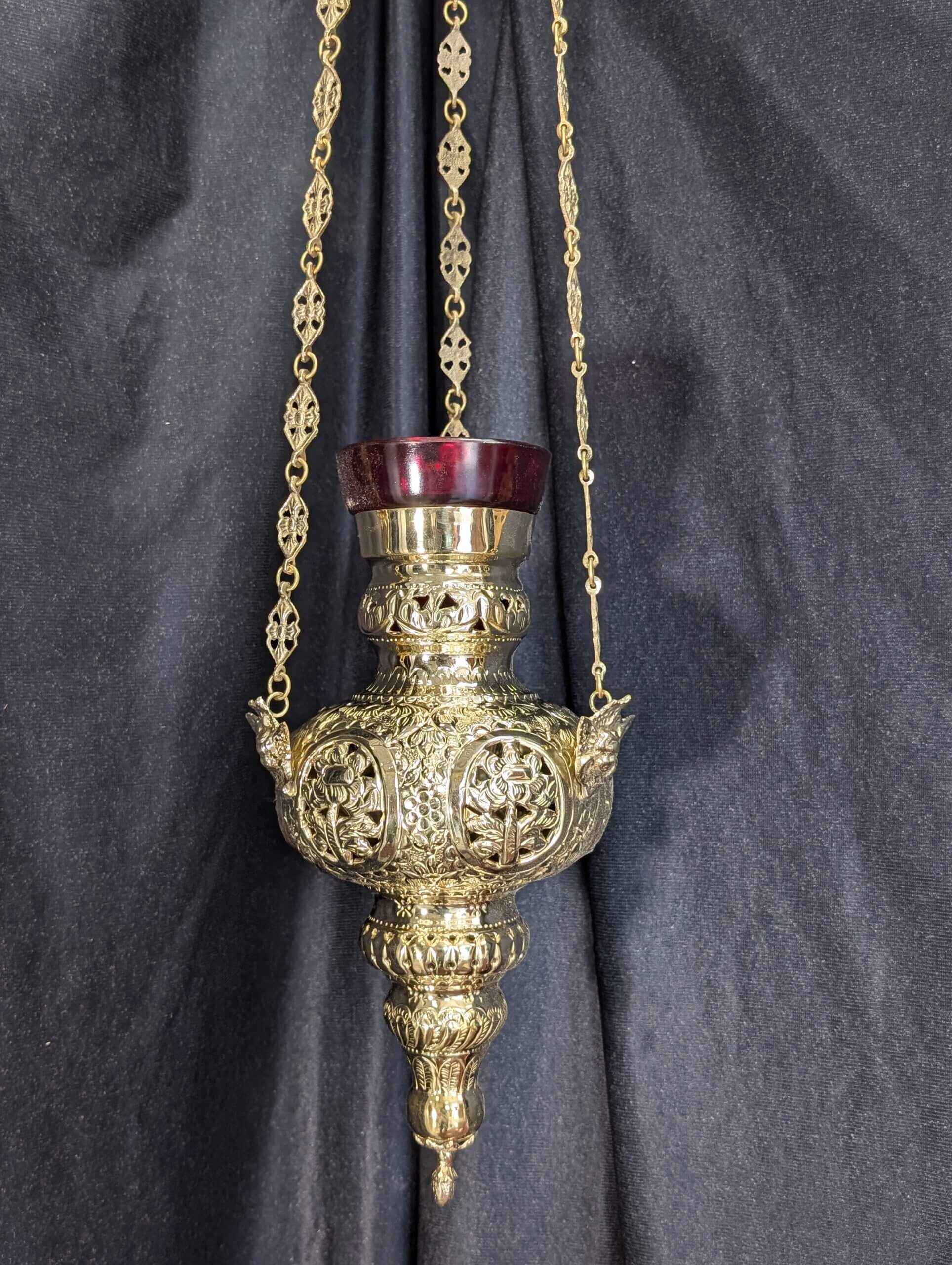 Our product shown on this page Hanging Orthodox Sanctuary Vigil Lamp with Ryasna Patterned Chains & Ruby Glass Holder RESERVED is currently available for hire.