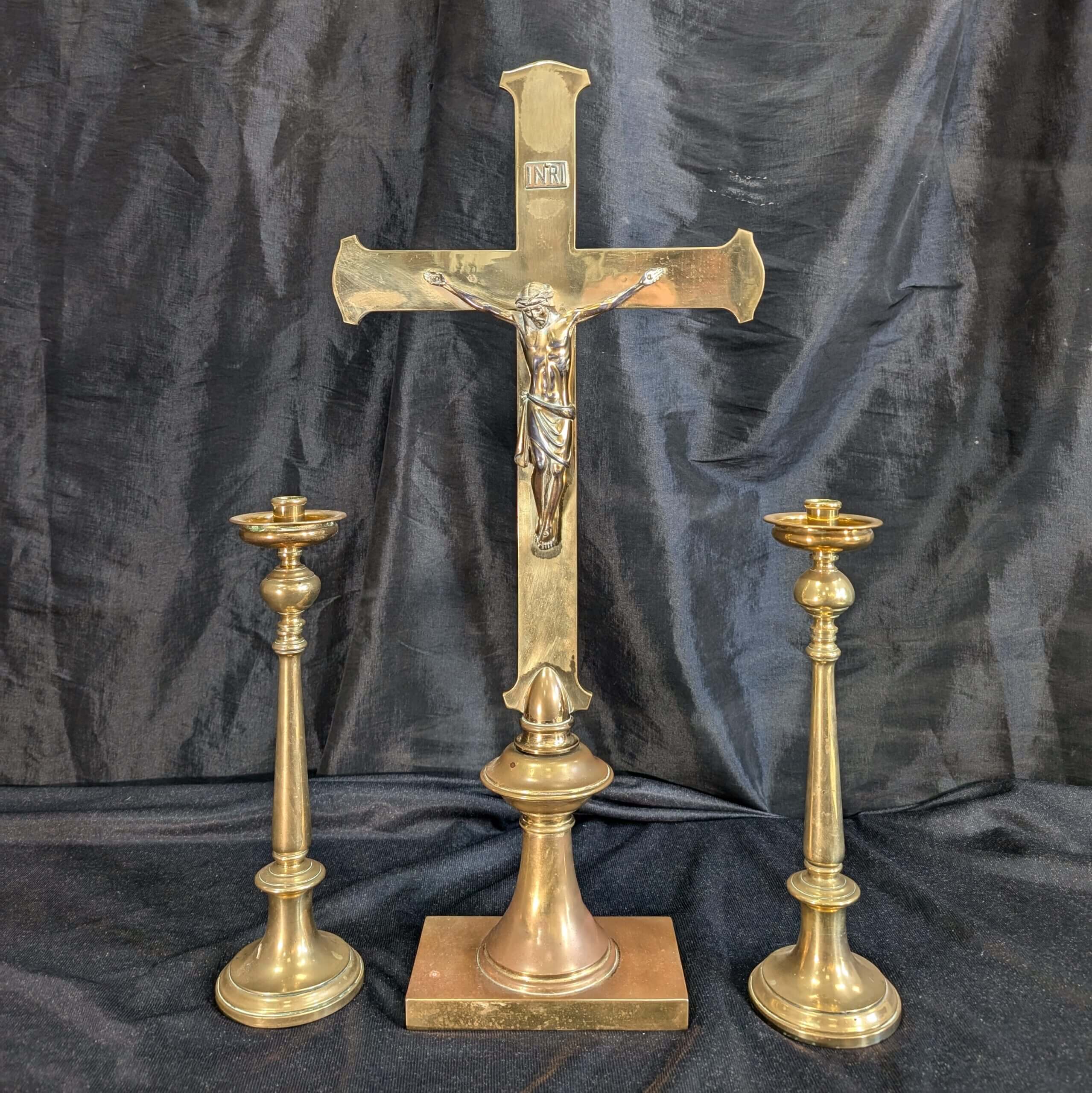 Our product shown on this page Heavy Vintage Brass Church Crucifix & Candlestick Set from St Alban’s RC Derby (SOLD) is currently available for hire.