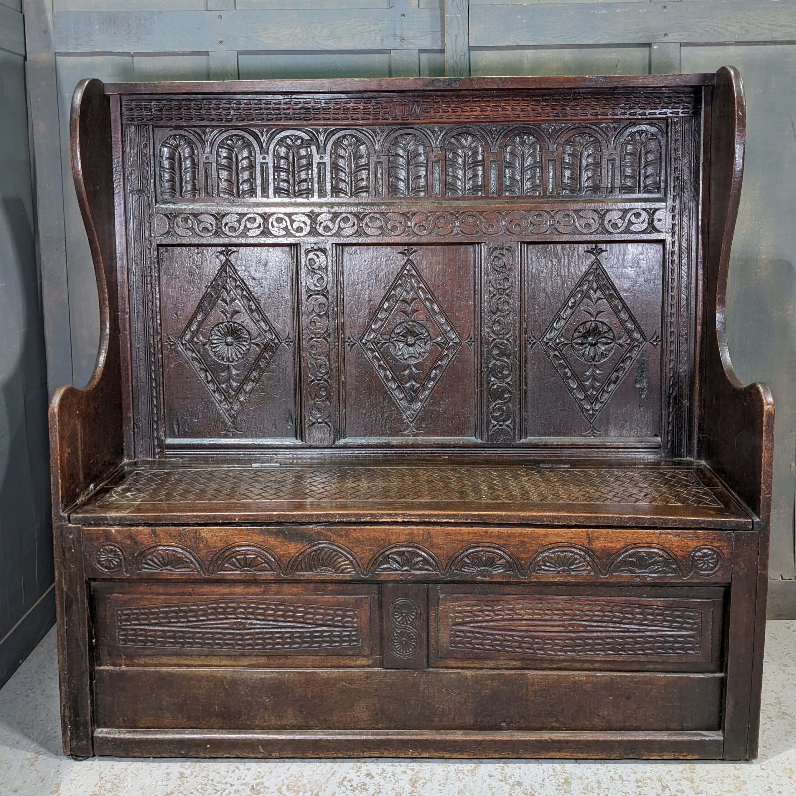 Please Note: Delivery of this High Back Oak Grand Monks Bench Box Settle with 17th Century Elements can take up to 3 weeks for most parts of mainland UK. We will contact you regarding a convenient delivery date.
