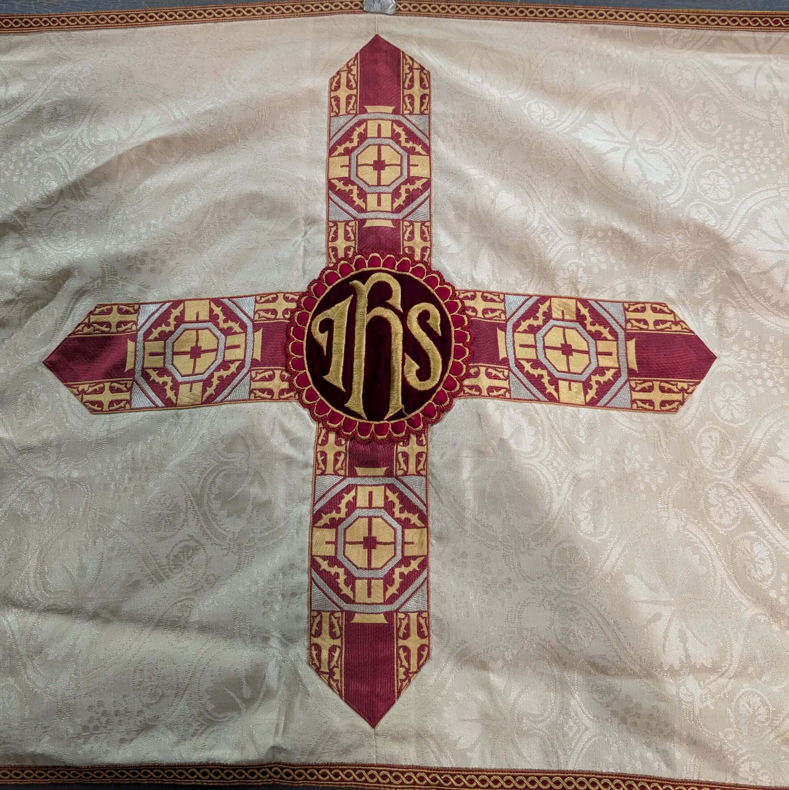 Our product shown on this page Humeral Veil Ivory Damask Silk with Applique Embroidered IHS Roundel & Cross made from Broad Orphreys (SOLD) is currently available for hire.