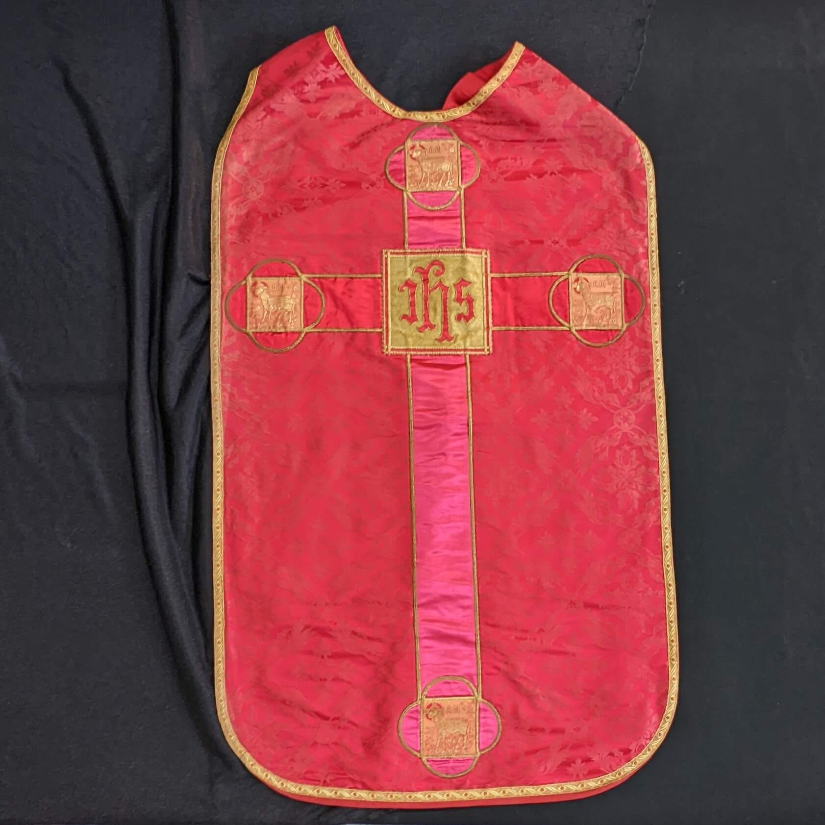 Our product shown on this page Interesting 1930’s Vintage Deep Red Damask ‘Lamb of God’ Roman Chasuble (SOLD) is currently available for hire.
