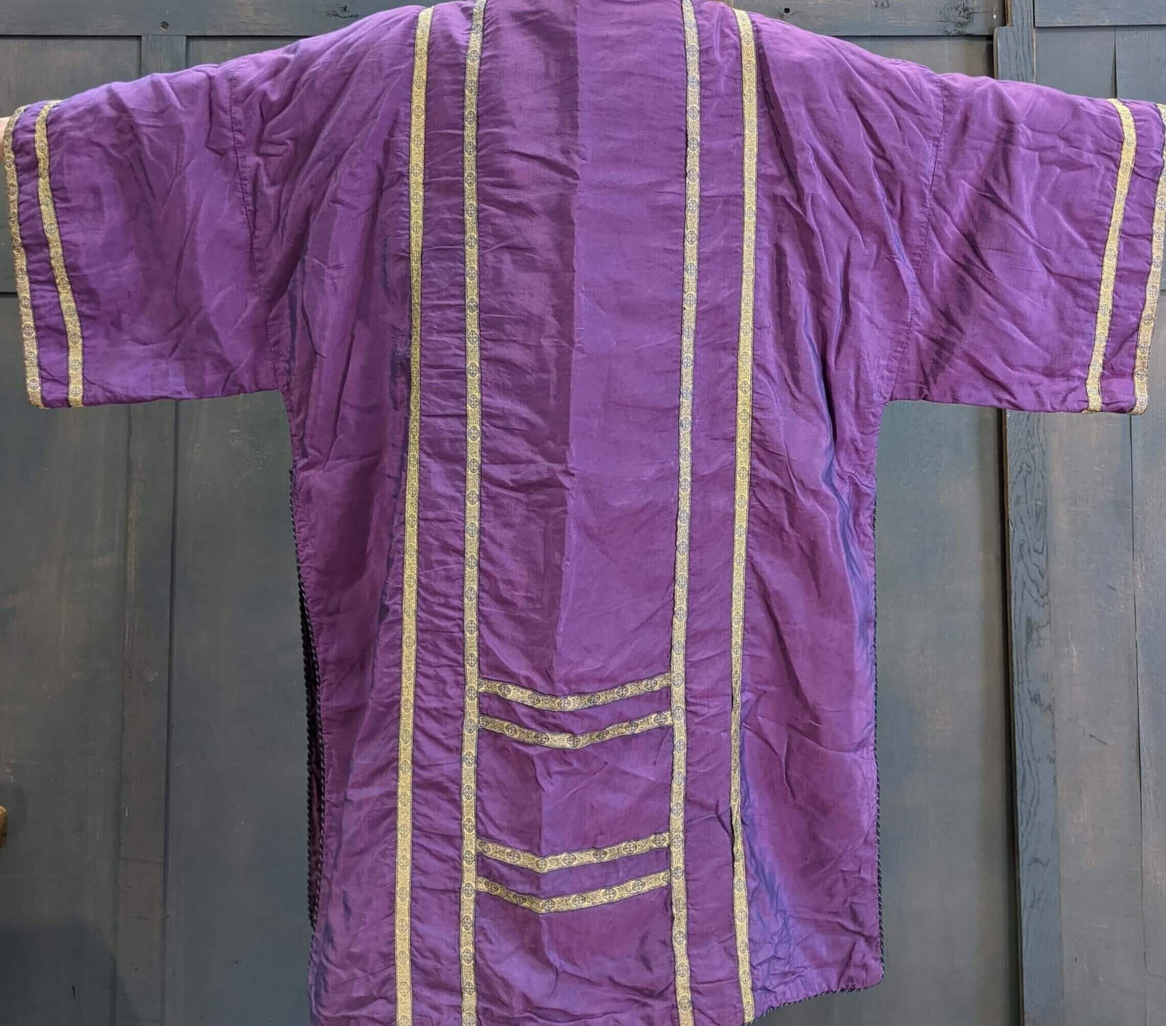 Our product shown on this page Iridescent Purple Silk Dalmatic with Blue Gold Orphreys (SOLD) is currently available for hire.
