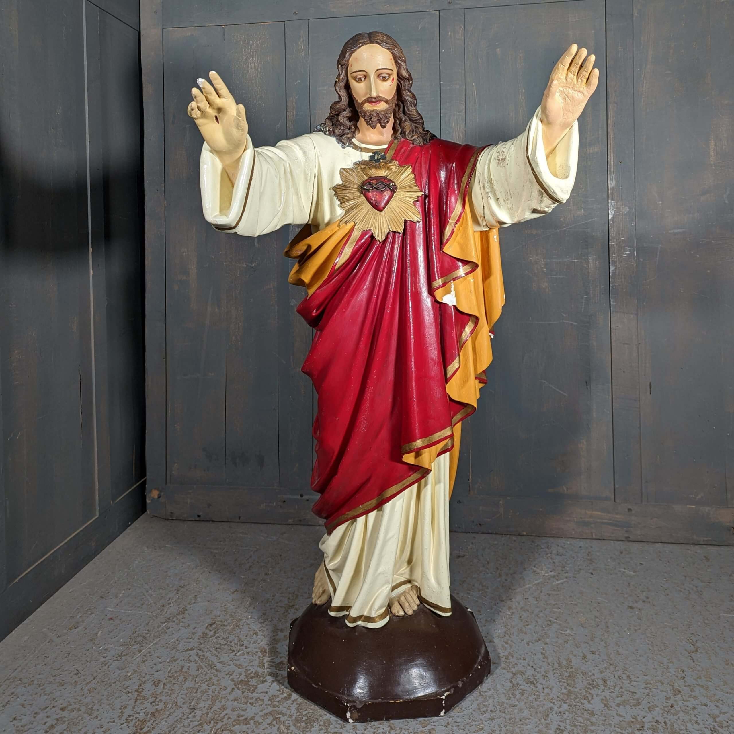 Our product shown on this page Large Antique Sacred Heart Religious Statue Christ the Redeemer with Glass Eyes (SOLD) is currently available for hire.