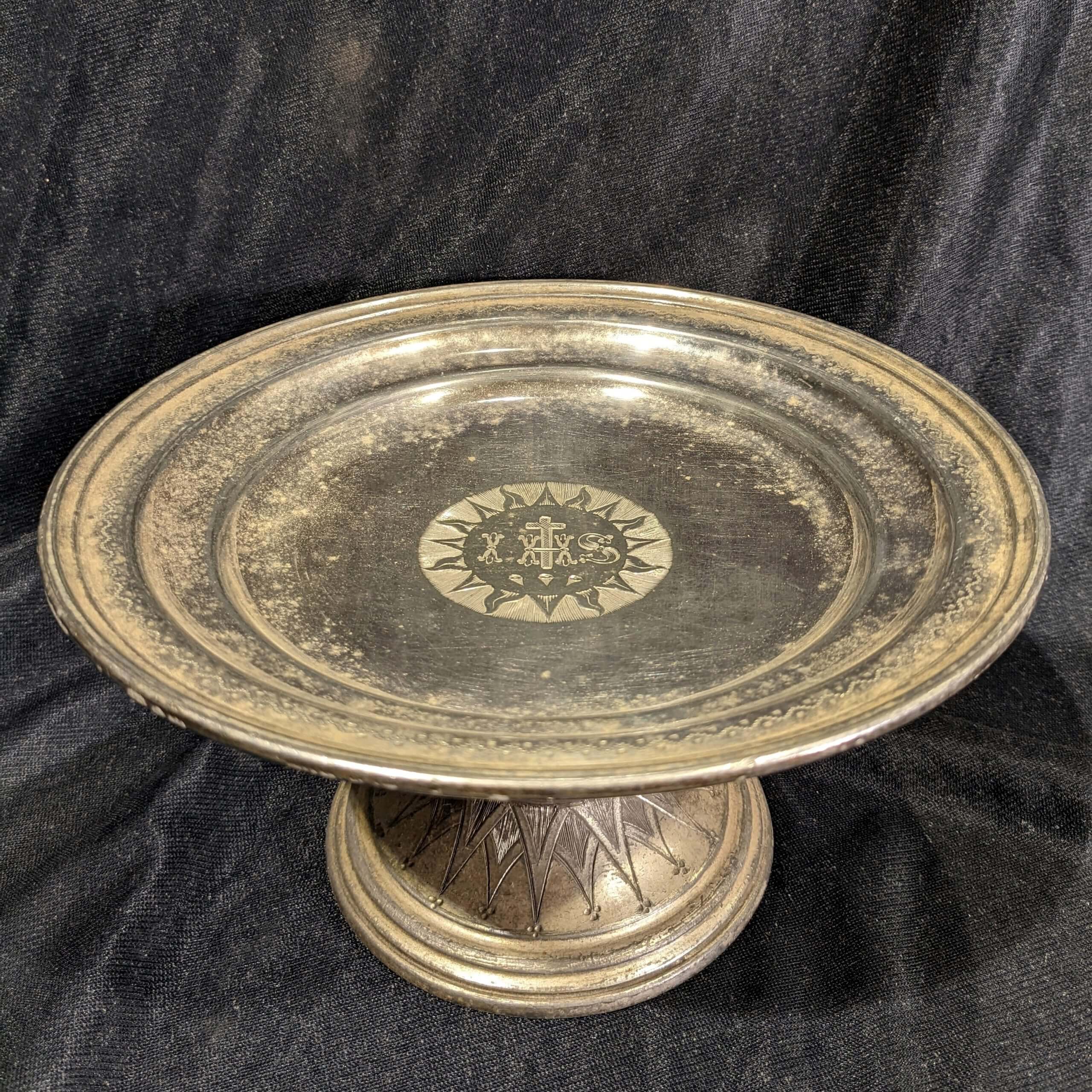 Our product shown on this page Large Antique Silver Plate Paten on Stand from St Teilo’s Cardiff (SOLD) is currently available for hire.