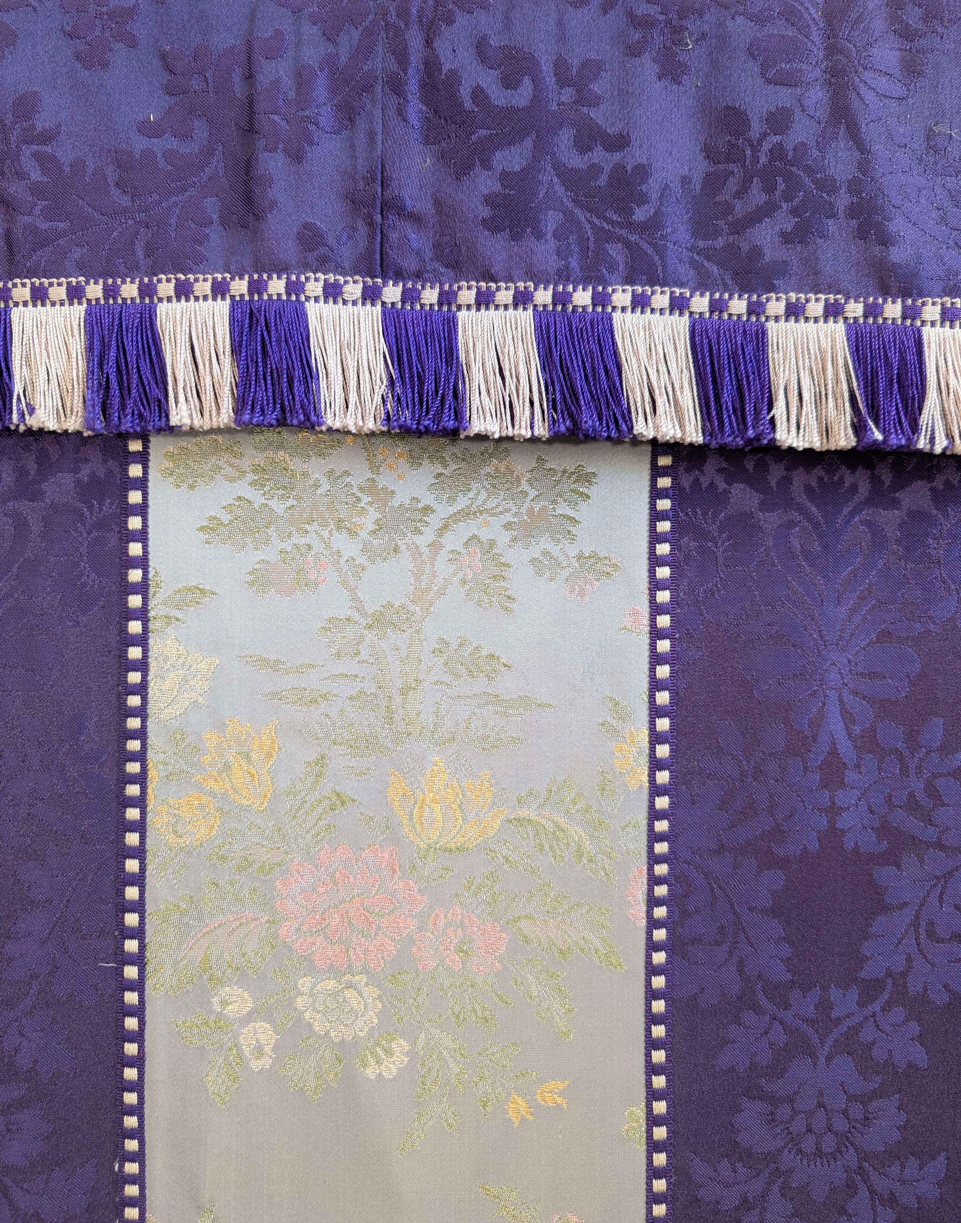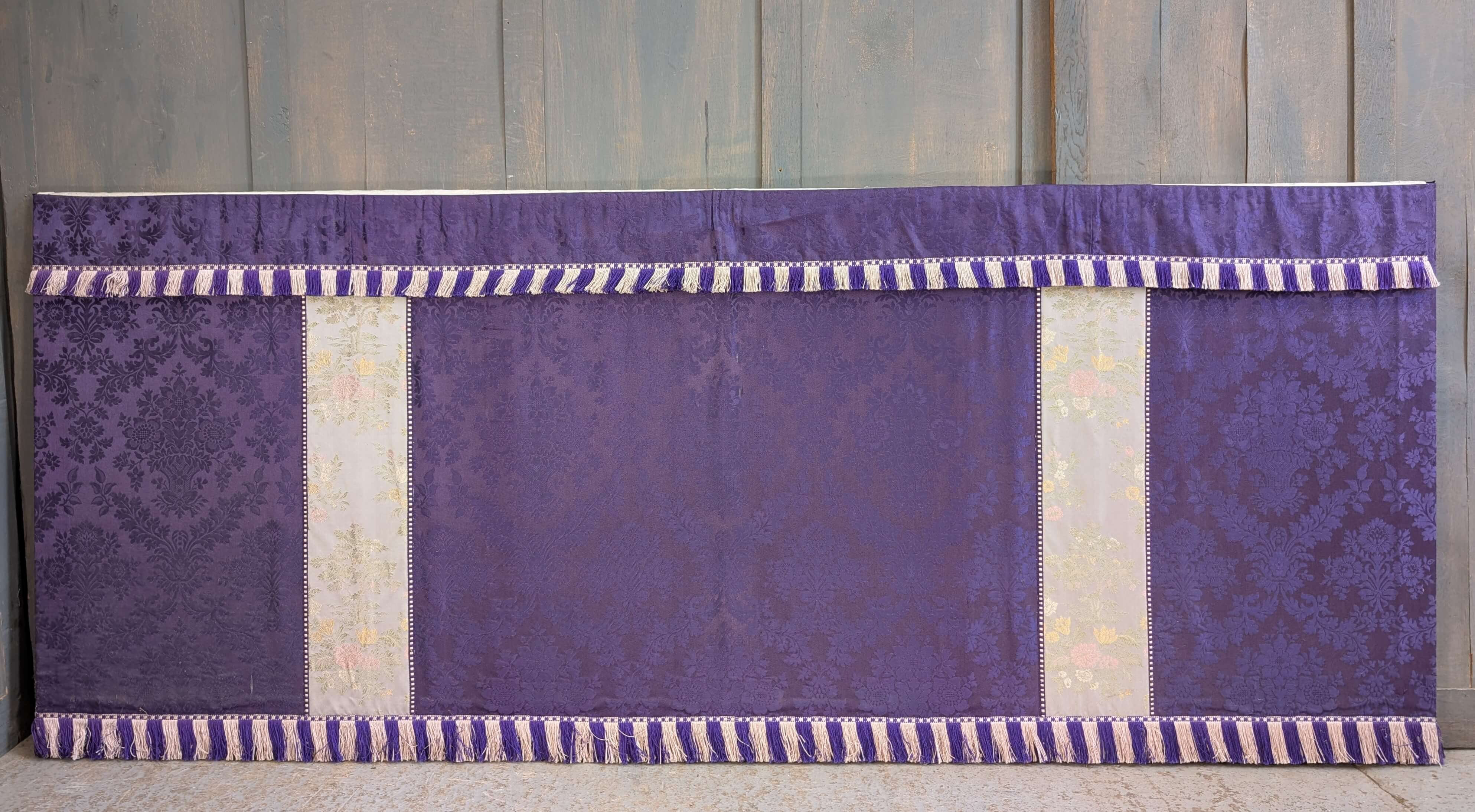 Our product shown on this page Large Purple Damask Silk Altar Frontal with Fringing & Floral Panels is currently available for hire.