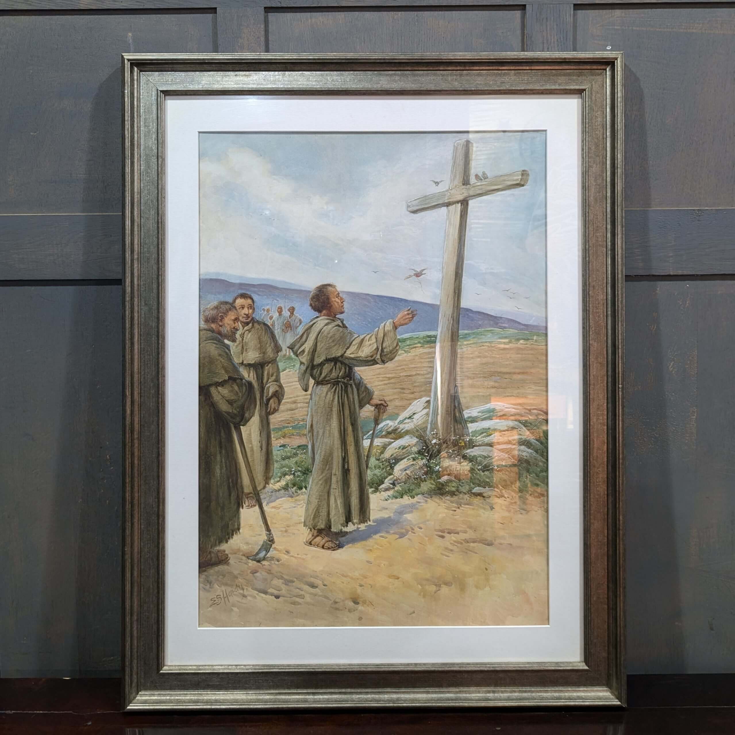 Our product shown on this page Large Religious Watercolour by Evelyn Stuart Hardy 1865-1935 Iona Monks Visiting a Cross (SOLD) is currently available for hire.